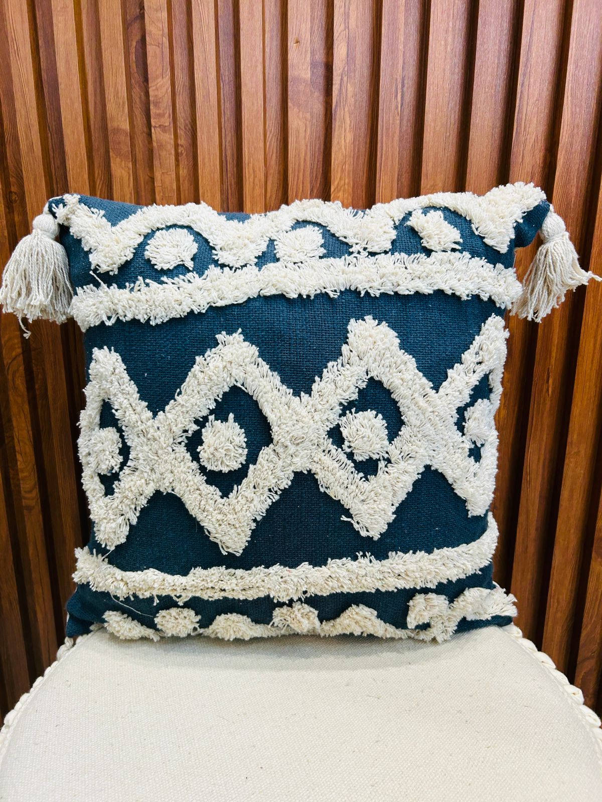 Blue Tassle Boho Jute Cotton Cushion Cover