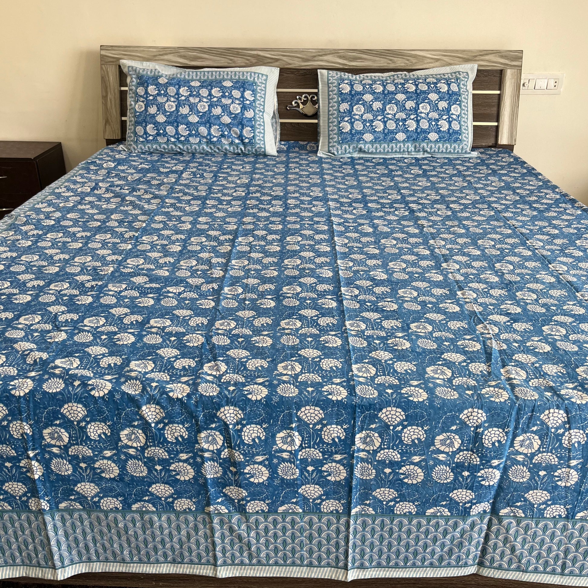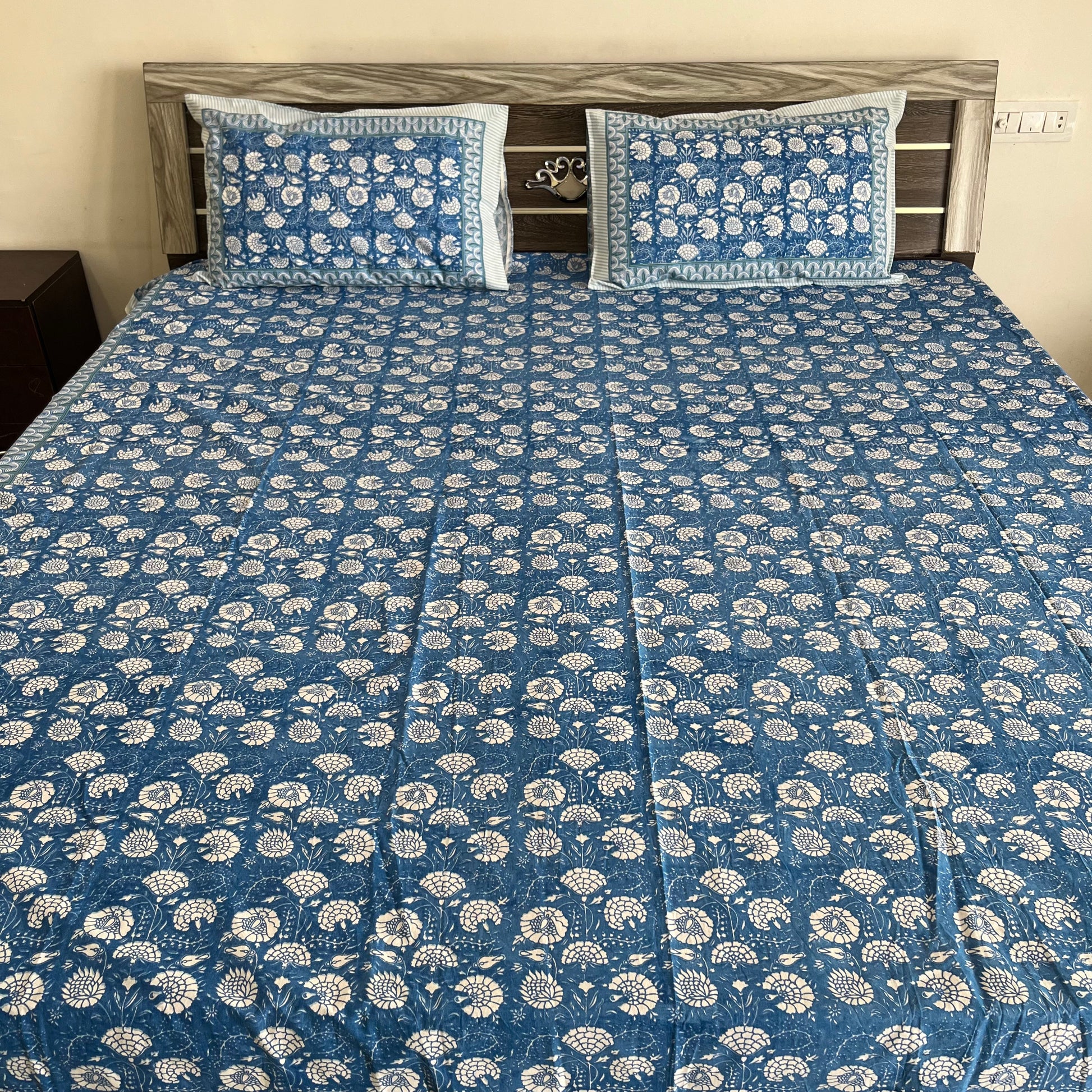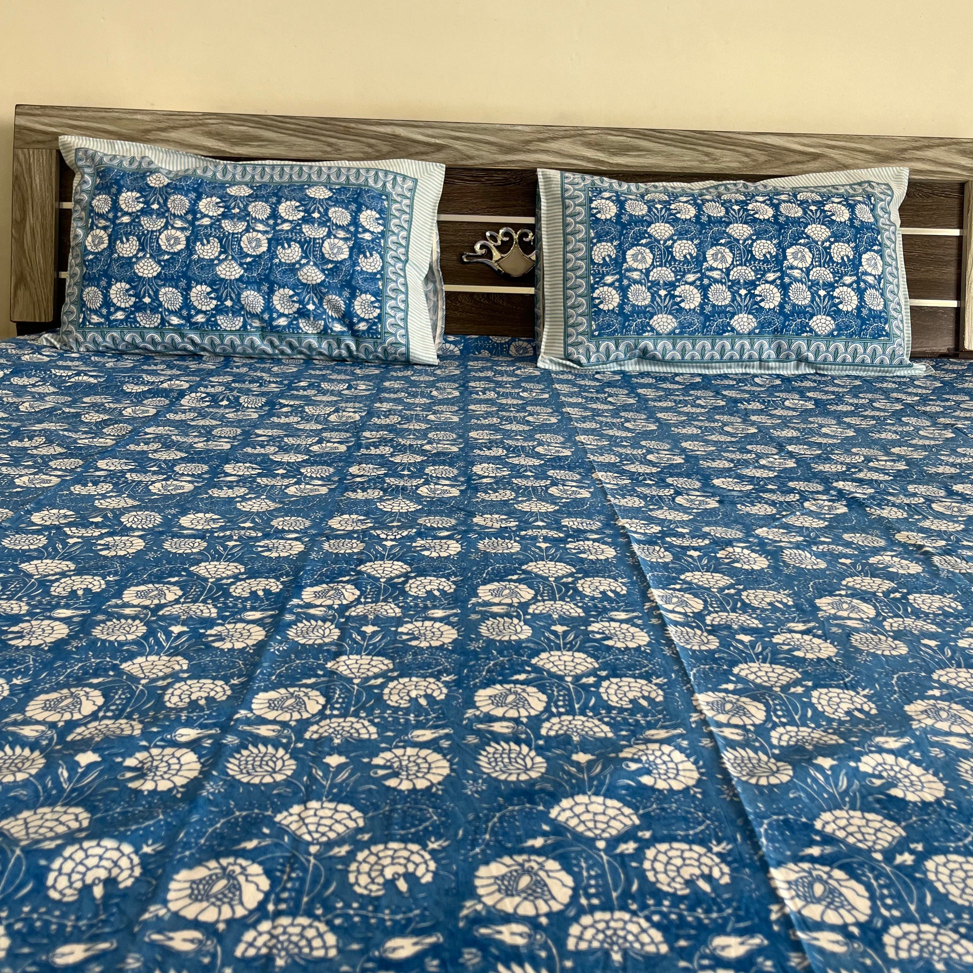 Blue & White Floral Motifs Handblock Cotton Bedsheet