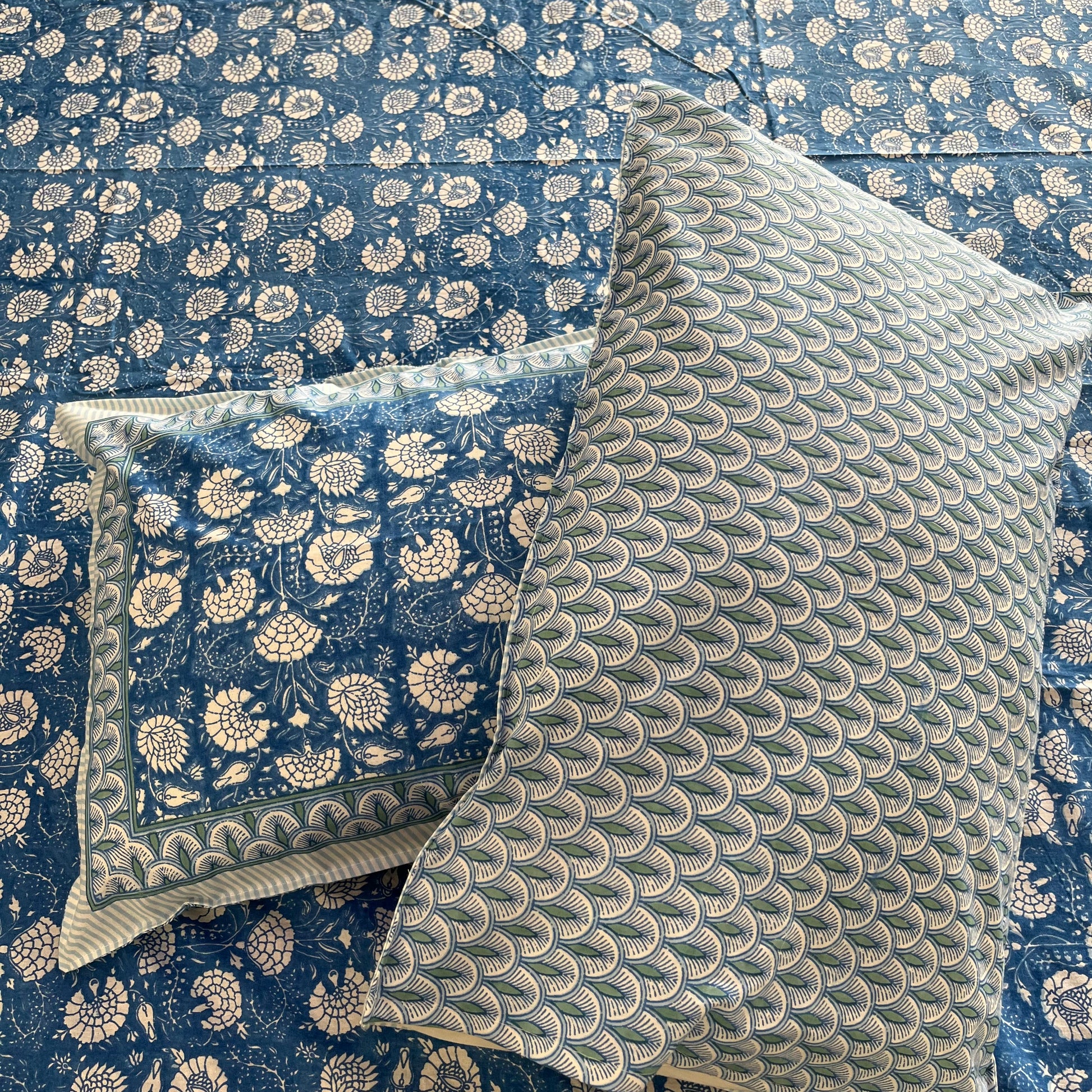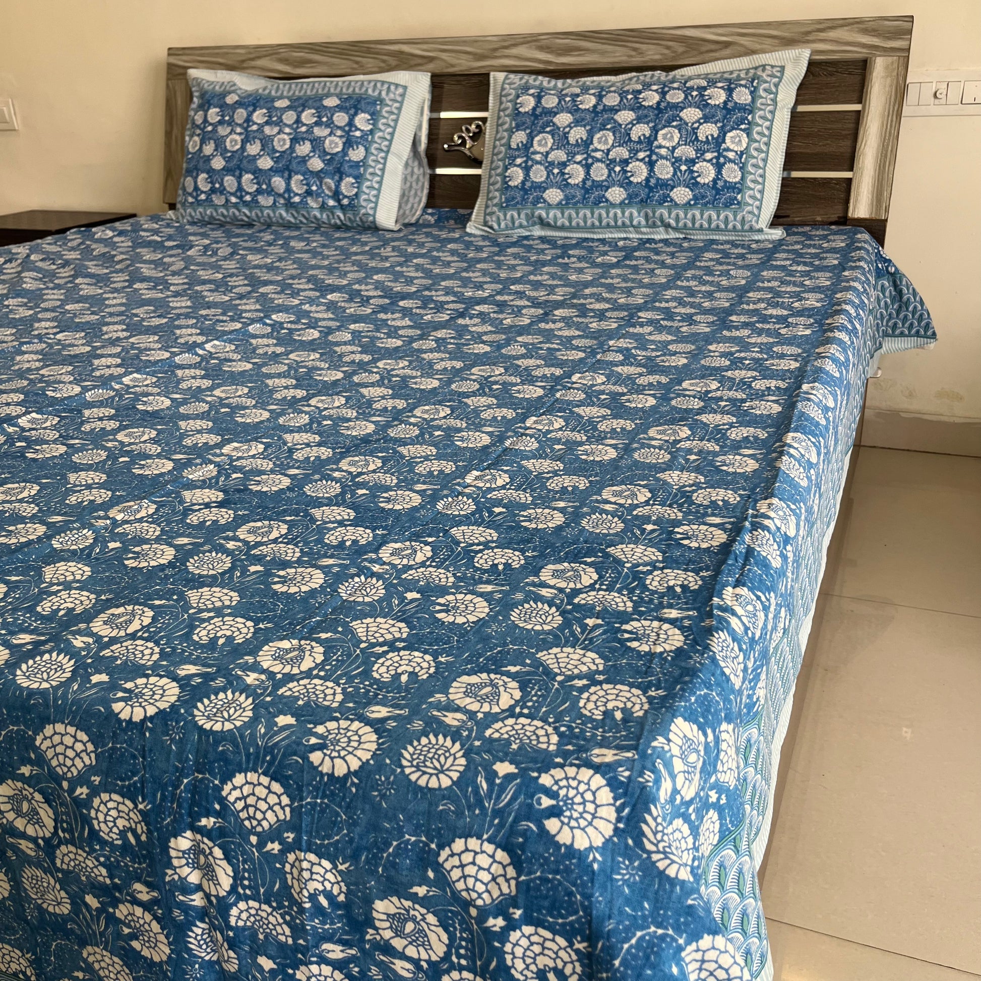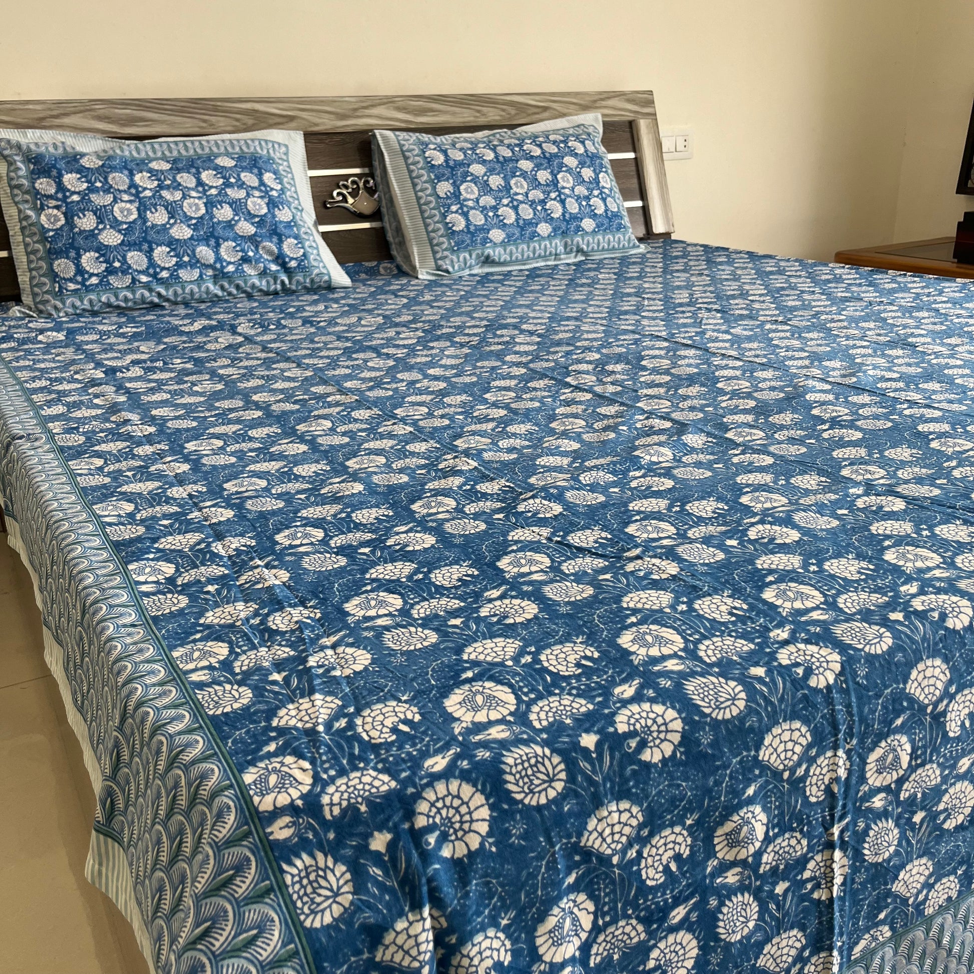 Blue & White Floral Motifs Handblock Cotton Bedsheet