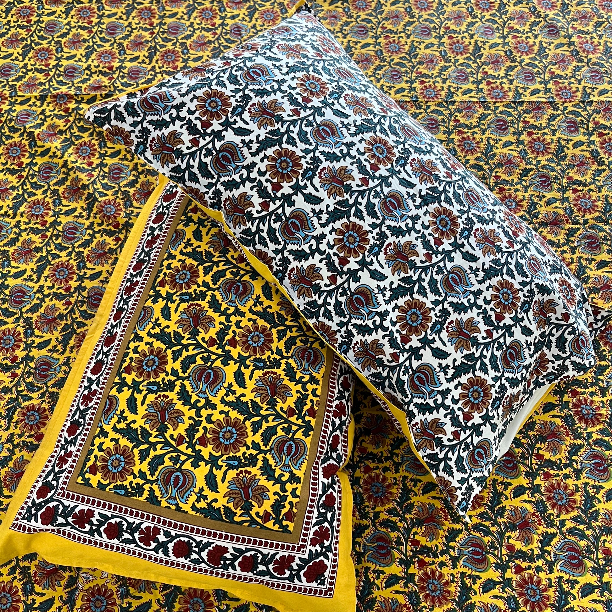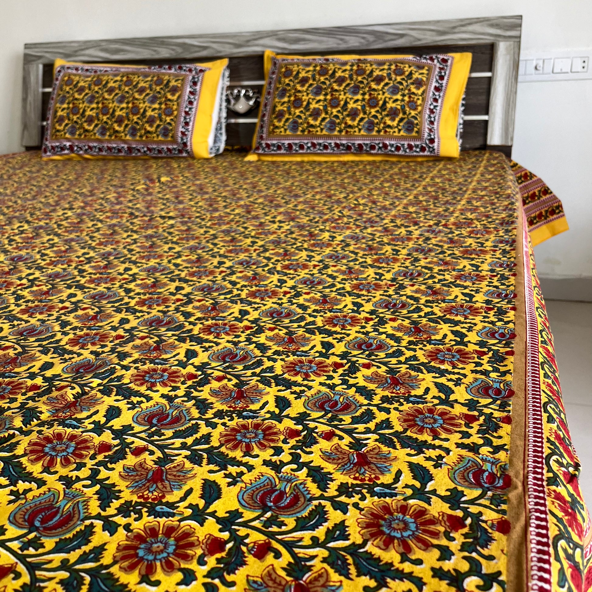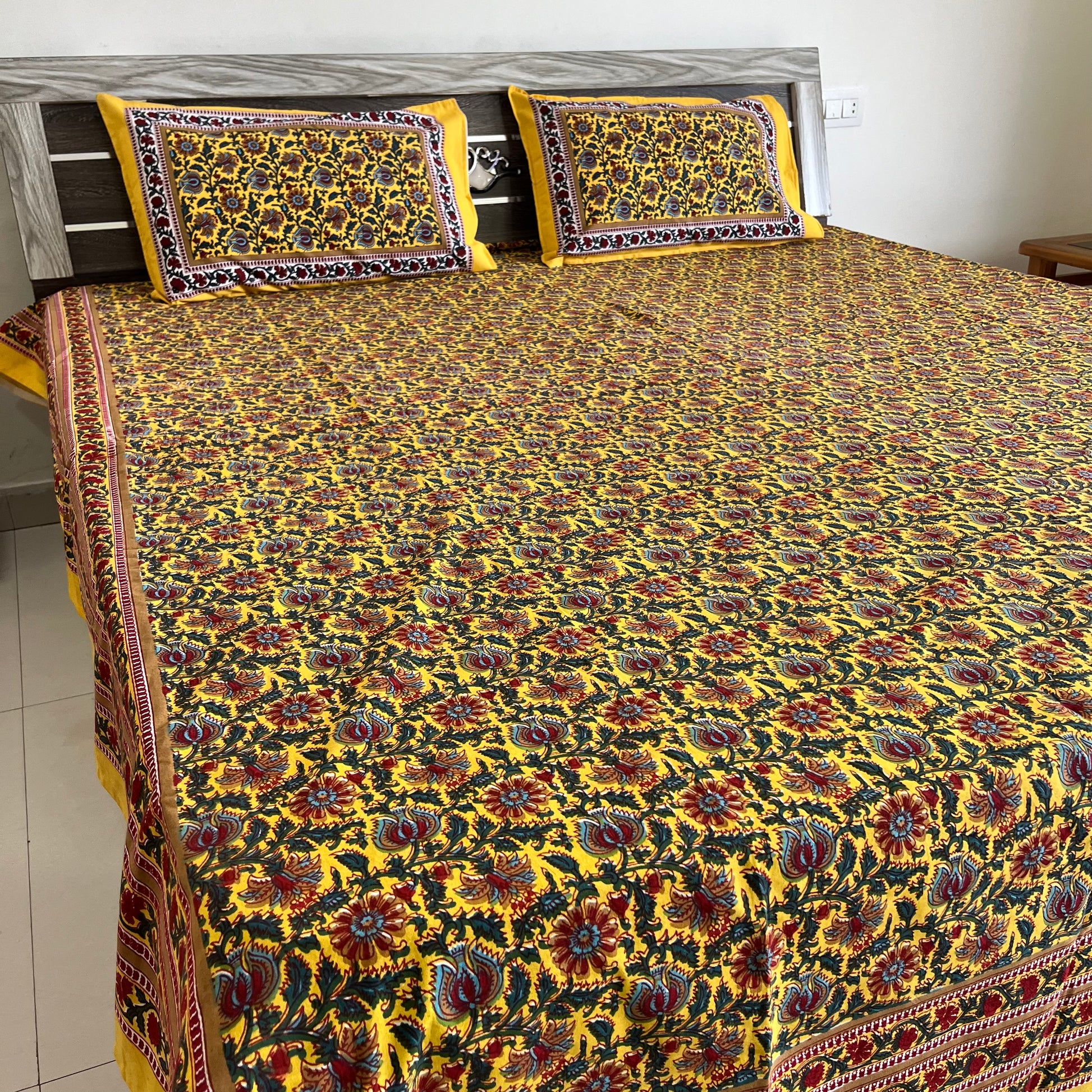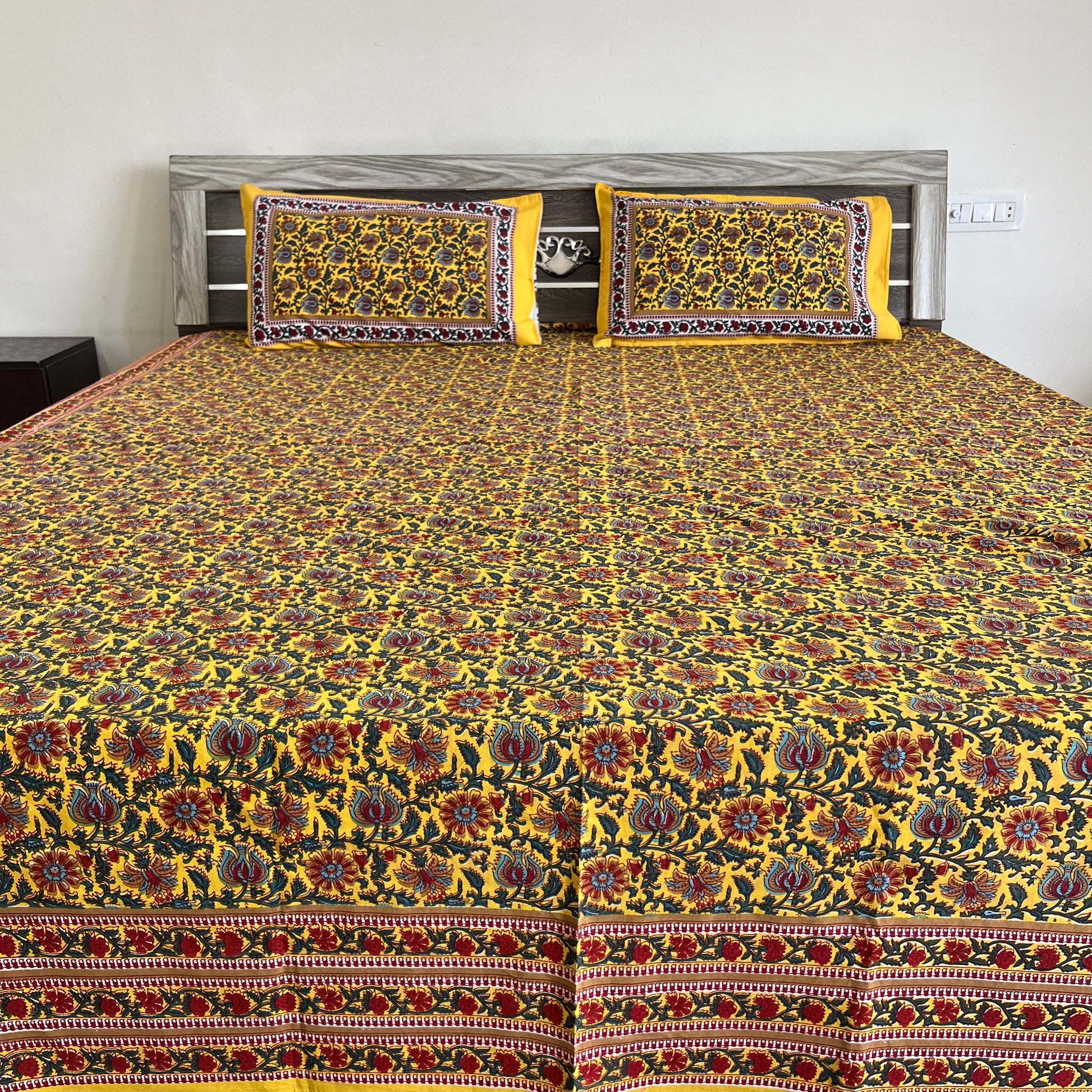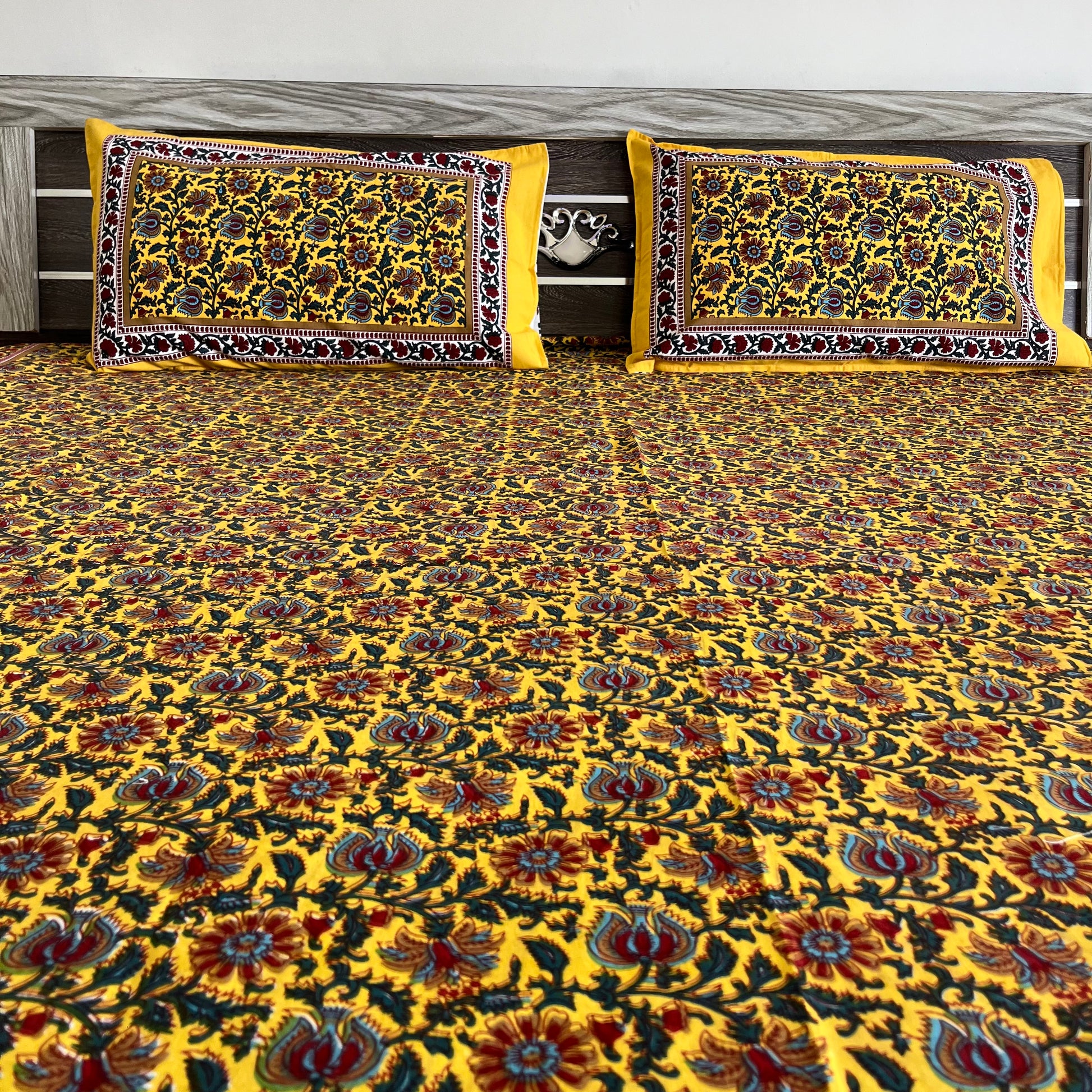Bright Yellow Floral Handblock Cotton Bedsheet