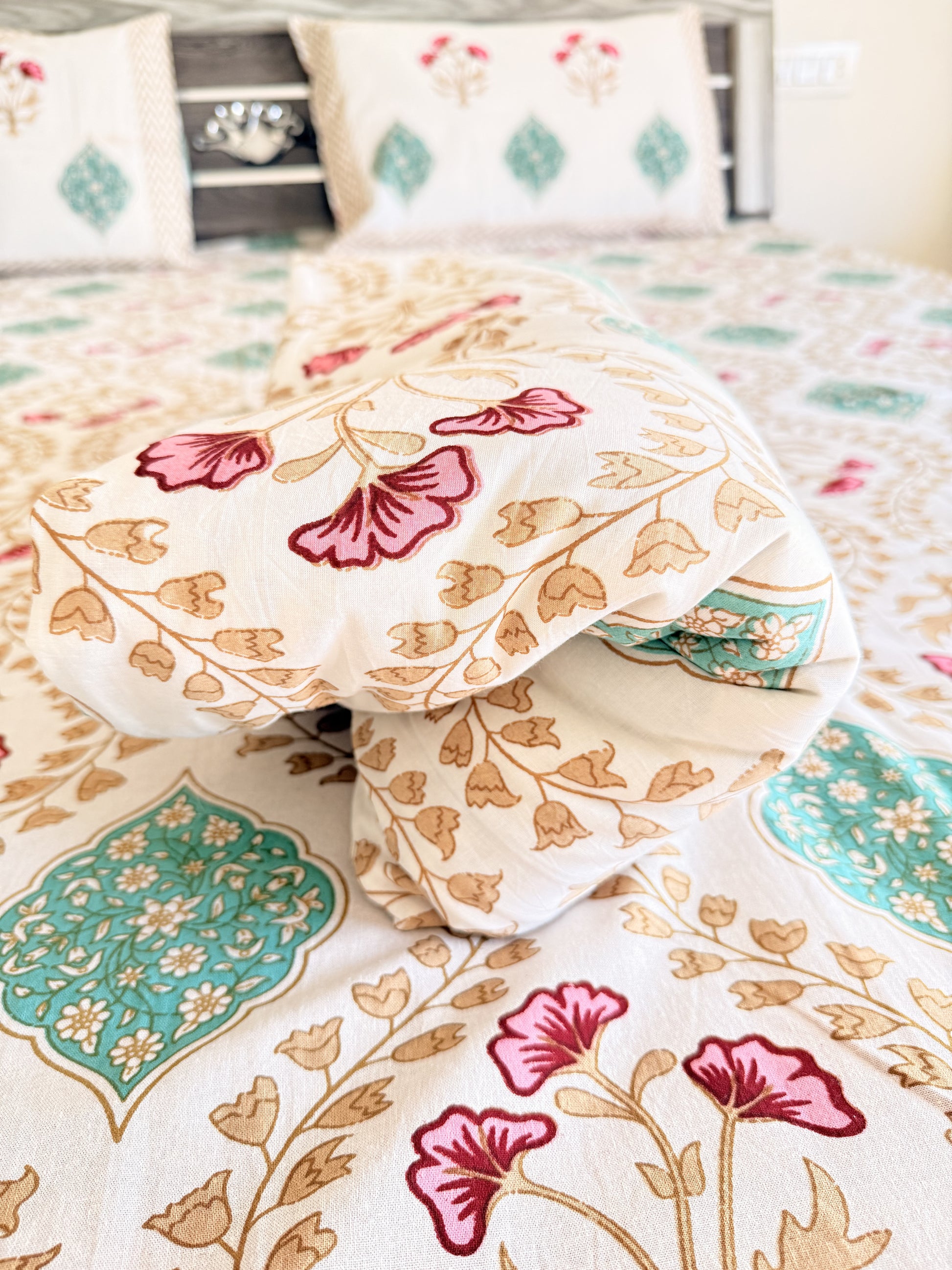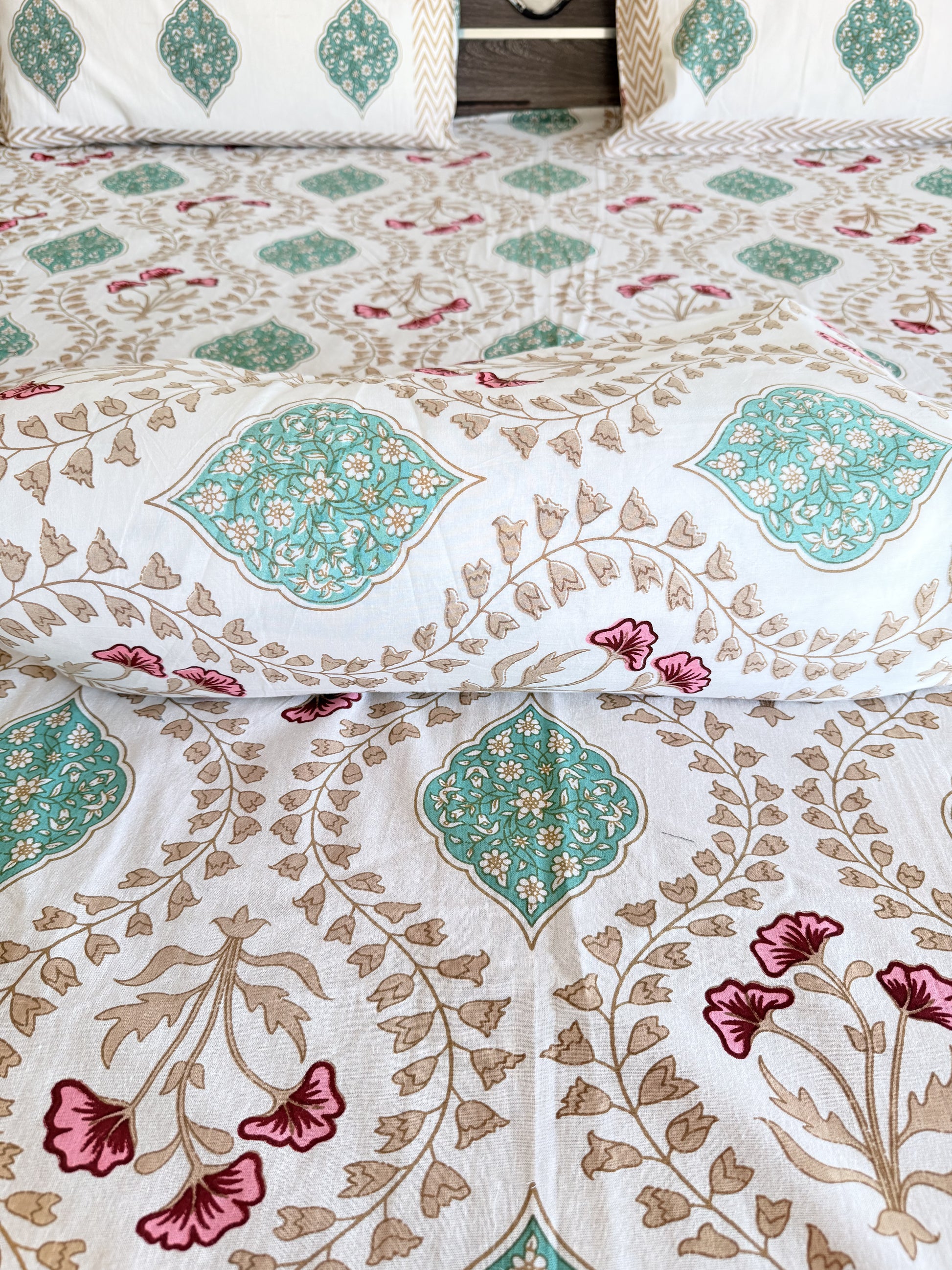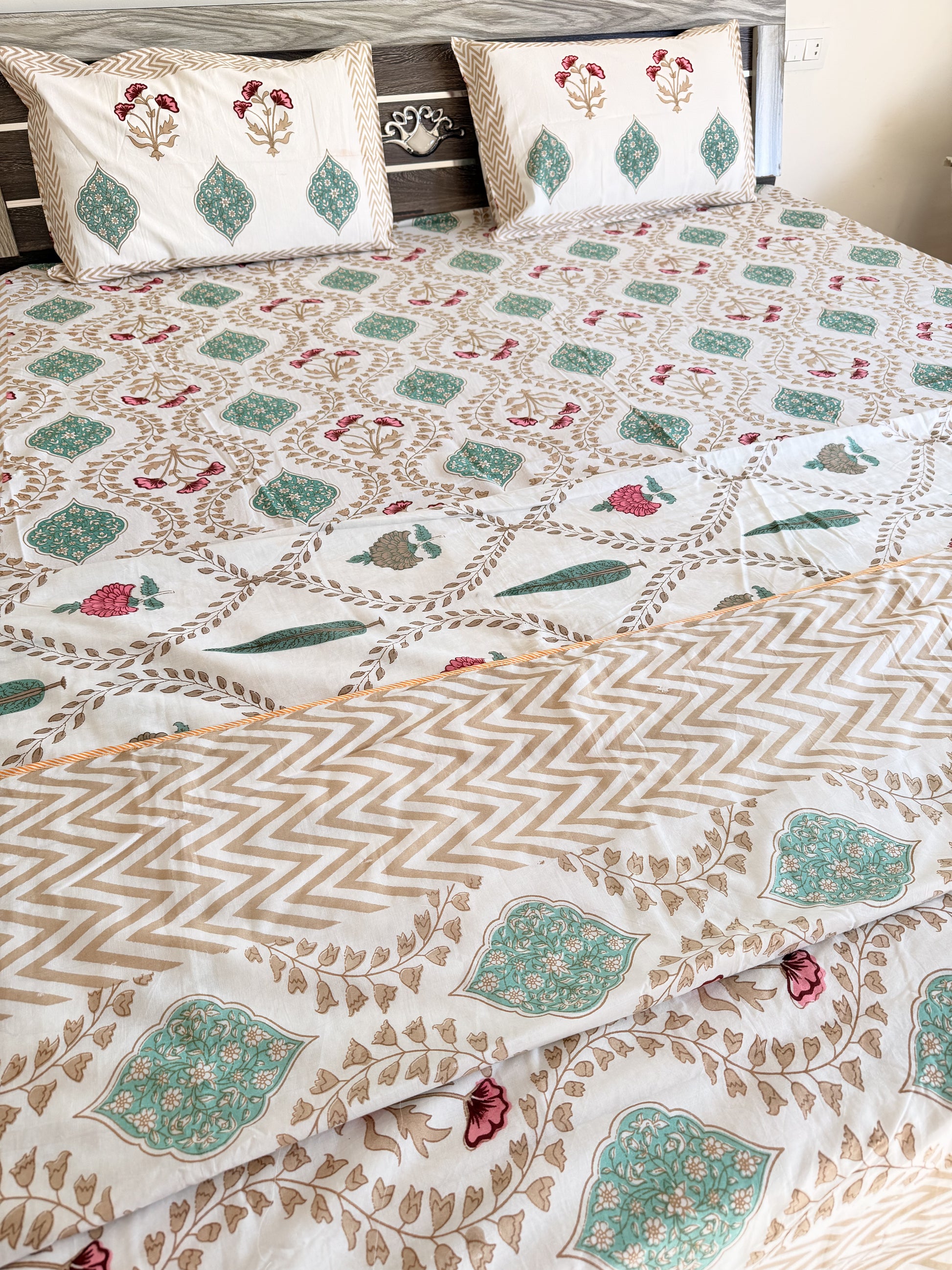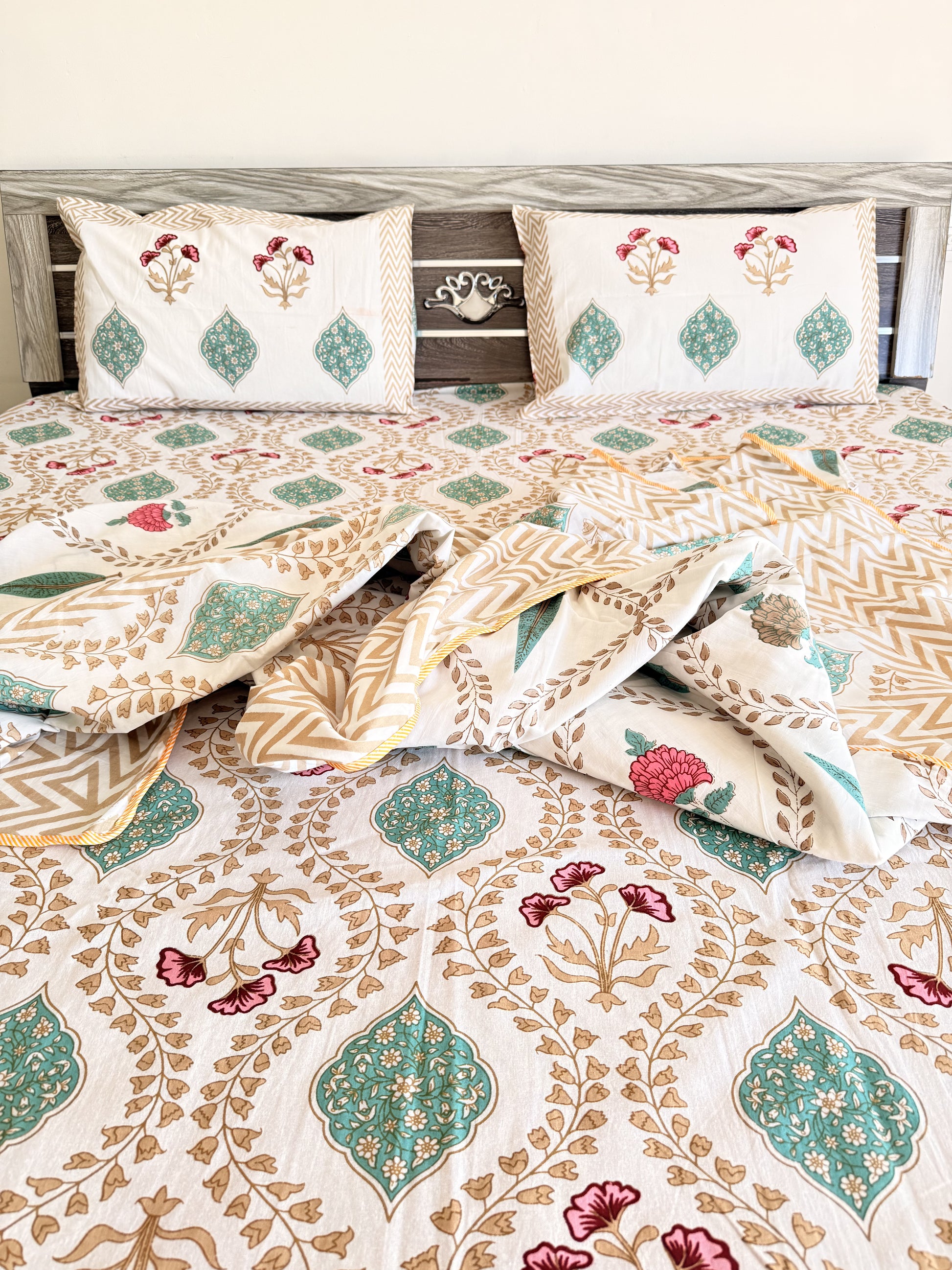 Wrap yourself in the comfort of tradition with this exquisite handmade dohar bedsheet set, a perfect blend of artistry, softness, and durability!