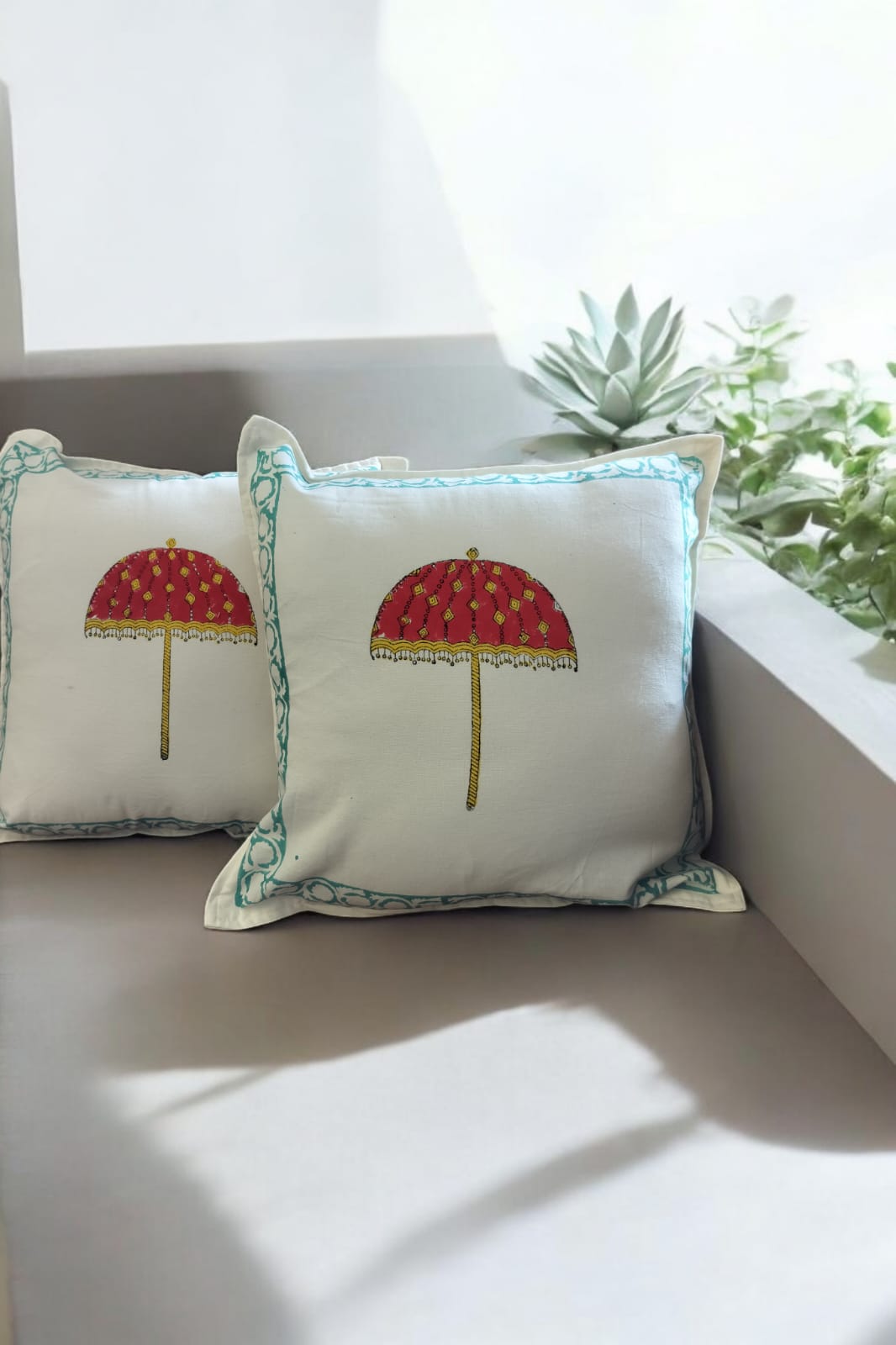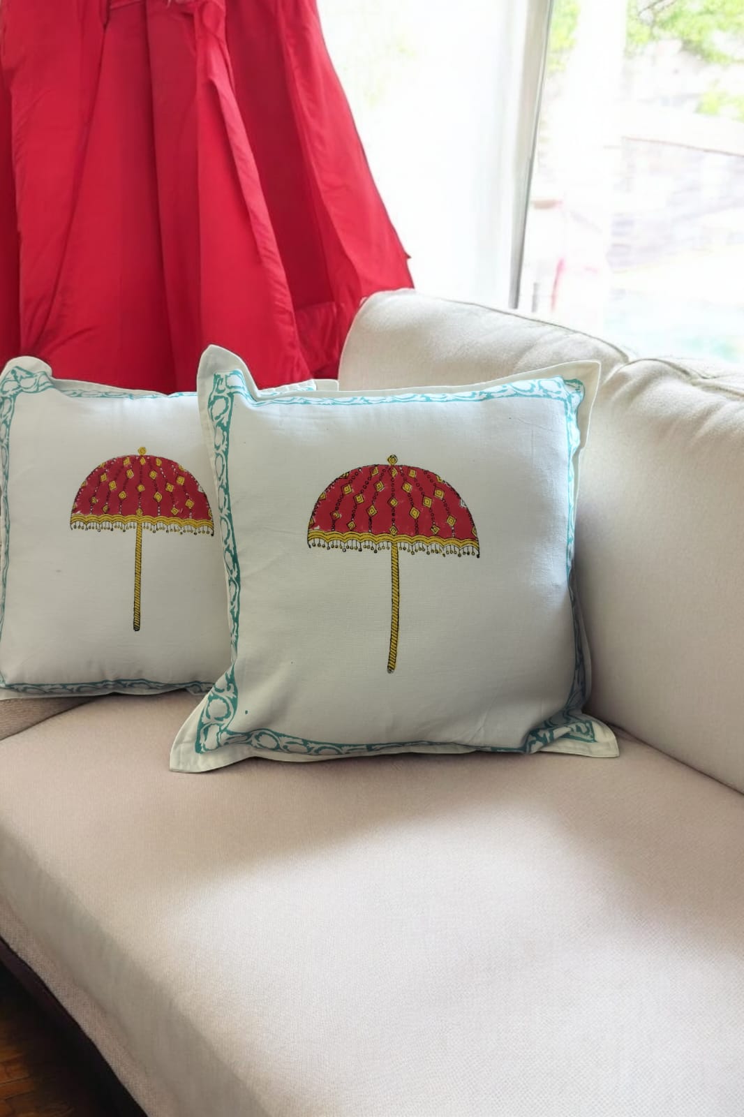 Umbrella White And Red Handblock Cushion Cover SET OF 2