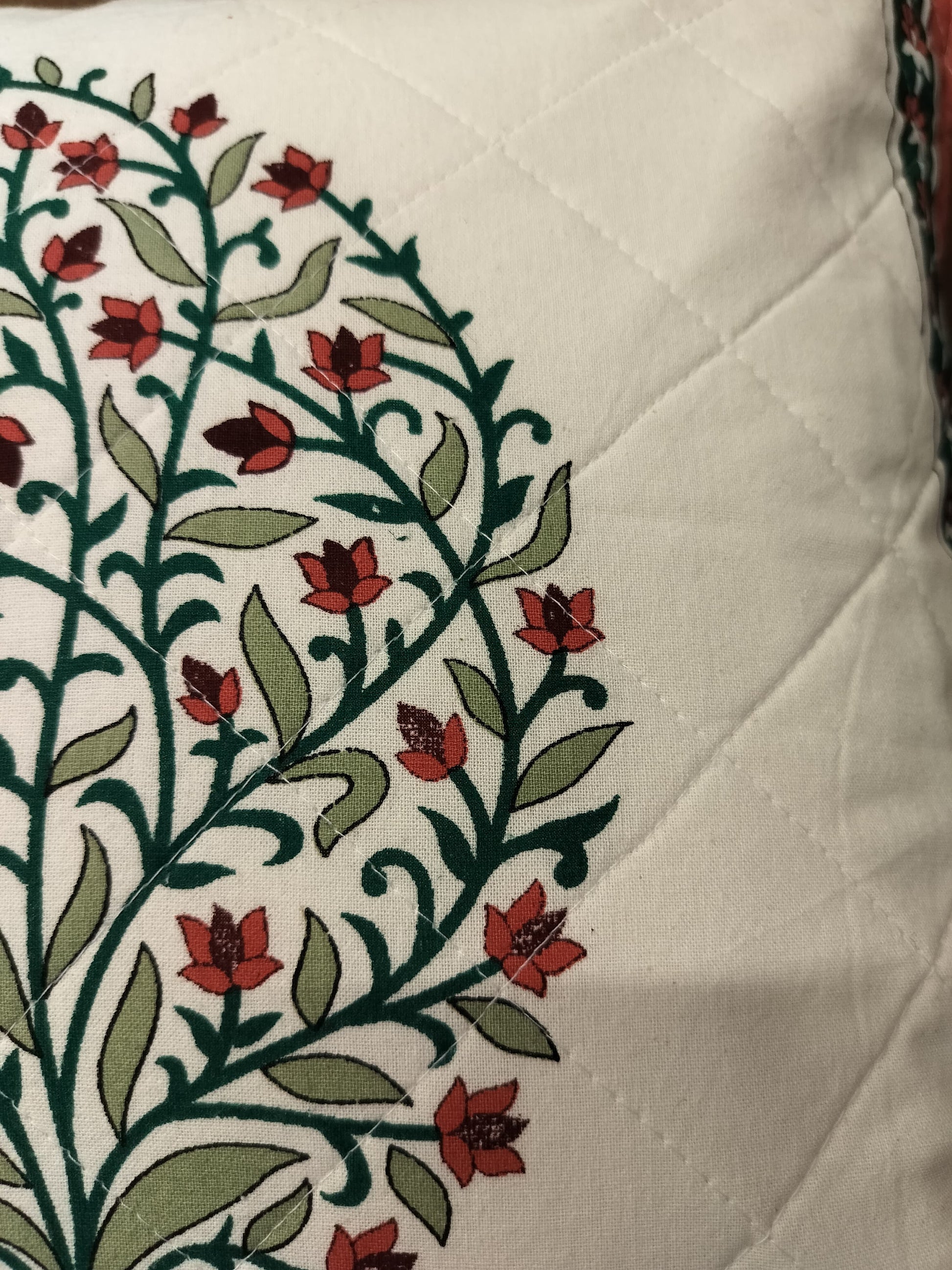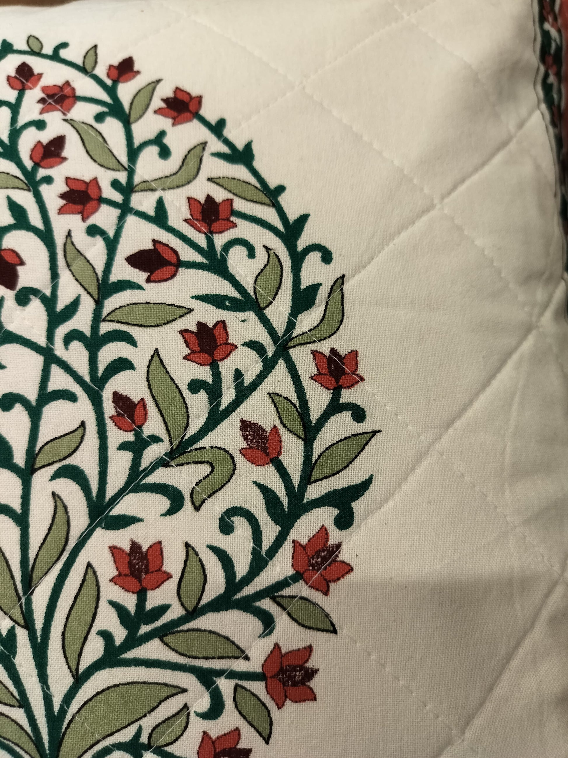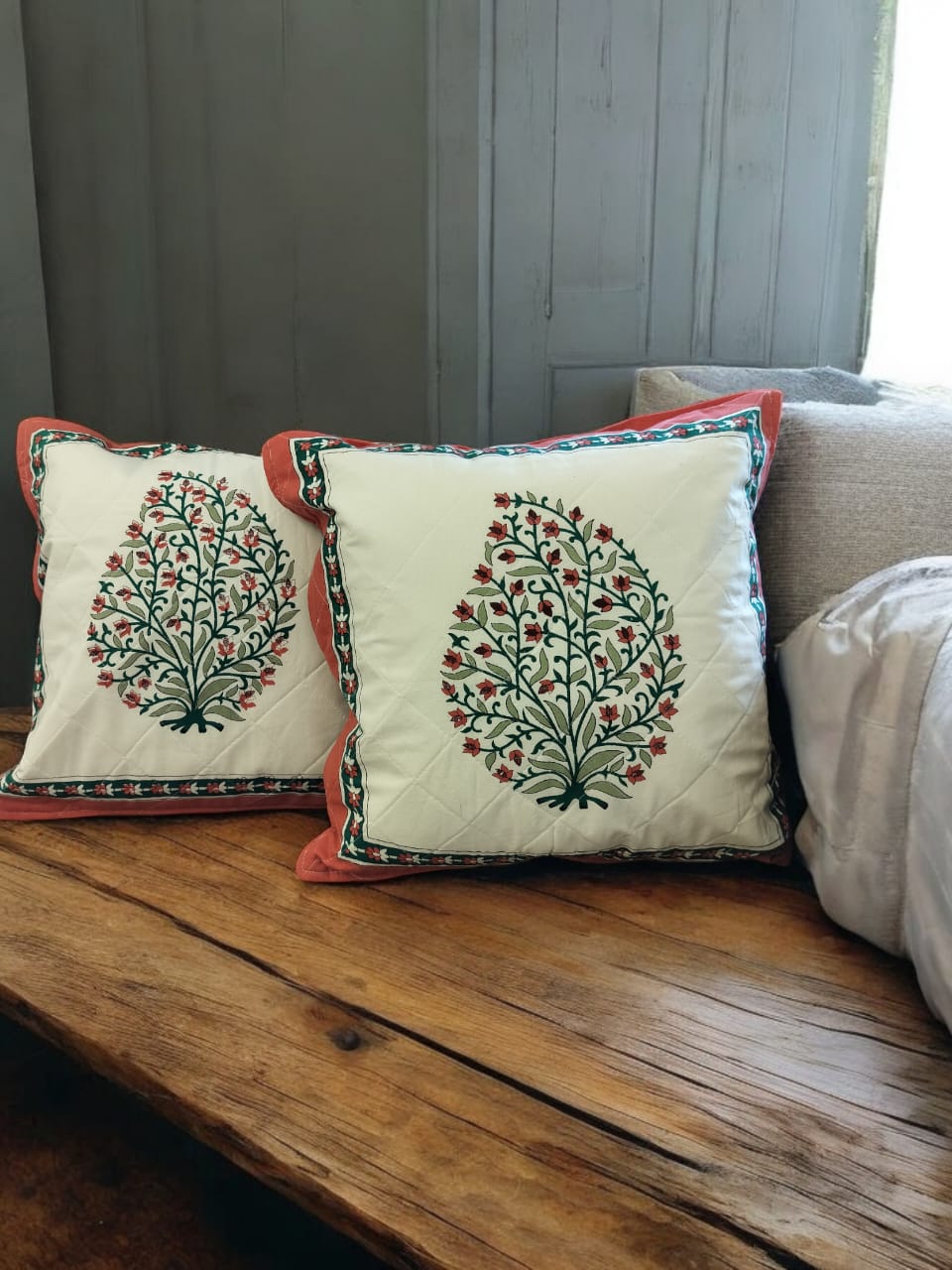 Crimson Red and Green Leaflet Quilted Handblock Cushion Cover (Set of 2)