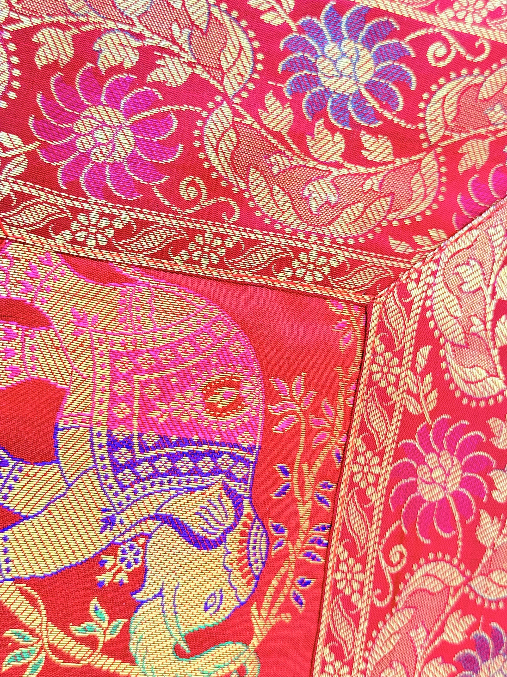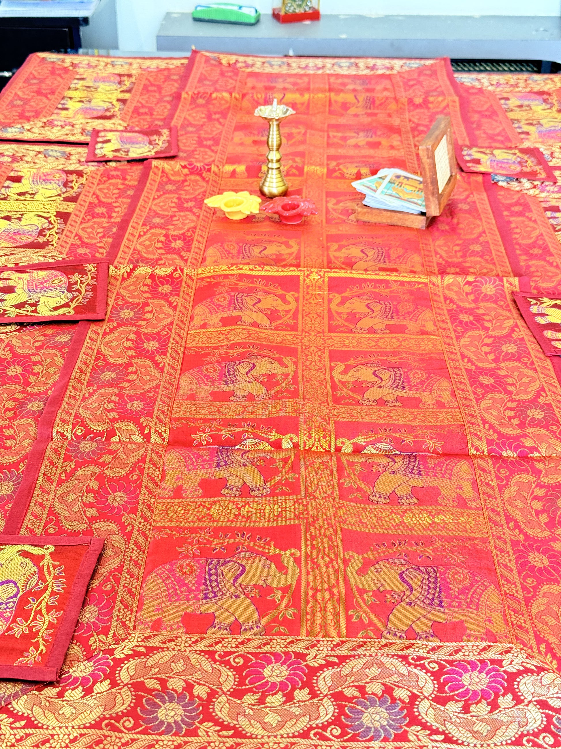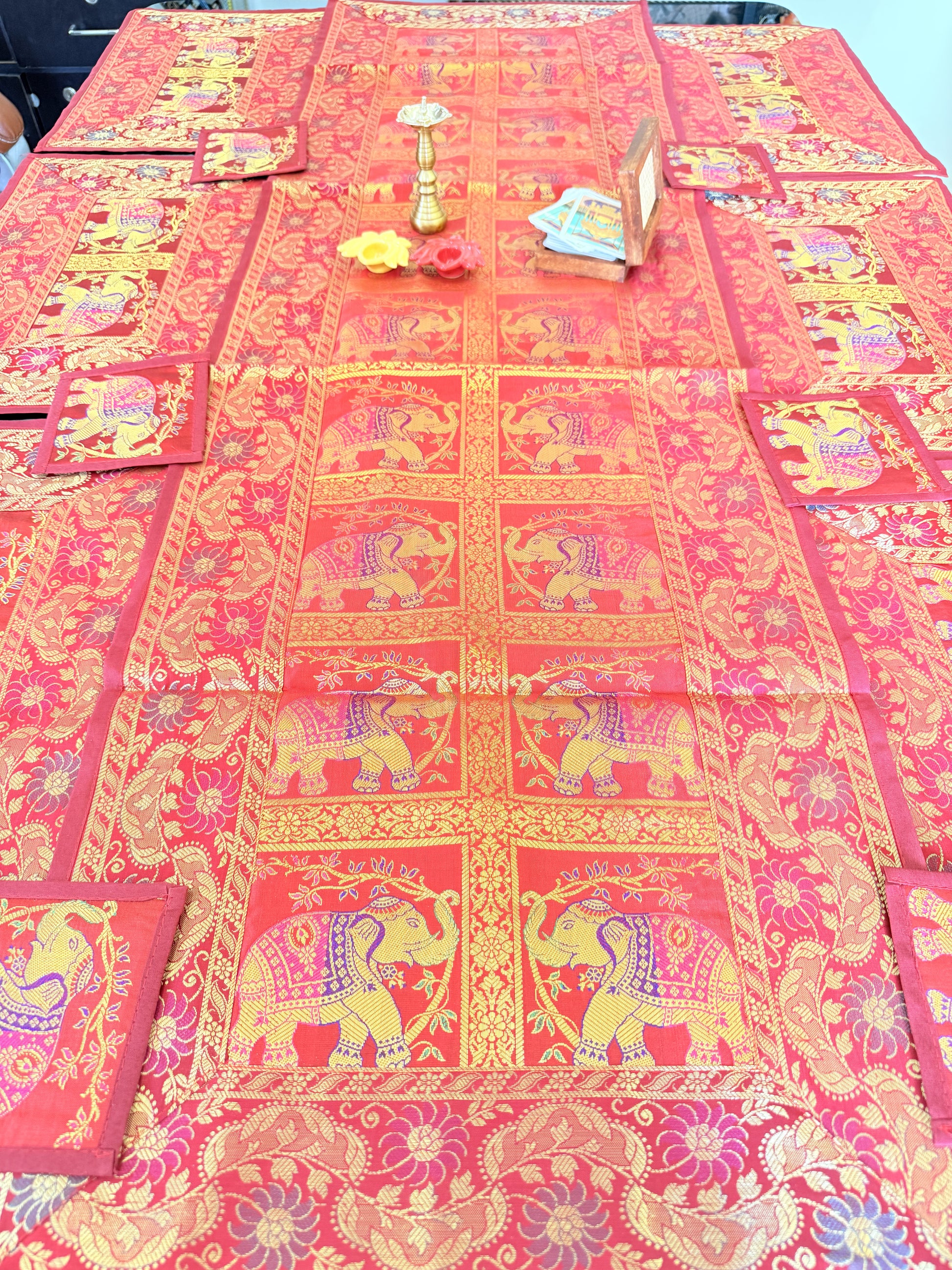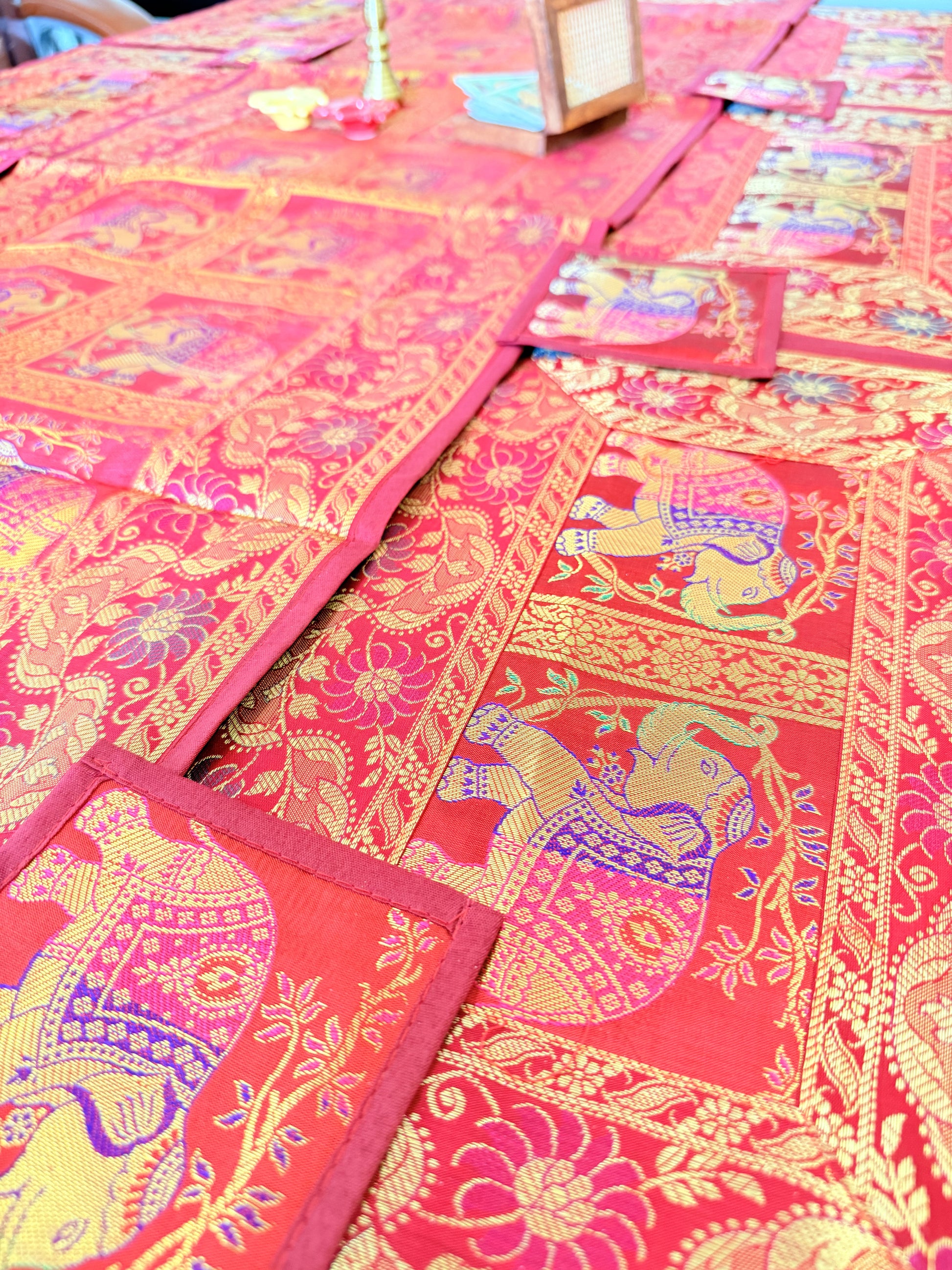 Add a touch of regal elegance to your home with the Crimson Red Banarasi Silk Brocade Table Runner and Mat with Coaster Set of 6. Crafted from premium brocade and art silk, this exquisite table runner combines timeless beauty with durability. Featuring stunning Crimson Red Banarasi silk borders and intricate golden brocade Elephant design in the center, it creates an elegant fusion of traditional Mughal design and modern sophistication.