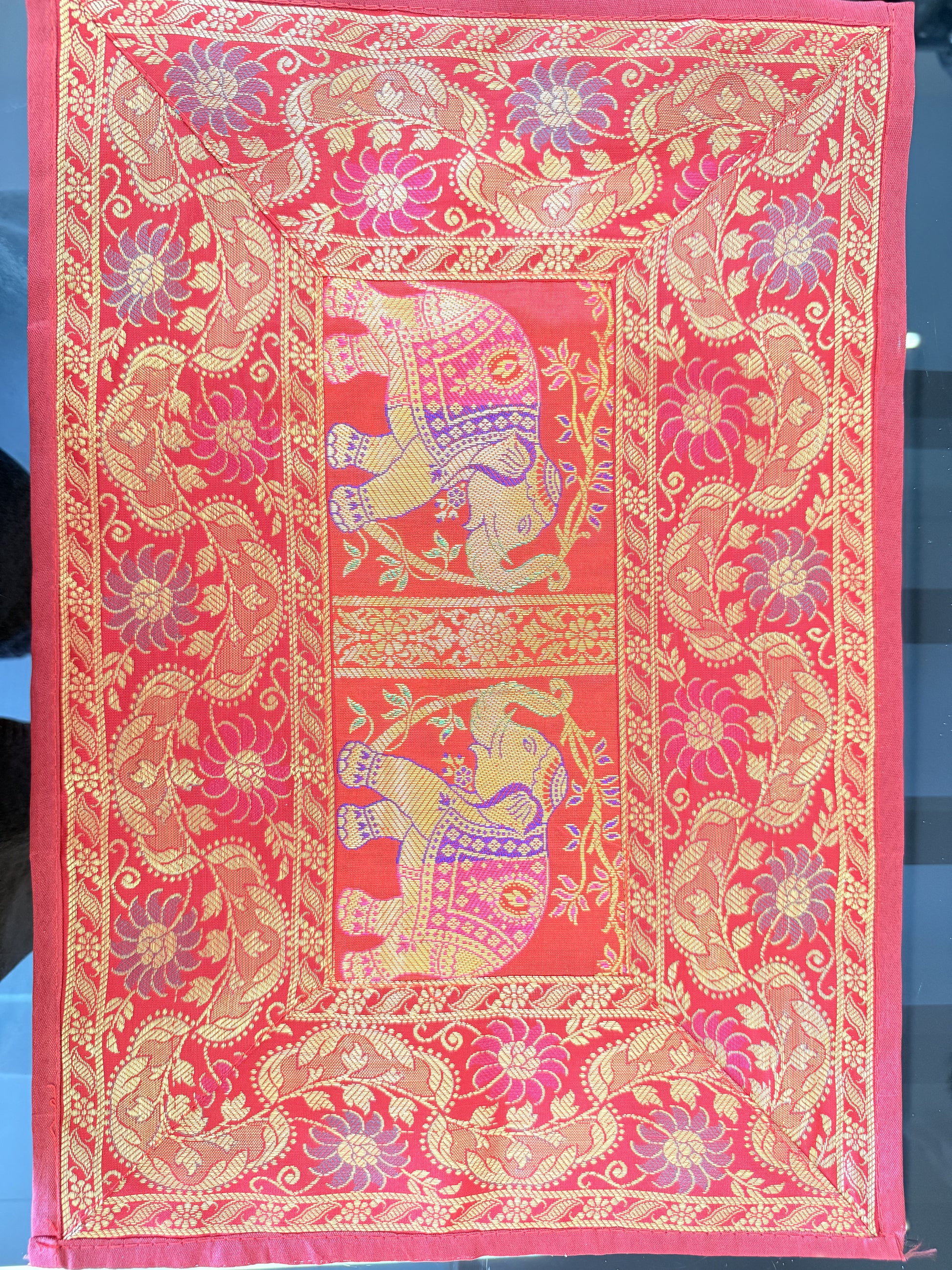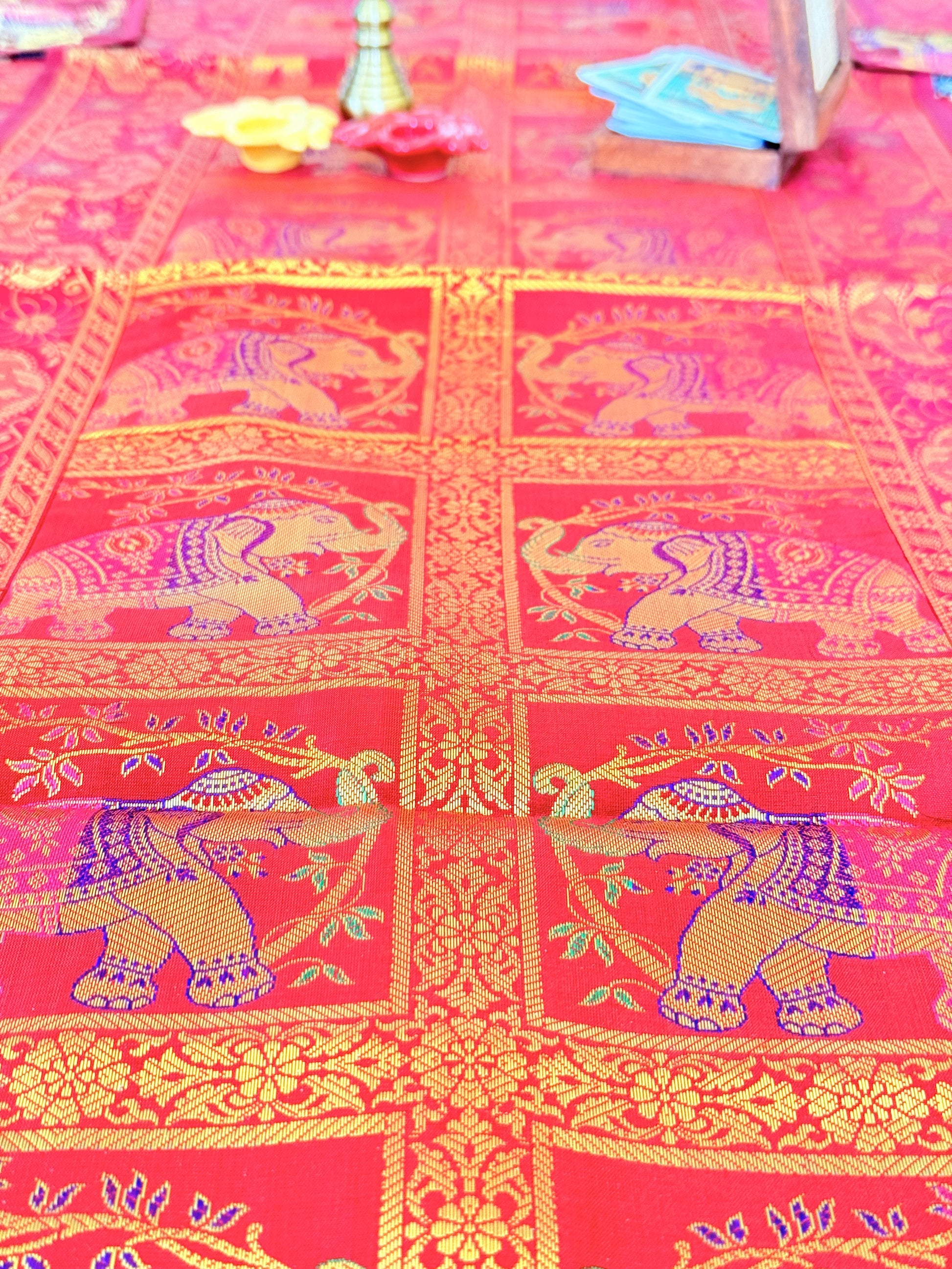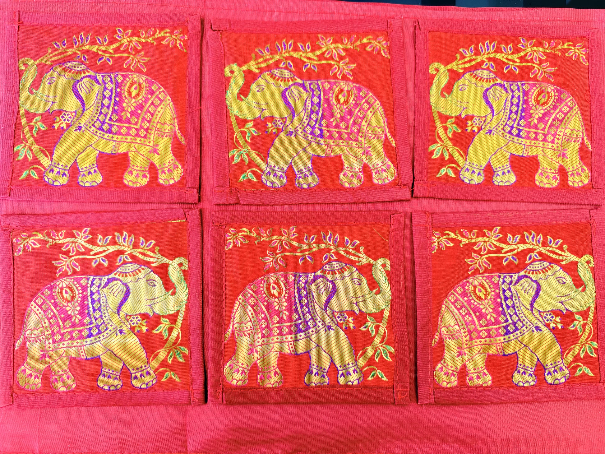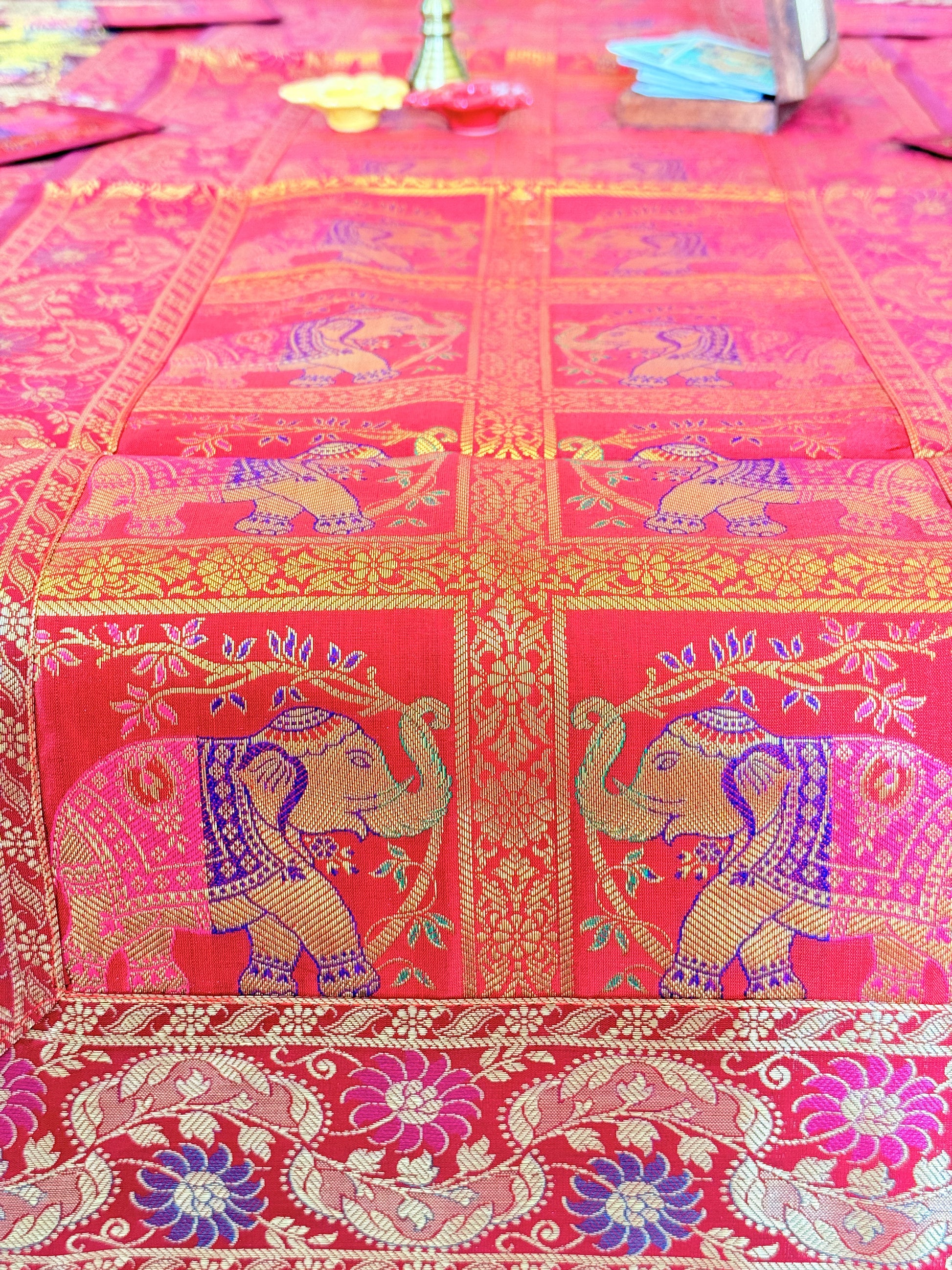 Add a touch of regal elegance to your home with the Crimson Red Banarasi Silk Brocade Table Runner and Mat with Coaster Set of 6. Crafted from premium brocade and art silk, this exquisite table runner combines timeless beauty with durability. Featuring stunning Crimson Red Banarasi silk borders and intricate golden brocade Elephant design in the center, it creates an elegant fusion of traditional Mughal design and modern sophistication.