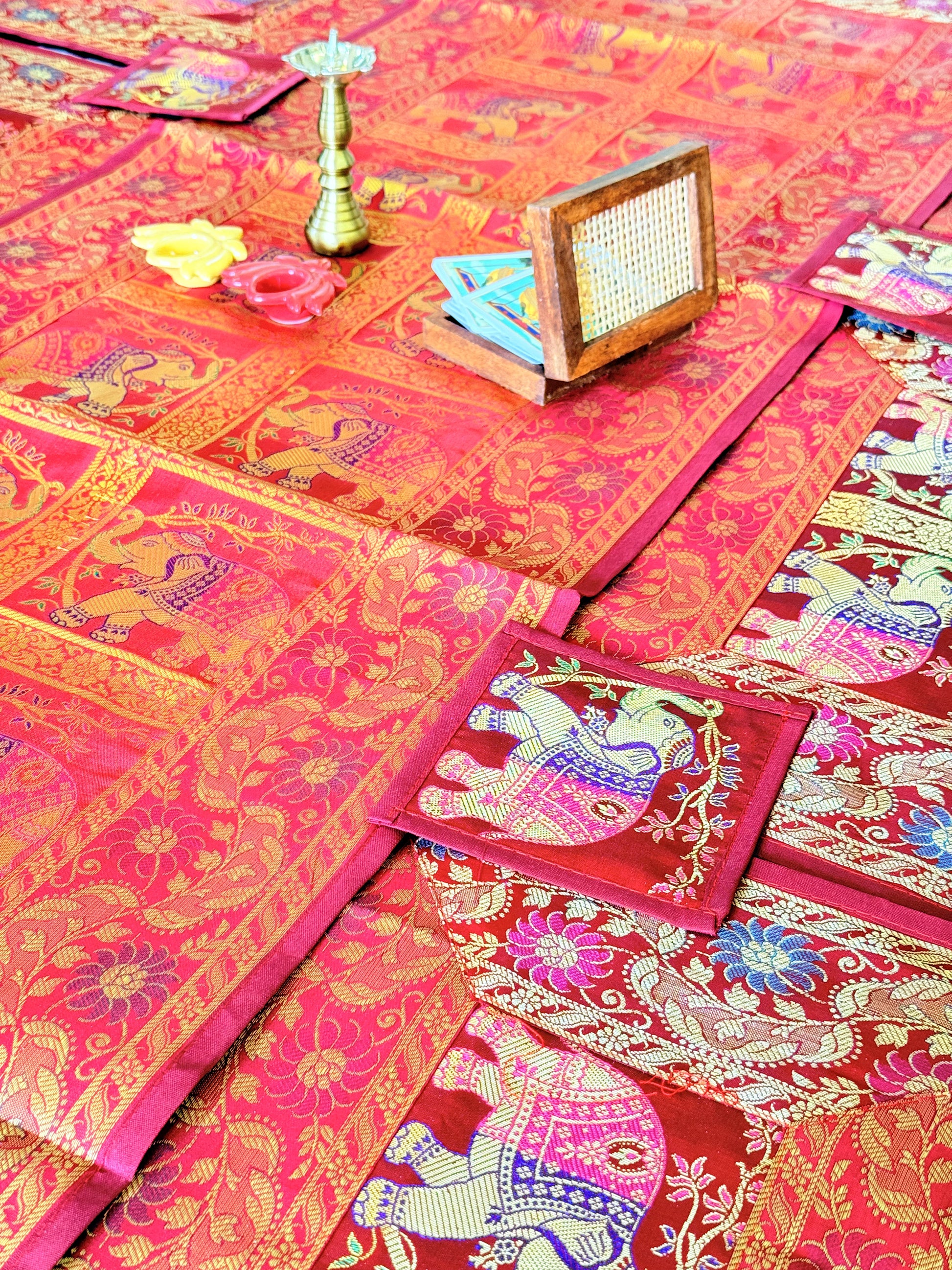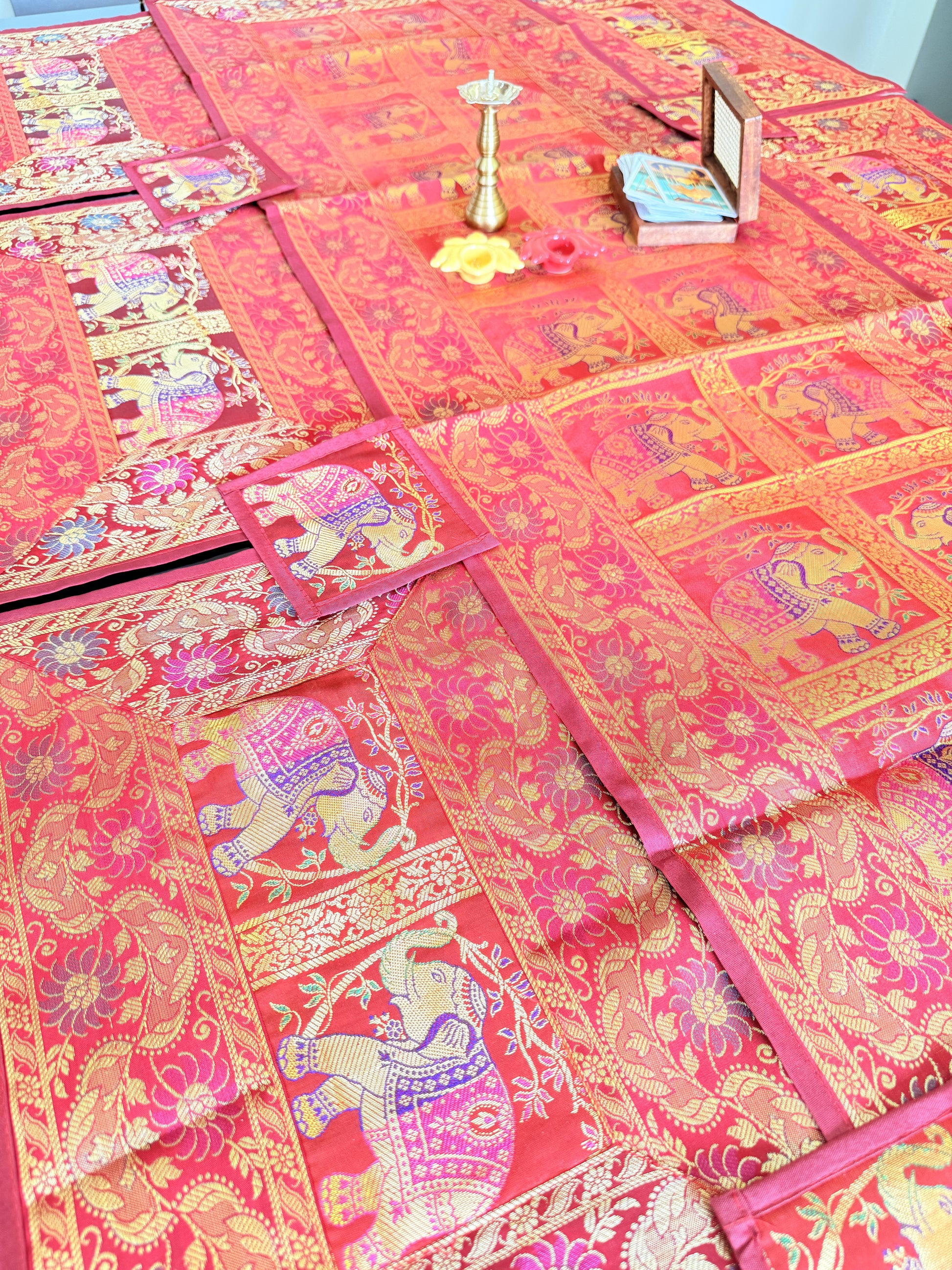 Crimson Red Banarasi Silk Brocade Table Runner and Mat with Coaster Set of 6