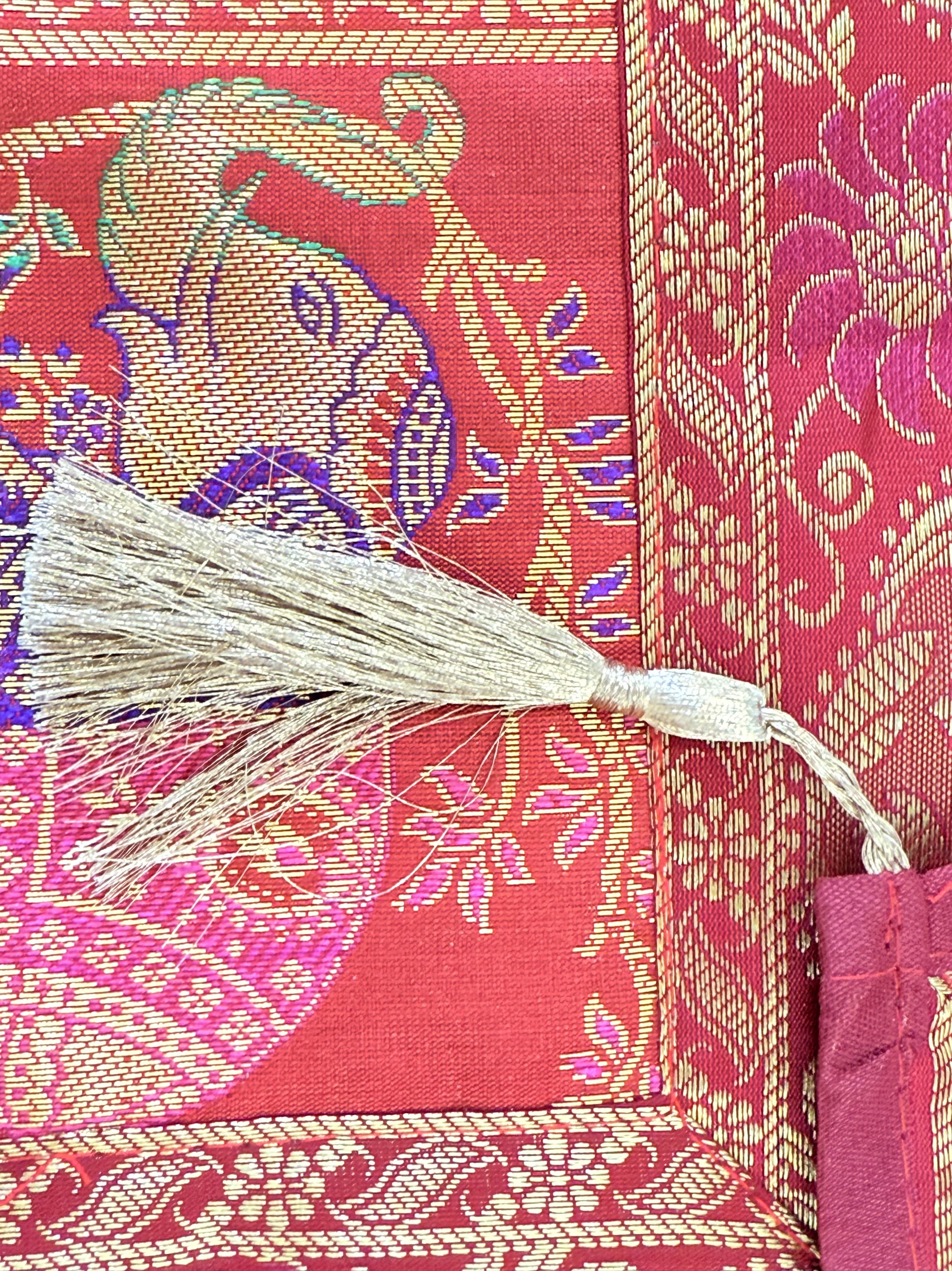 This runner is perfect for dining tables, side tables, or consoles, and adds a luxurious flair to any occasion, from festive gatherings to everyday meals. Handmade tassels with golden beads and threads complete the look, giving it an extra layer of charm and refinement.