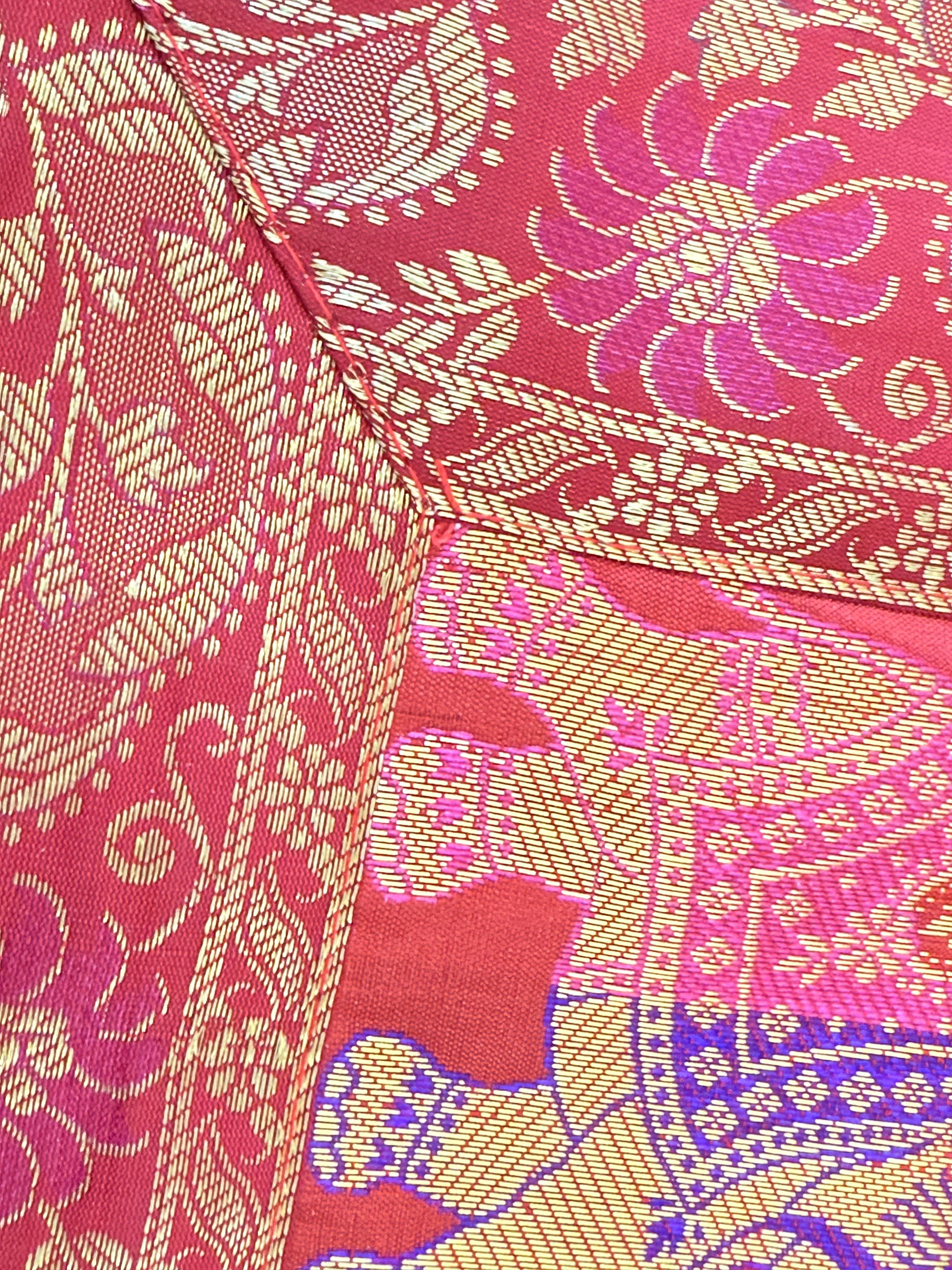 - Design: Rich Banarasi brocade borders with golden hand-block printed Gardish Circles in the center