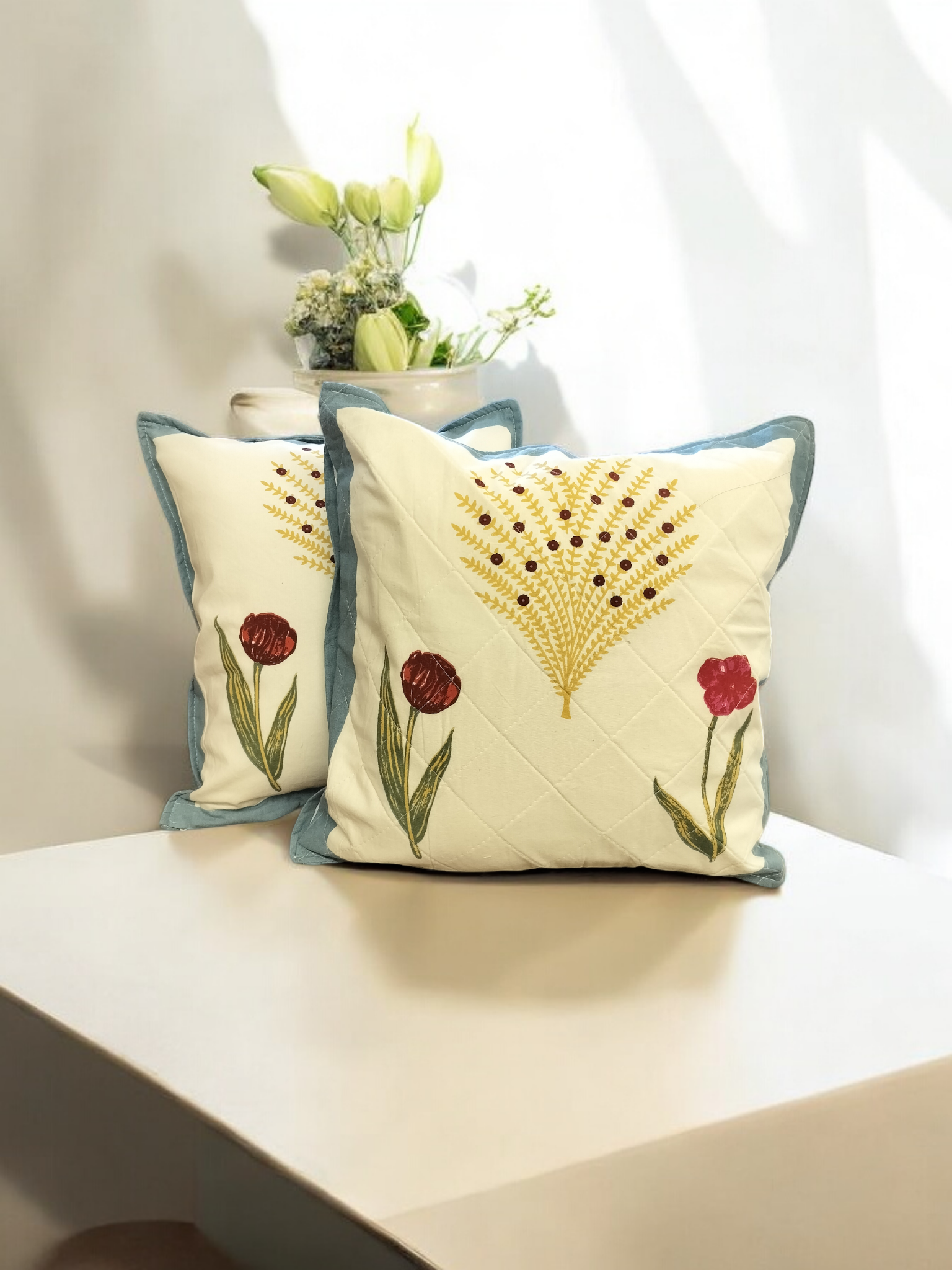 Quilted Handblock Cushion Cover Set of 2 (Blue and White)