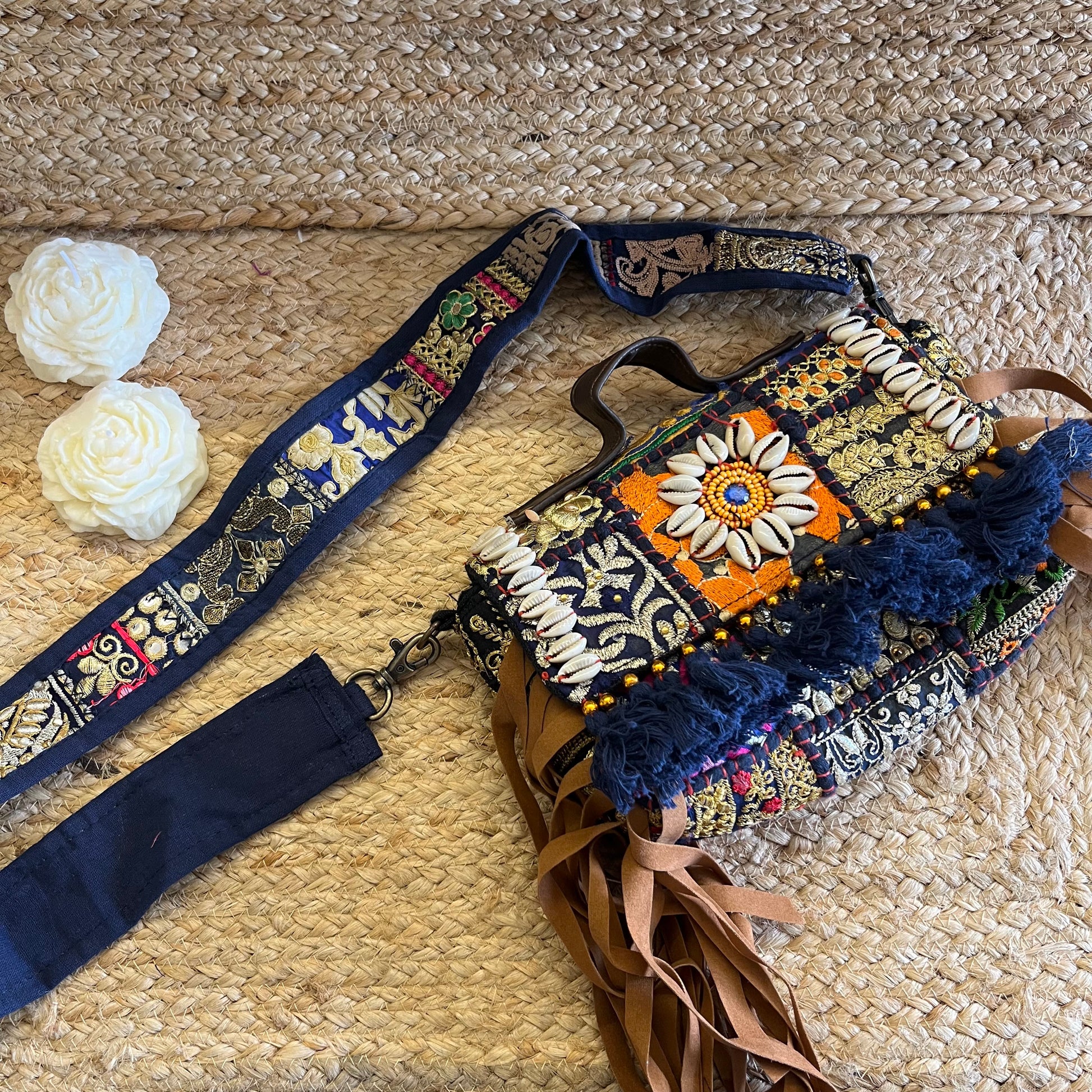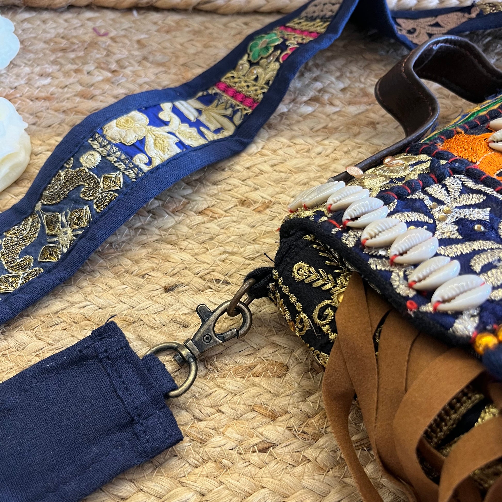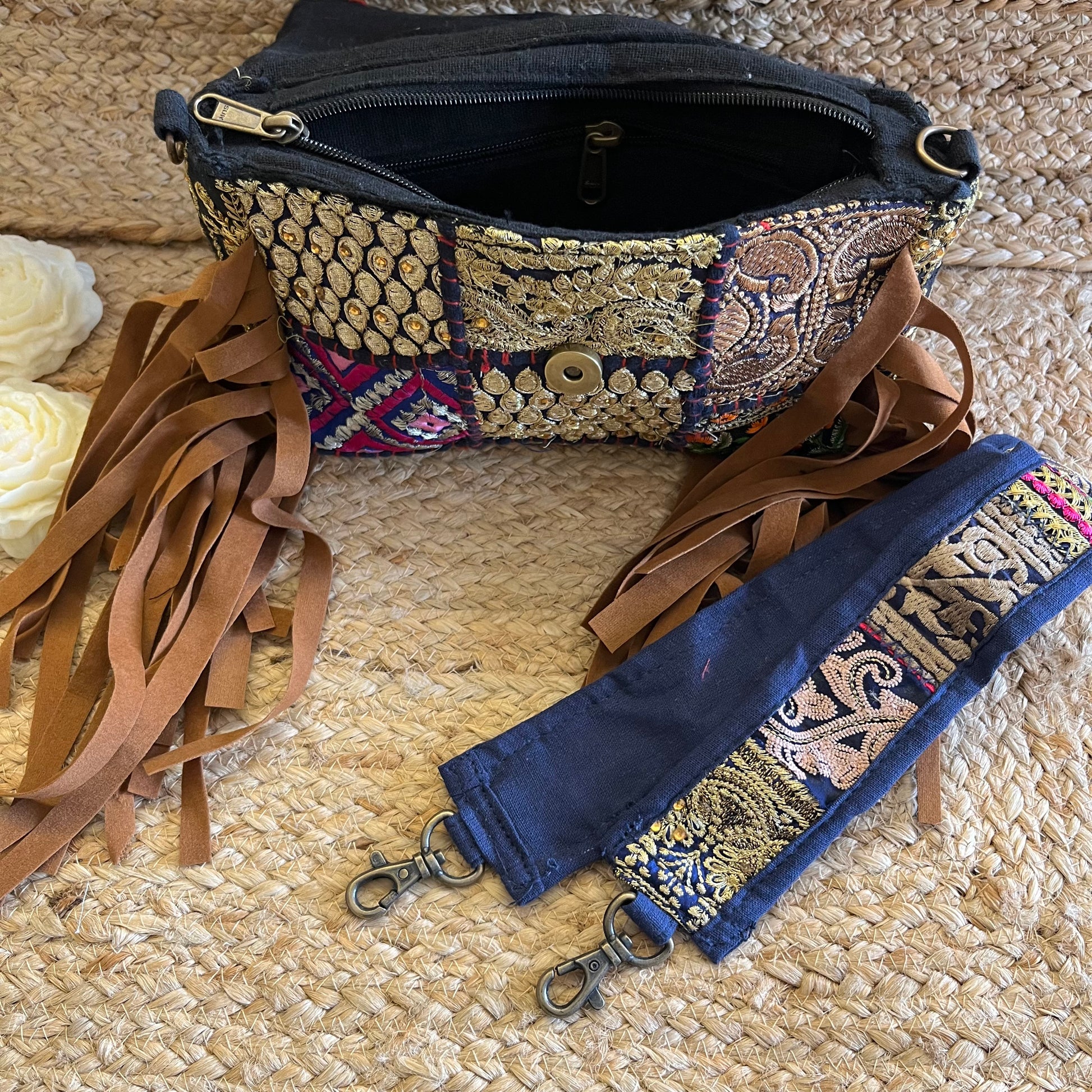 Dark Blue Tasseled Boho sling Bag with Detachable Sling