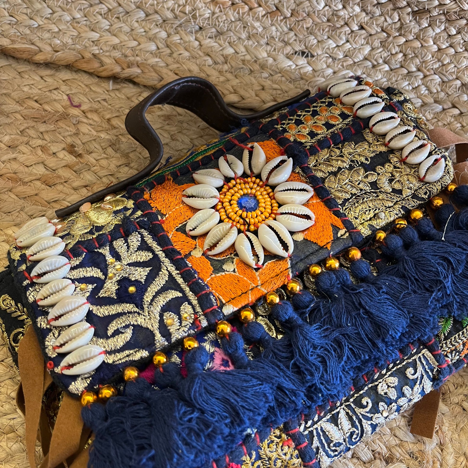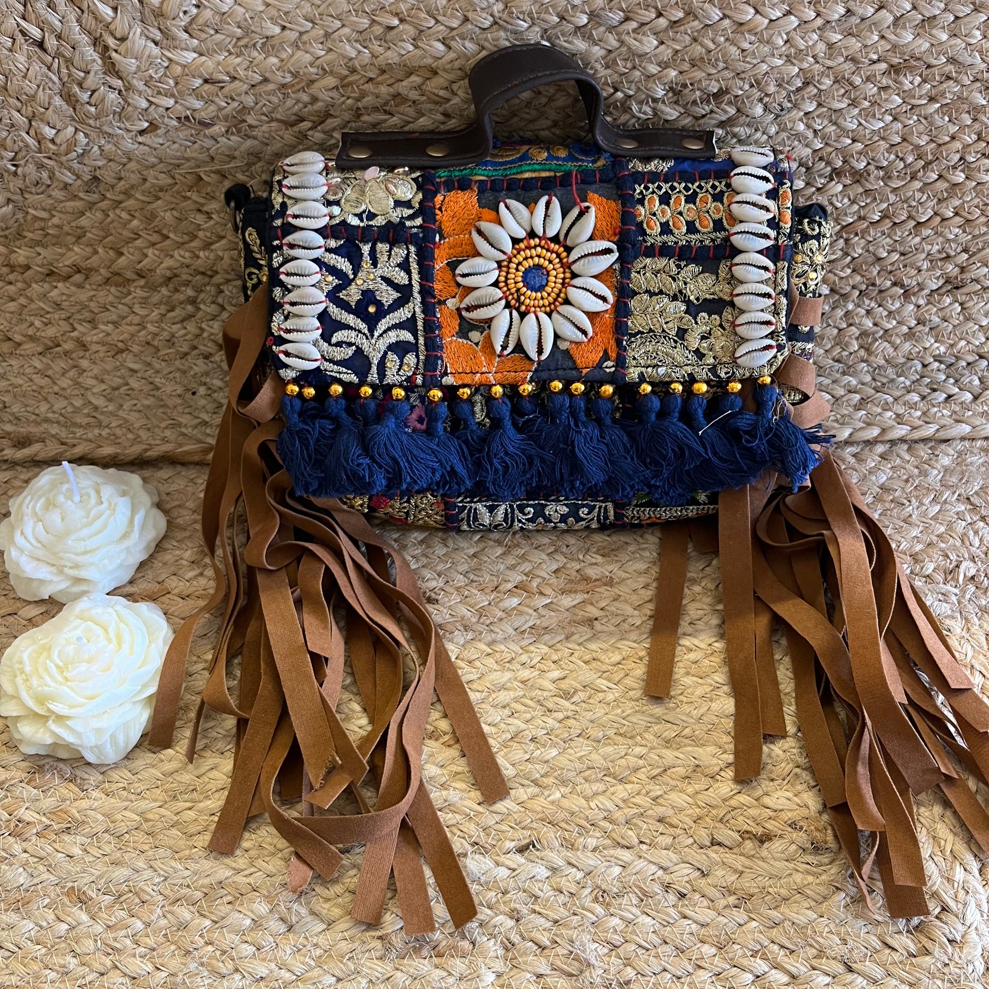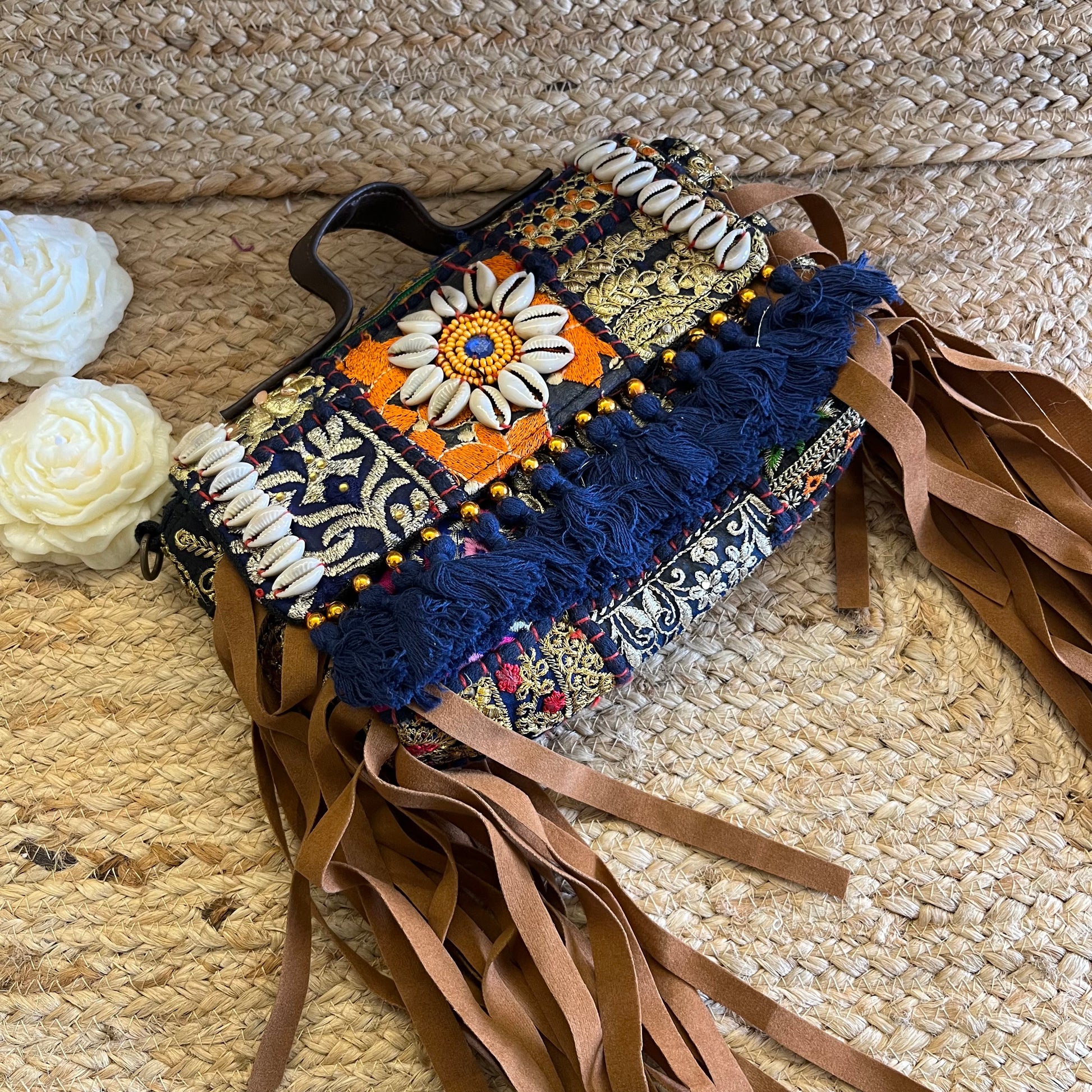 Dark Blue Tasseled Boho sling Bag with Detachable Sling