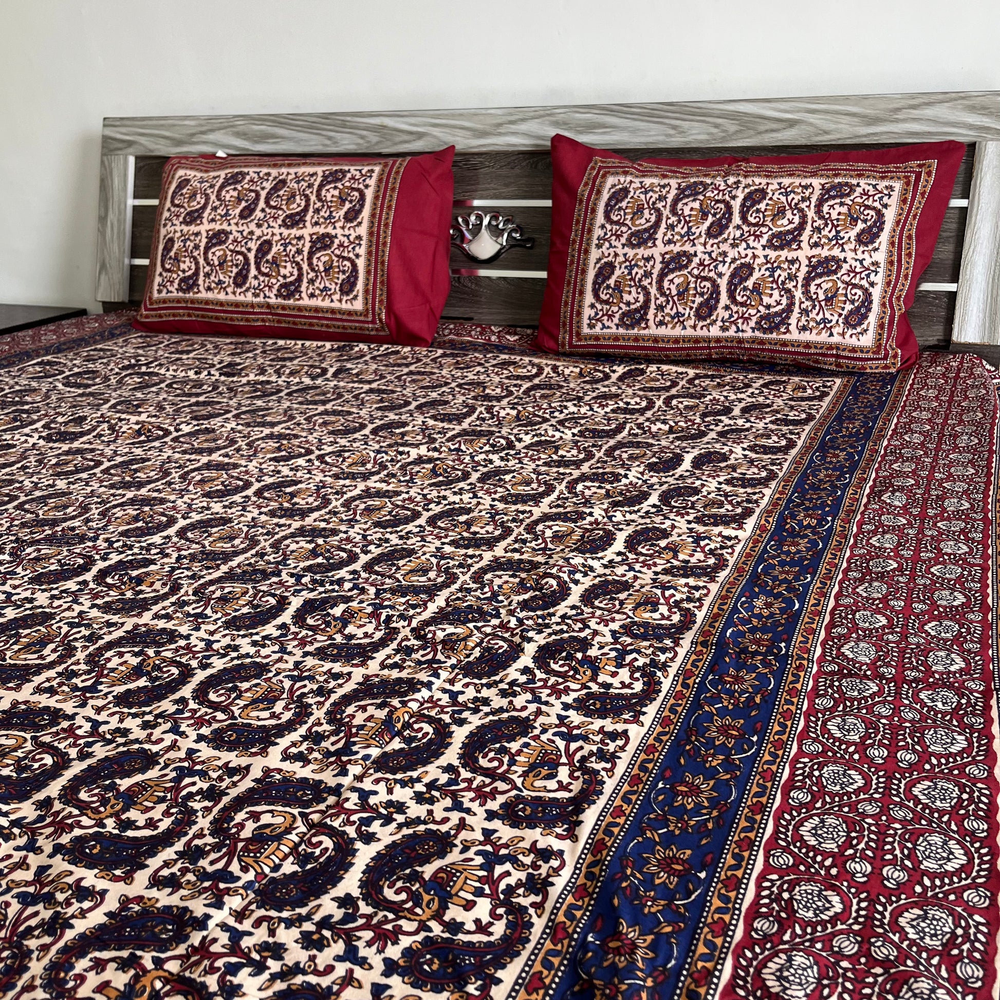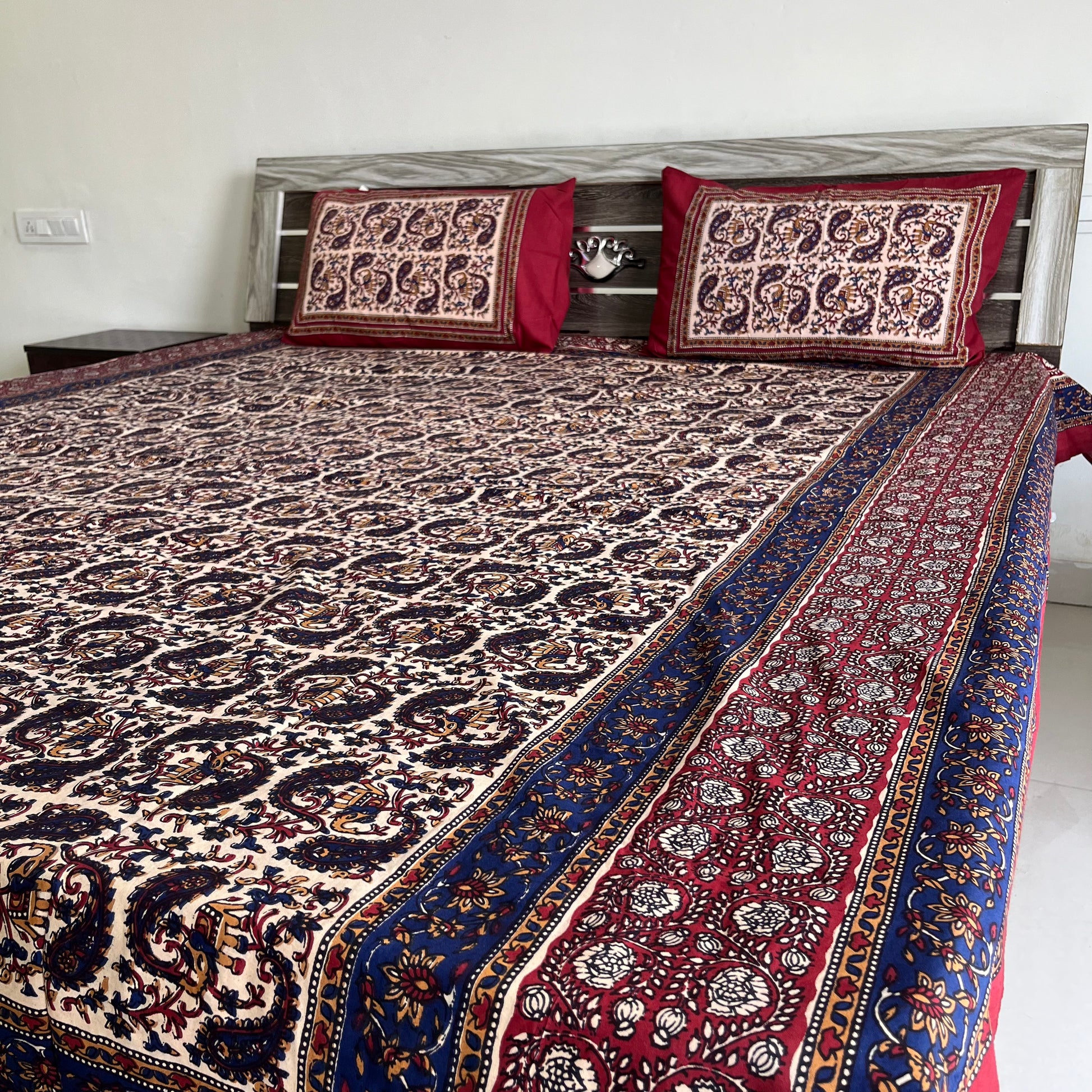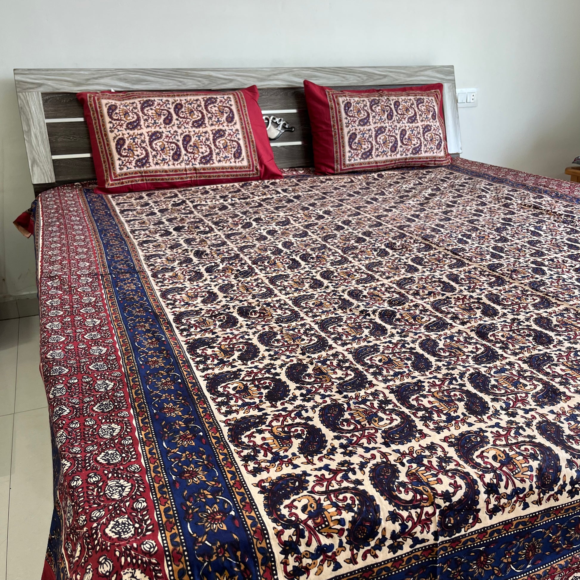 Deep Blue and Red Kalamkari Bedsheet with 2 Pillow covers