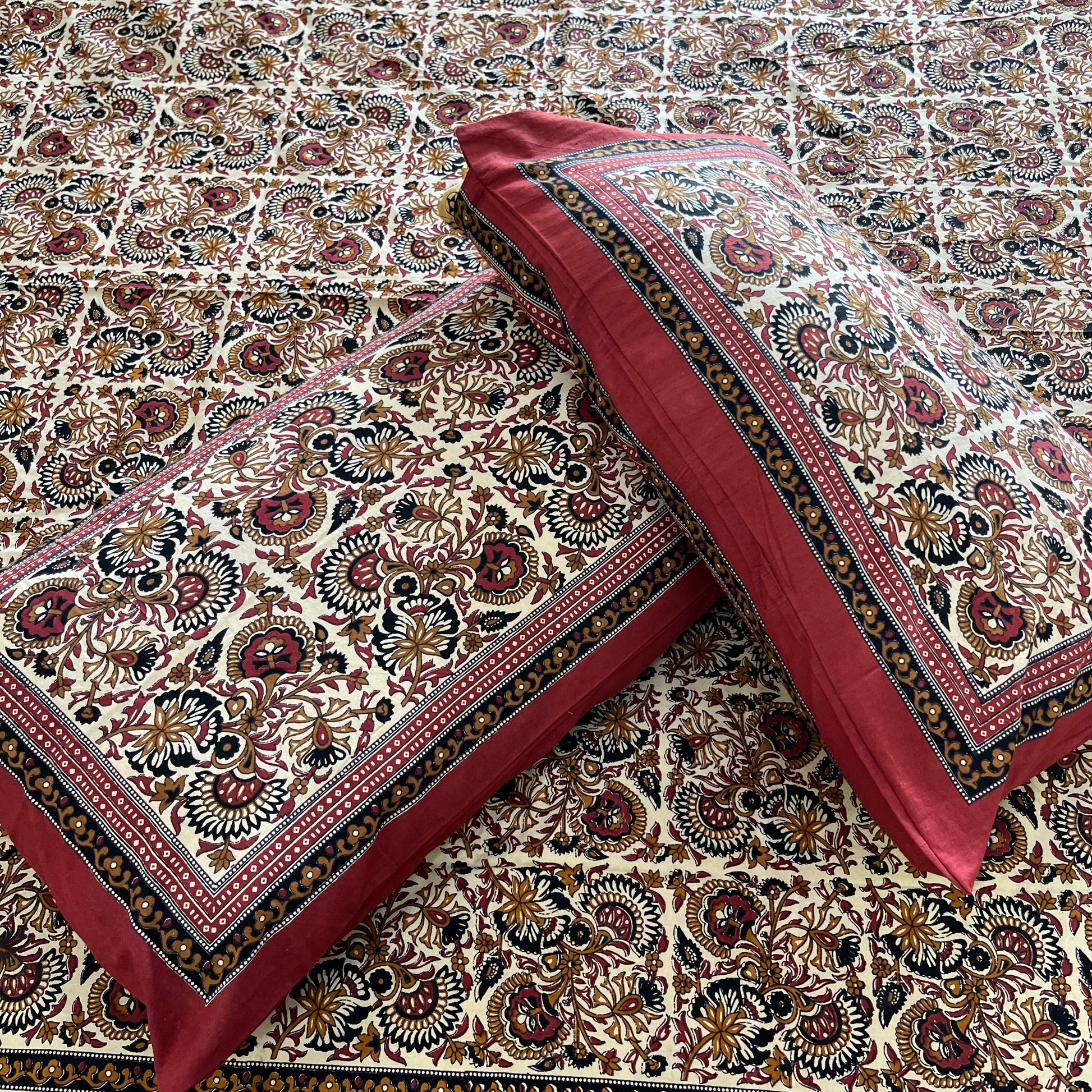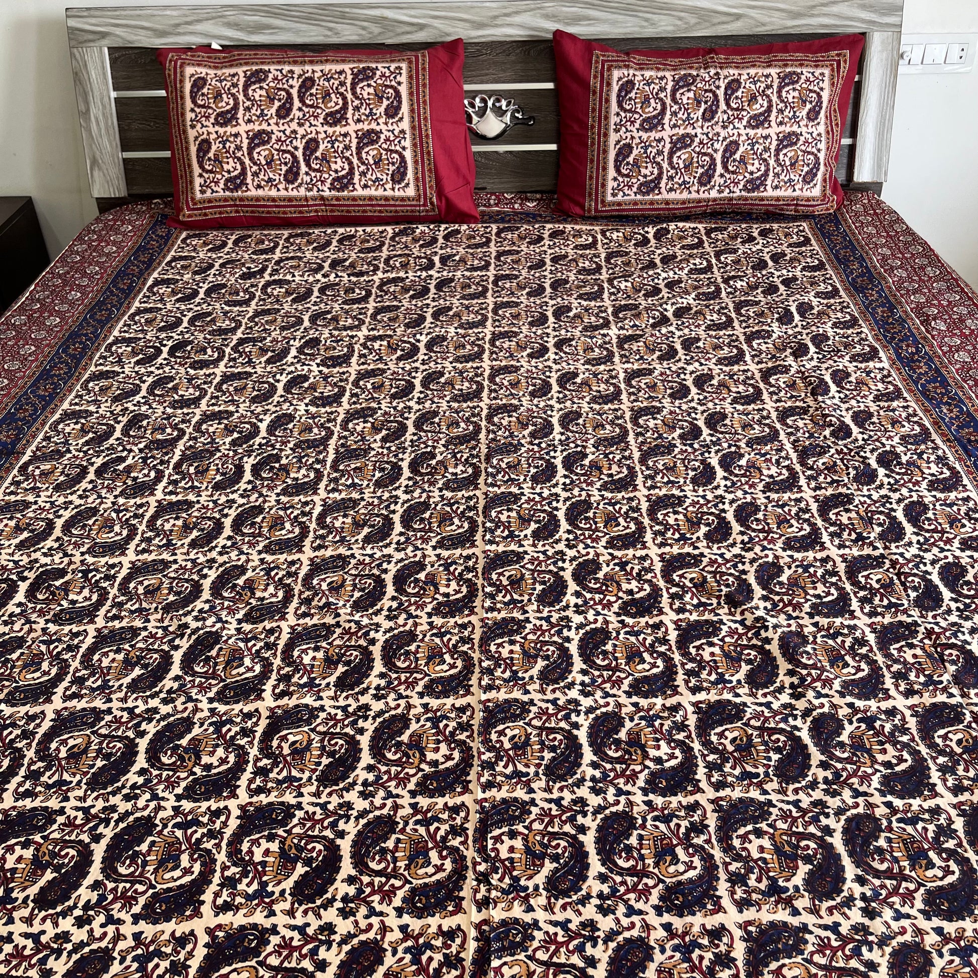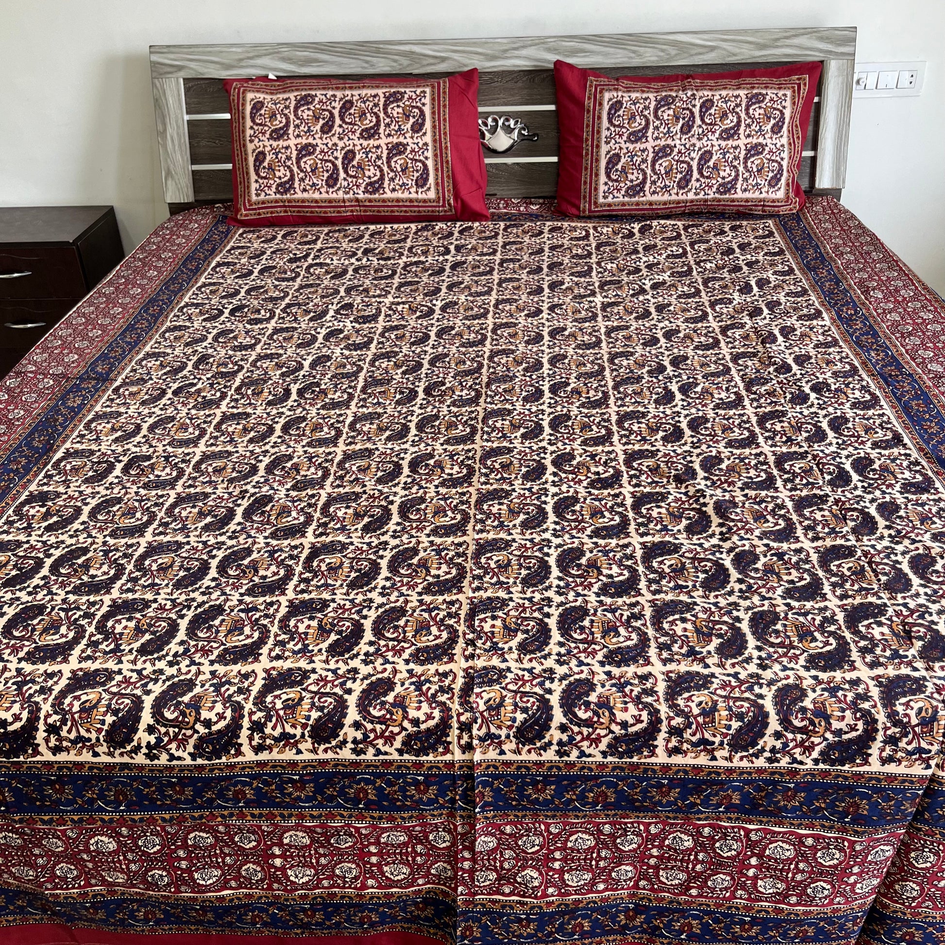 Deep Blue and Red Kalamkari Bedsheet with 2 Pillow covers