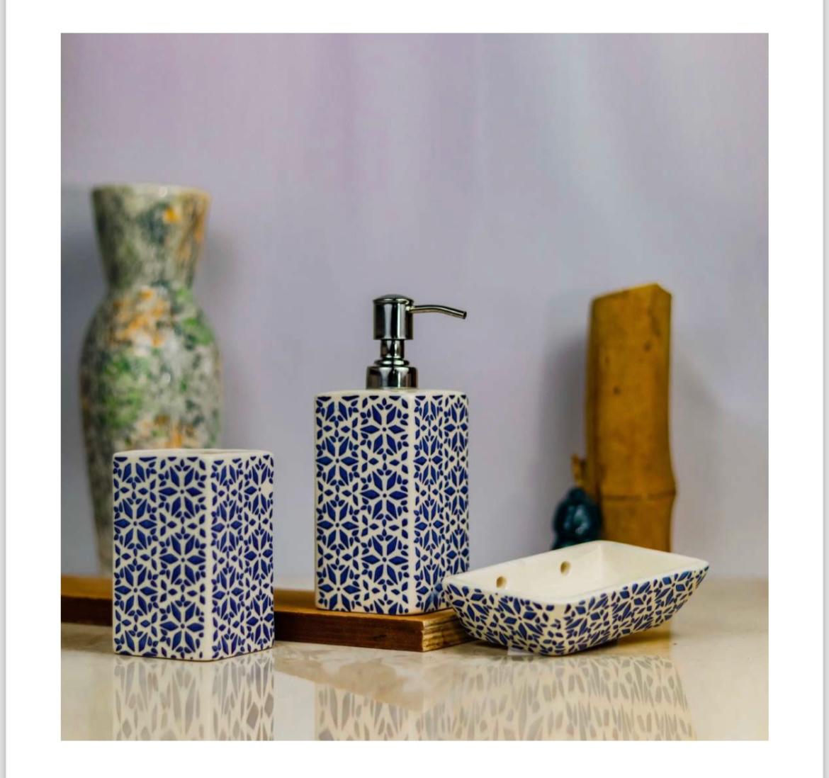 - 3-Piece Ceramic Set – Includes a soap dispenser, soap bar holder, and toothbrush holder.
