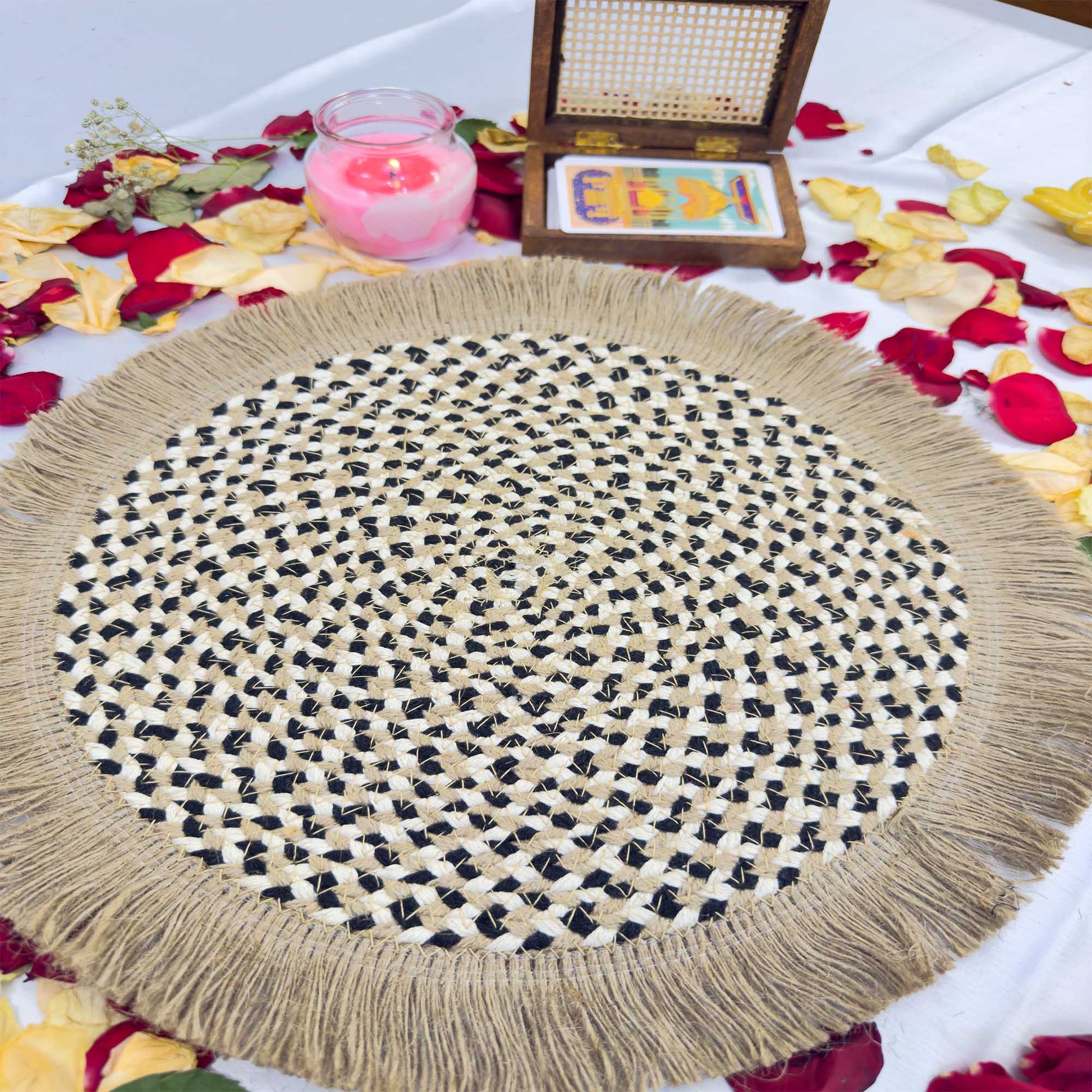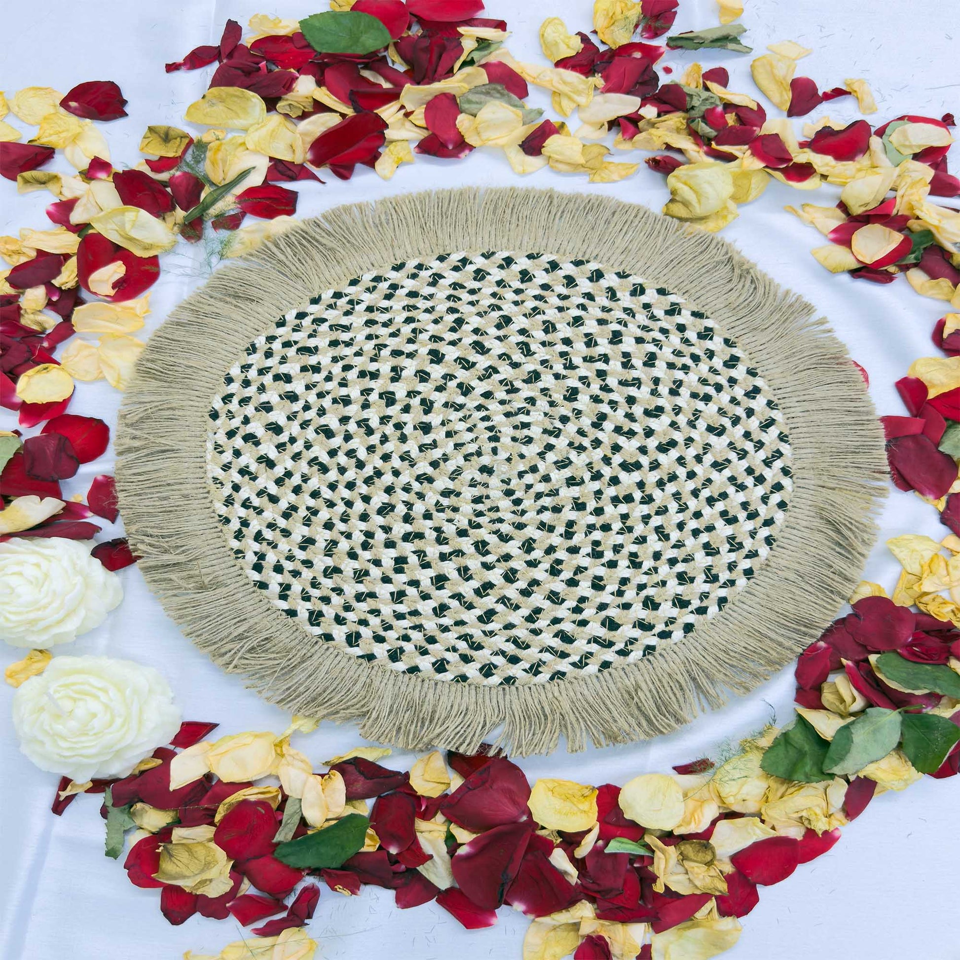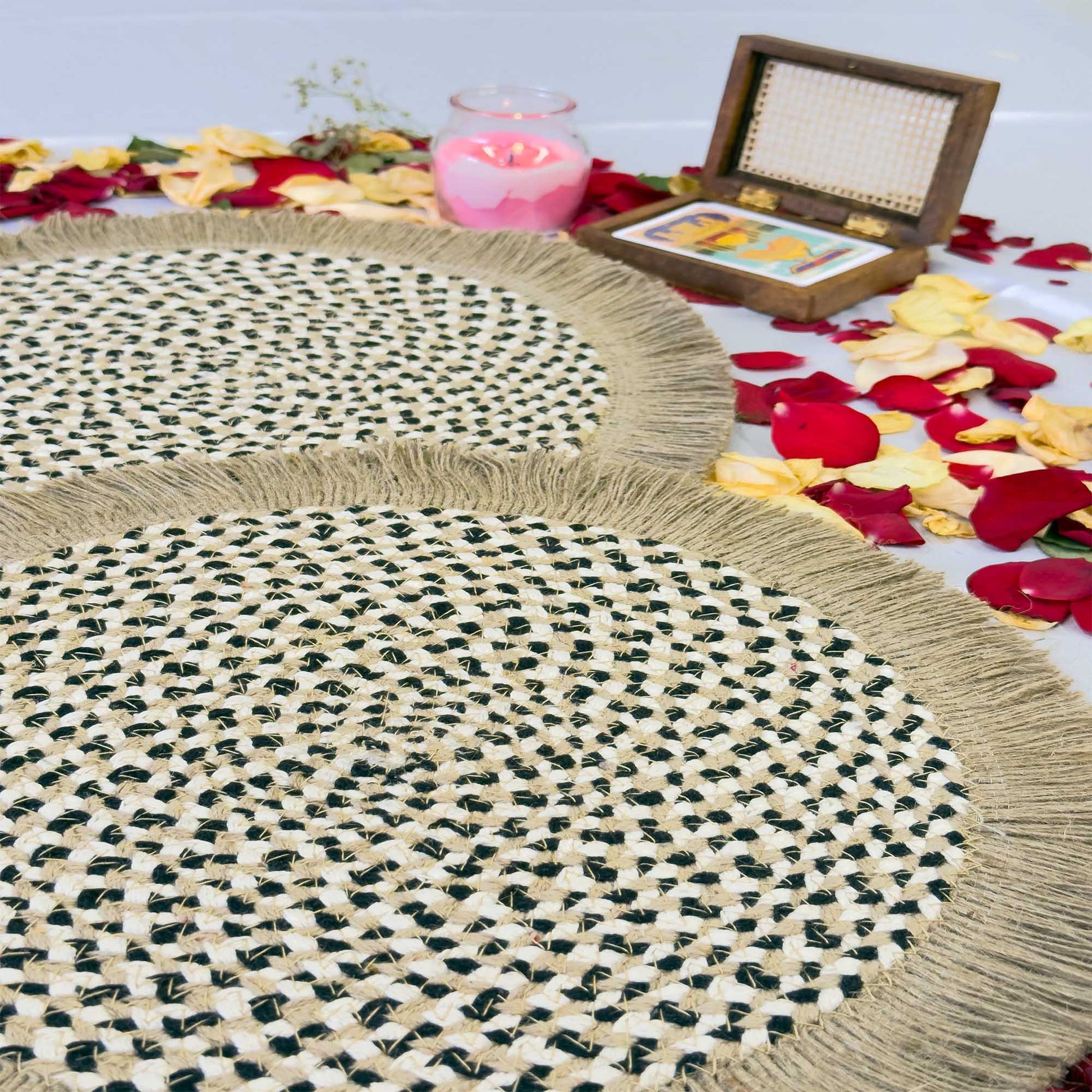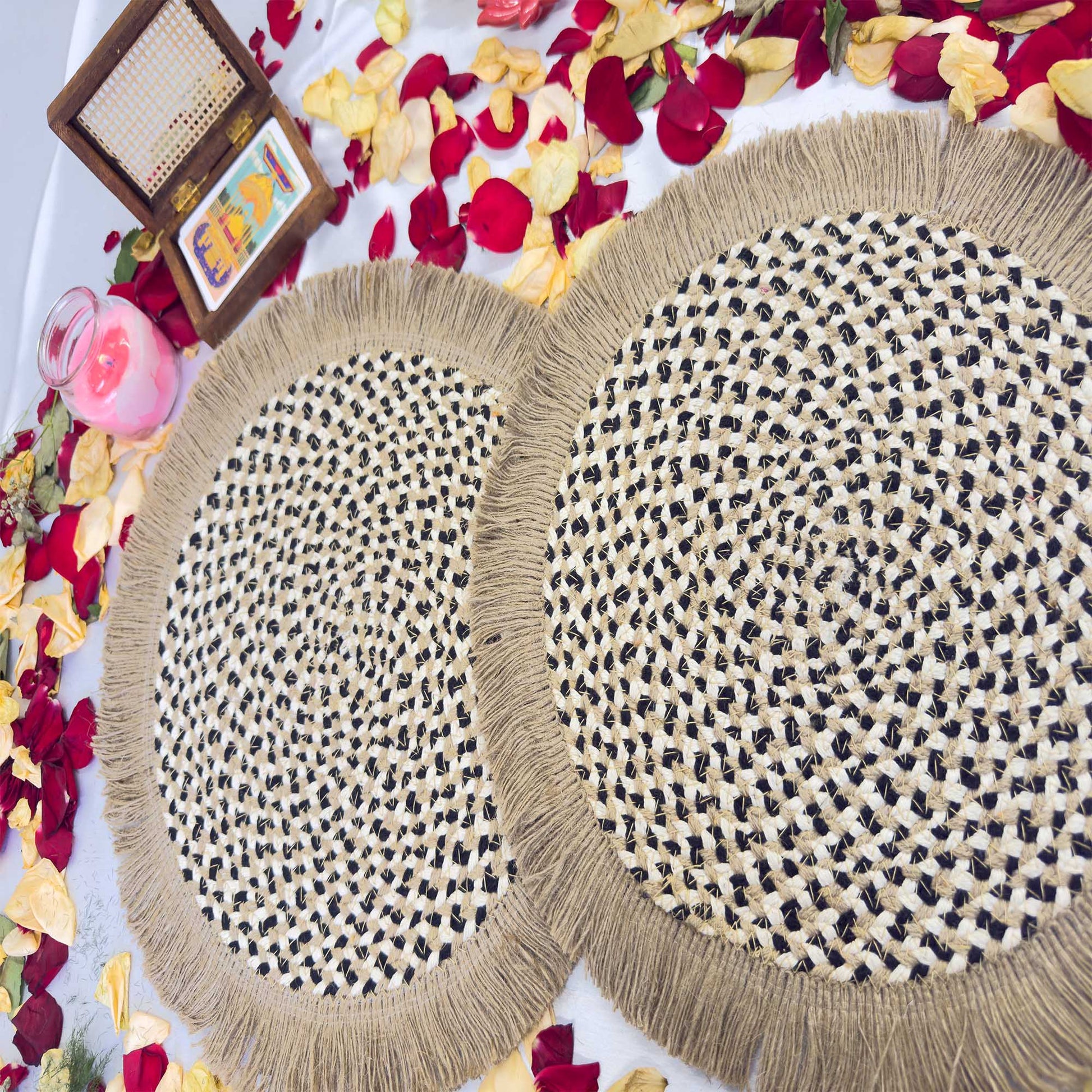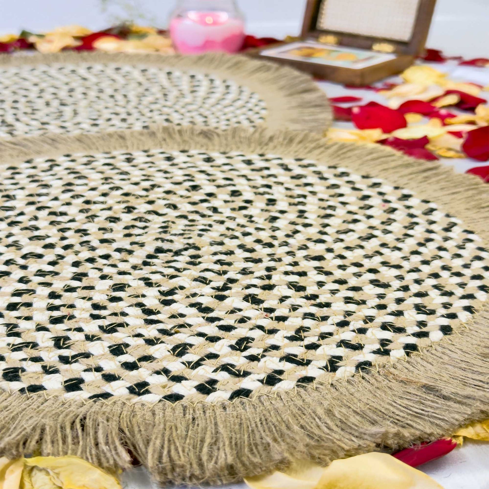 Enhance your dining experience with the Fringe Black and White Table Placemat (Pack of 2) . These eco-friendly placemats are handcrafted from high-quality jute, making them a sustainable and stylish addition to your home. With a natural braided design and a 14-inch diameter, they are perfect for dining tables, bedside tables, center tables, or shelves.
