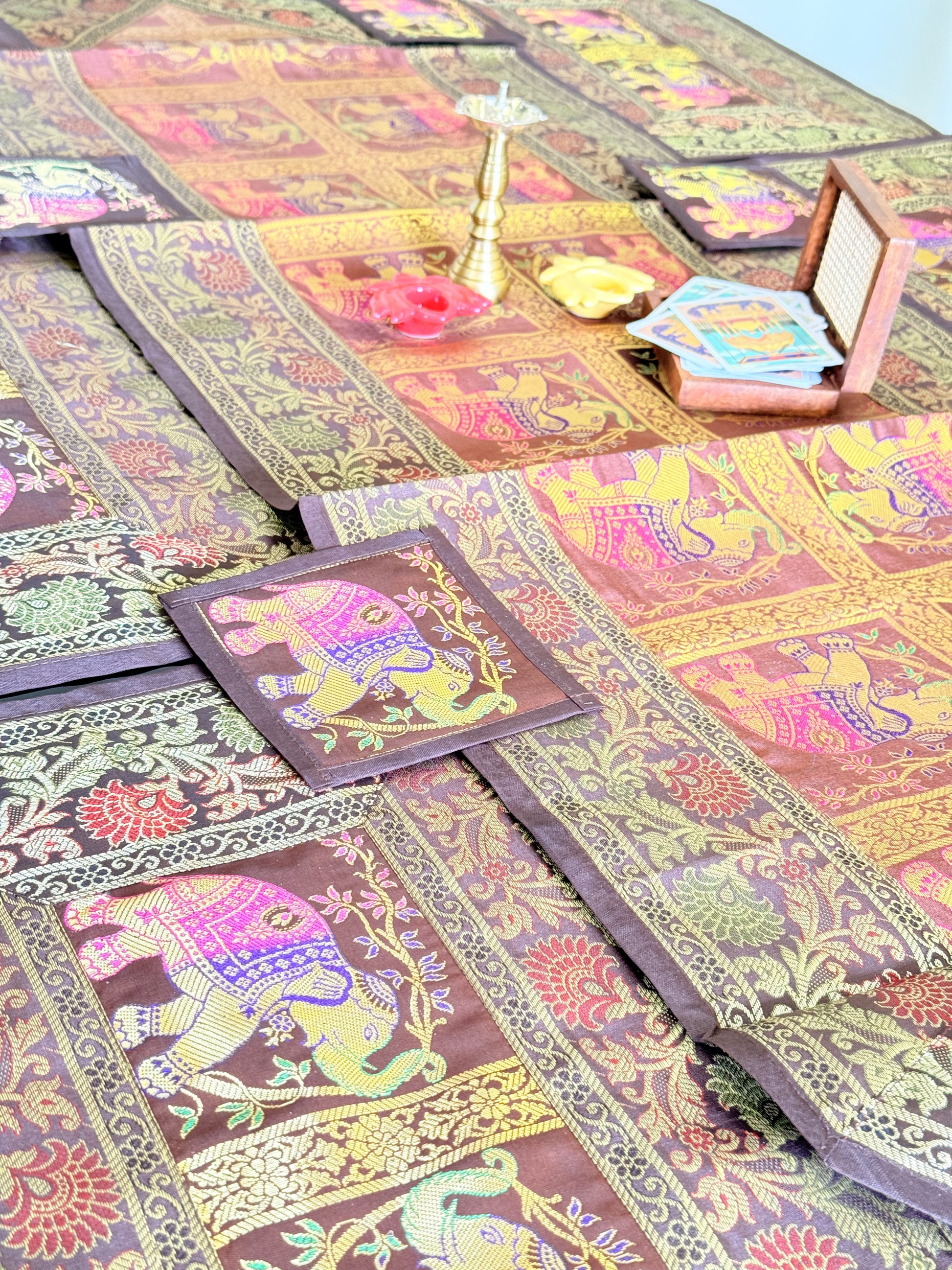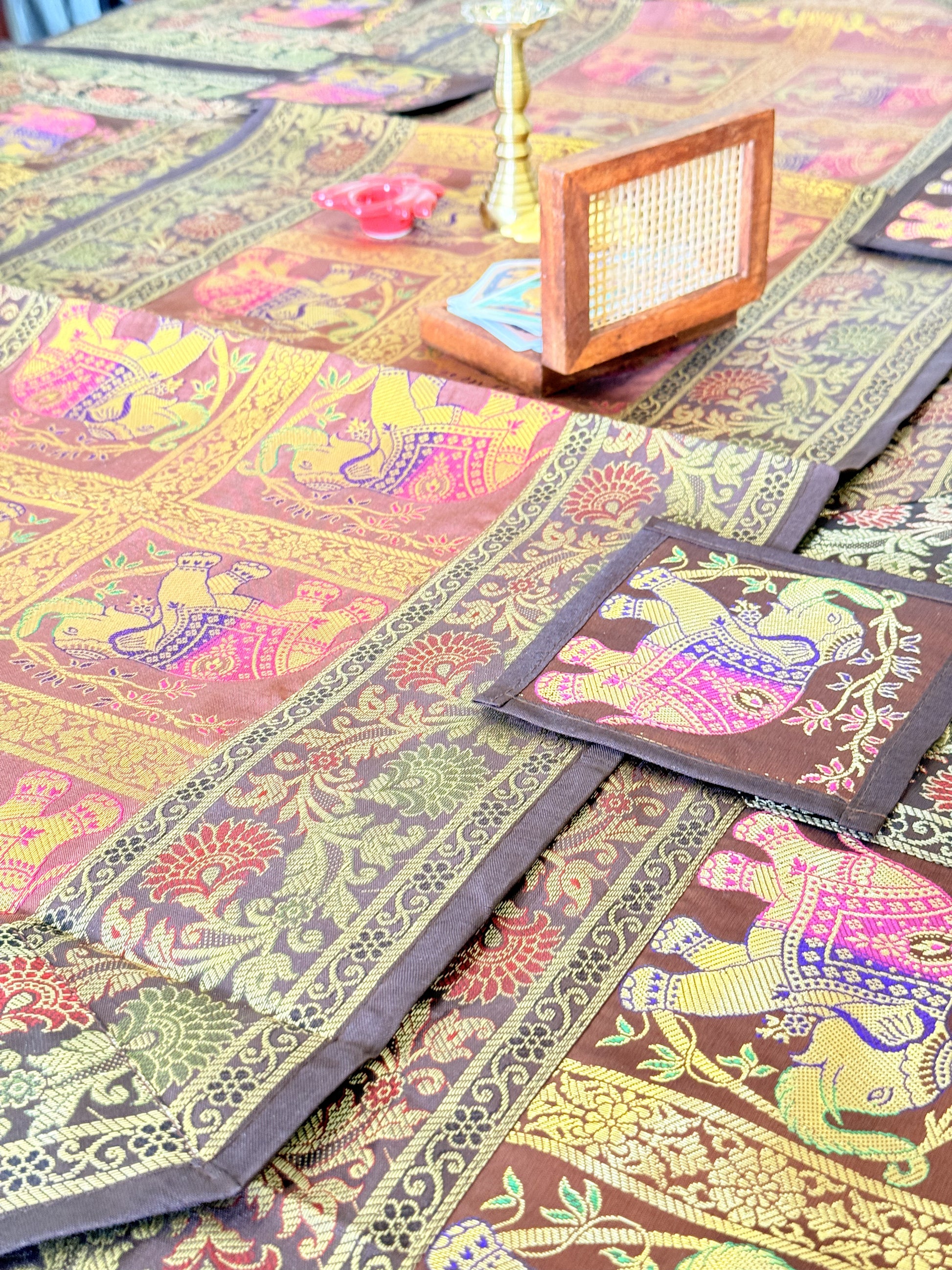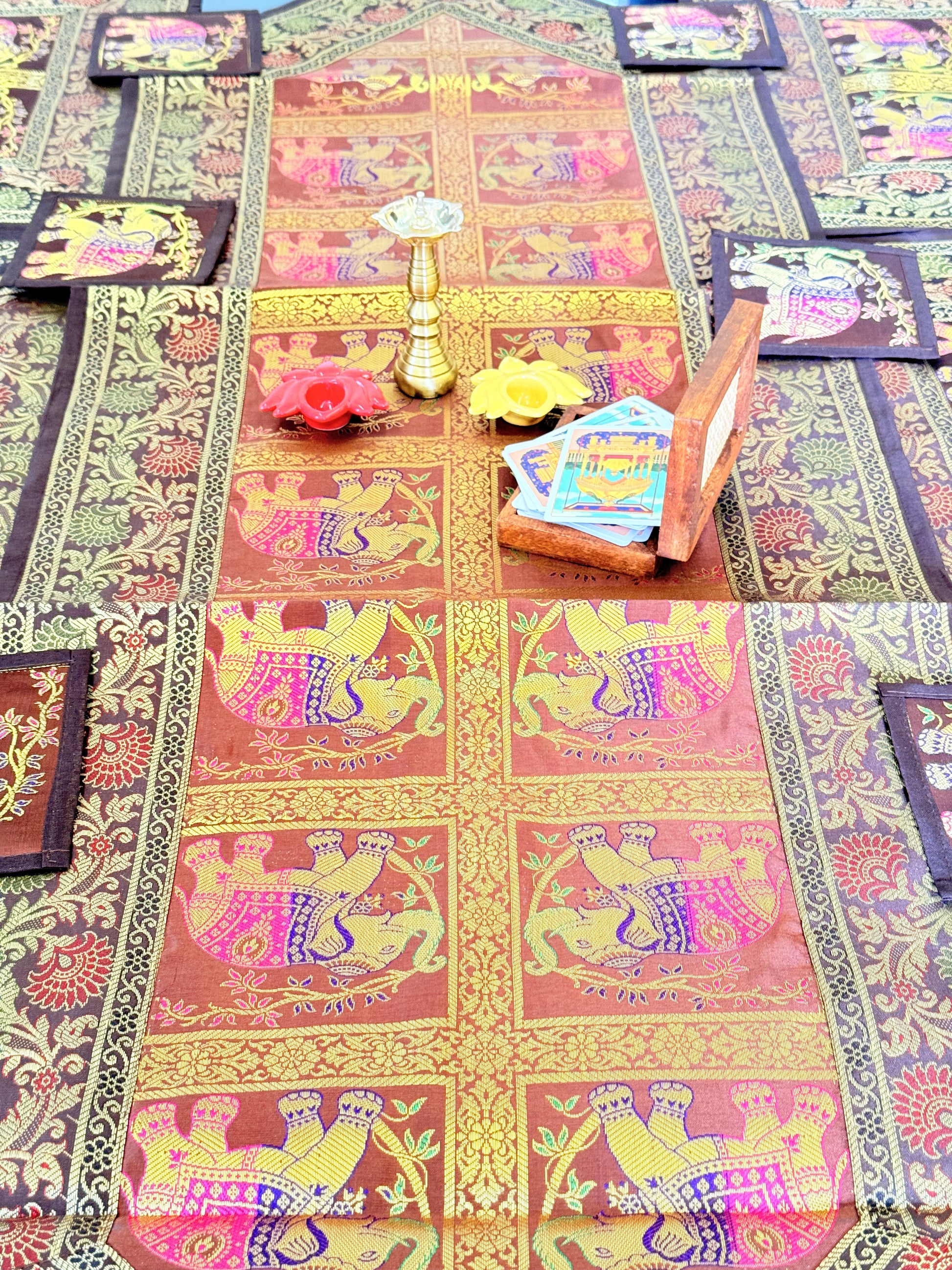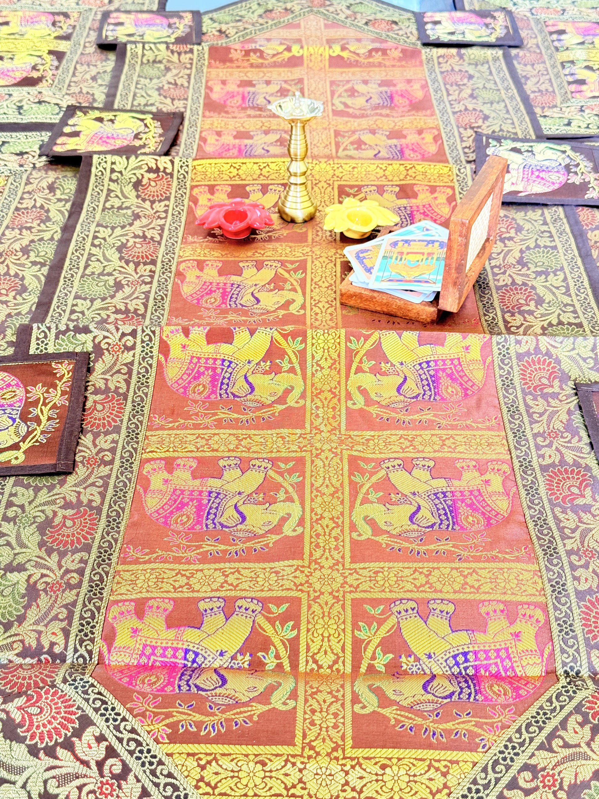 GOLD DECORATIVE FESTIVE BANARASI AILK RUNNER MAT AND COASTER SET