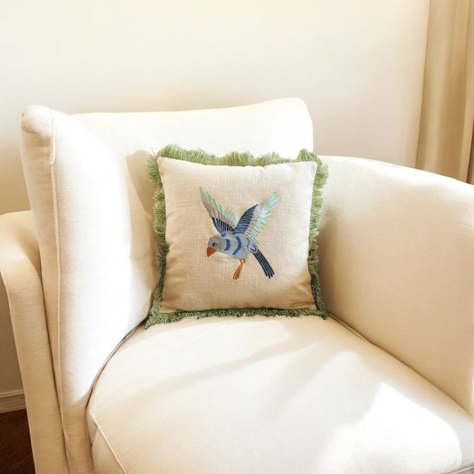 GREEN BIRD FRILL CUSHION COVER