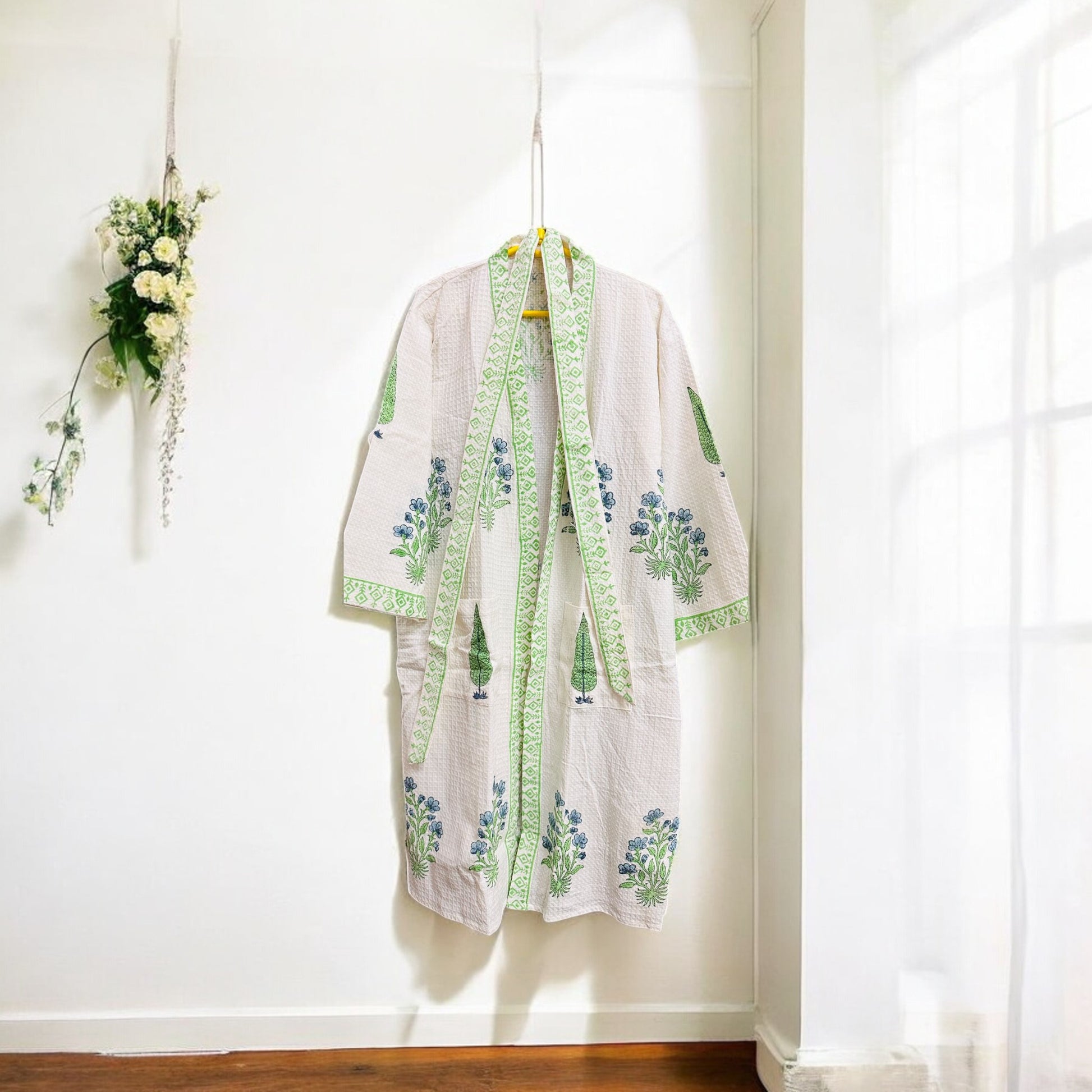 Green and Blue Floral White Handblock Bathrobe – 100% Cotton, Comfortable and Elegant