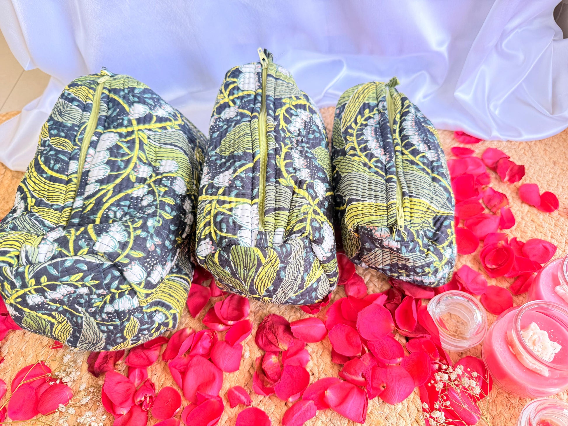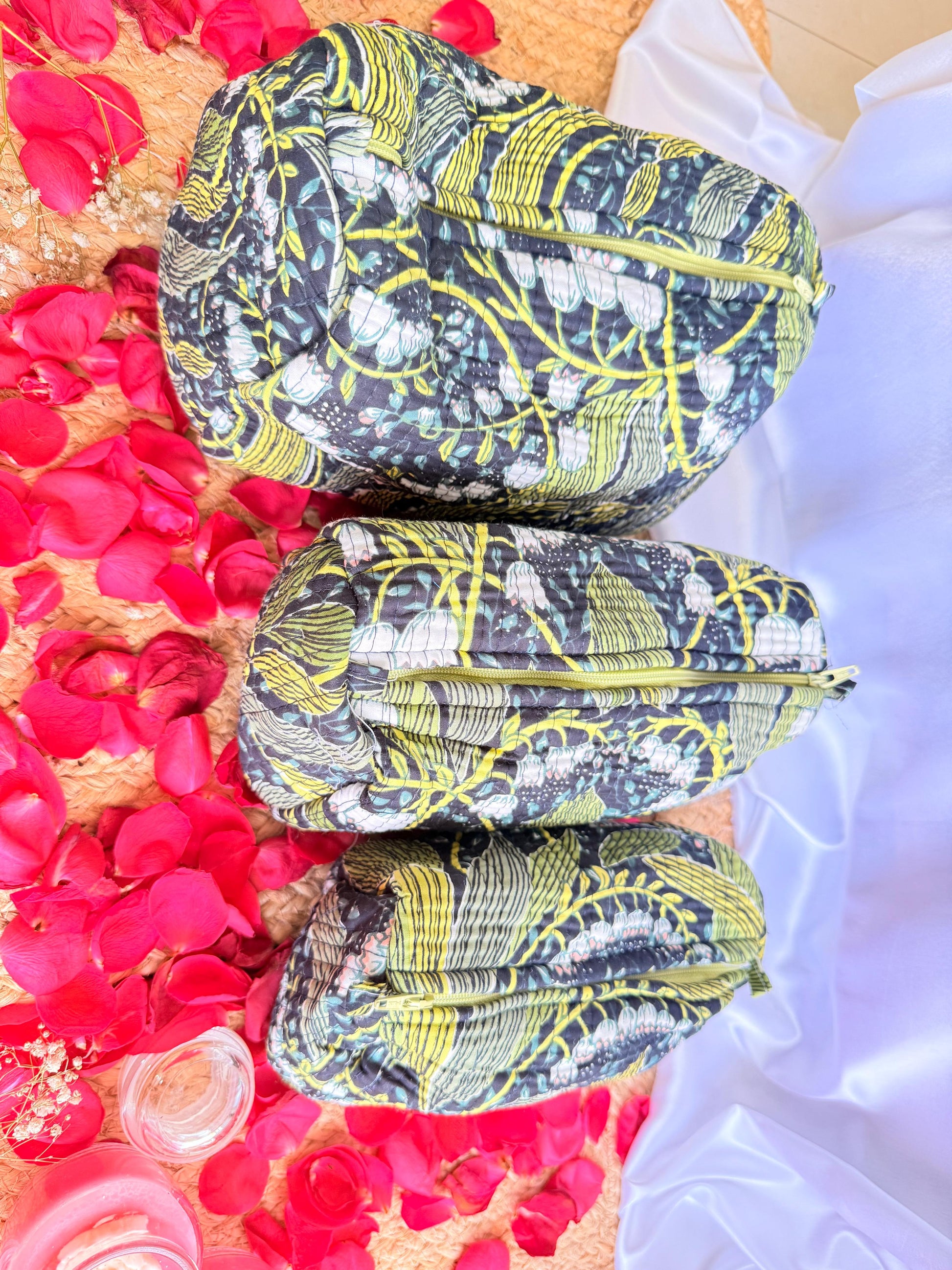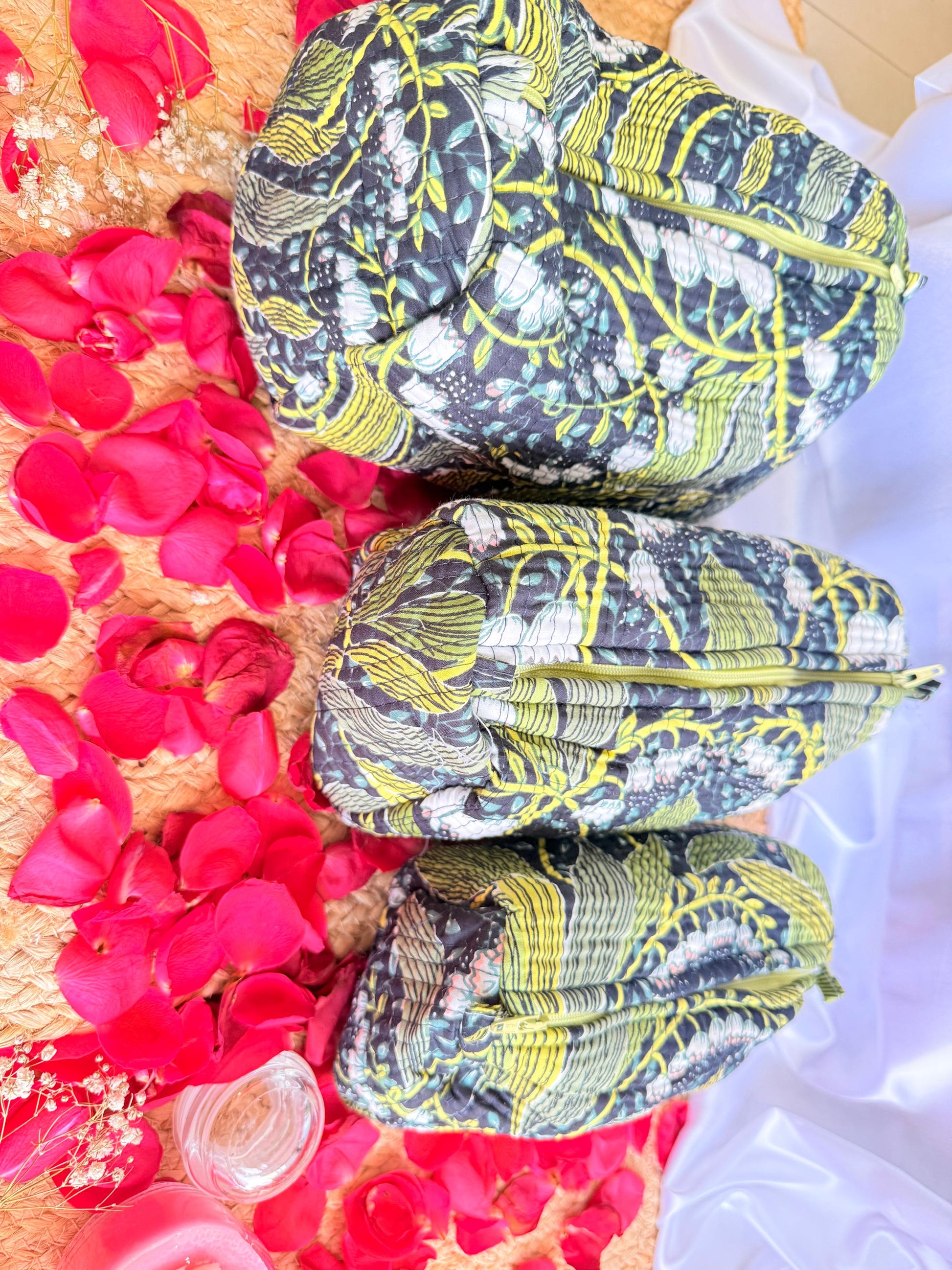 Black Floral Handblock Travel Pouch Organizer Set of 3
