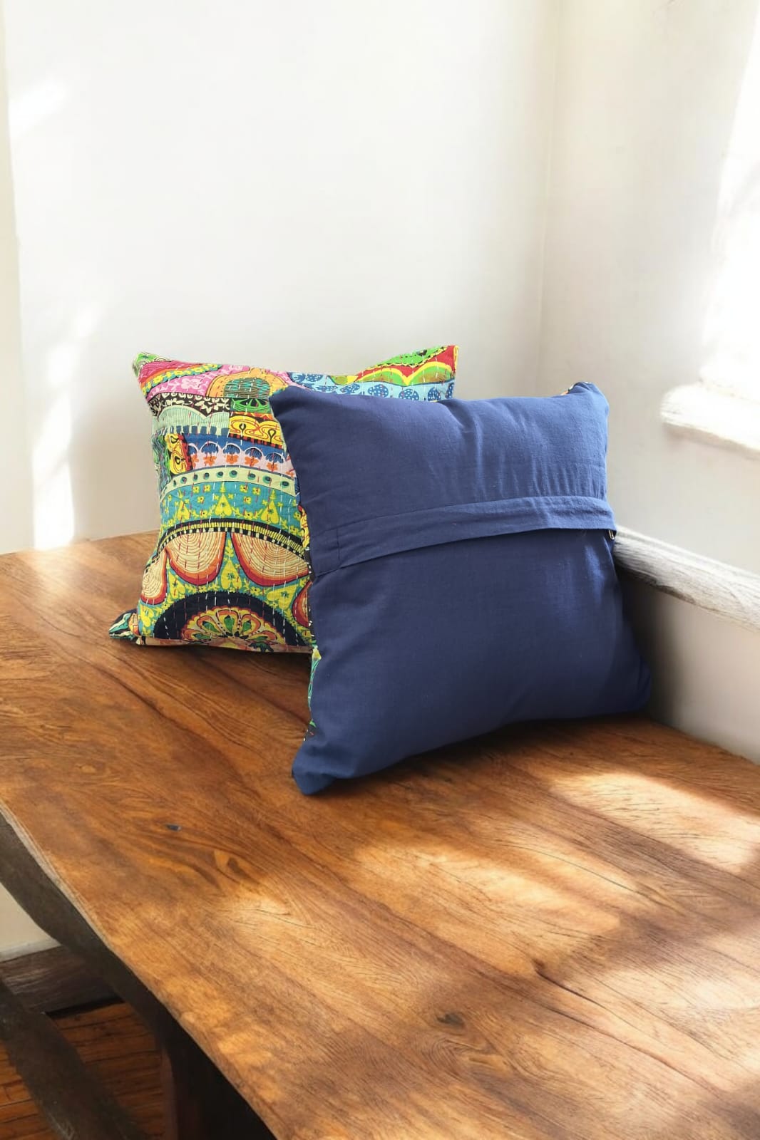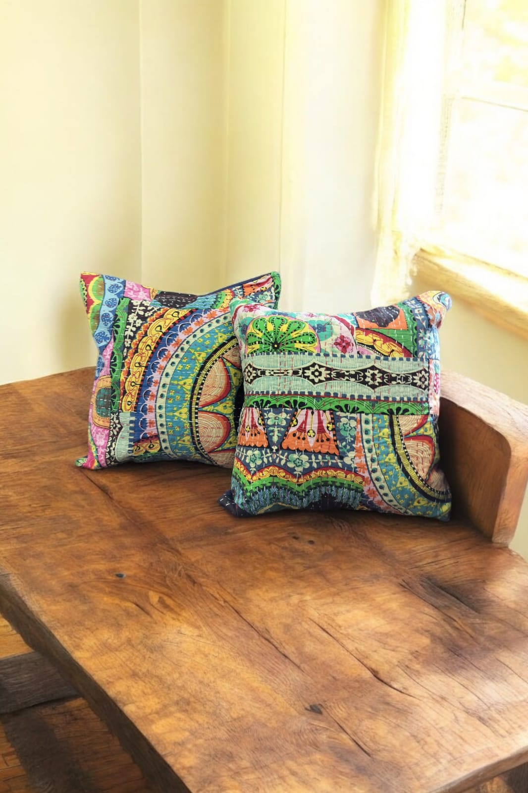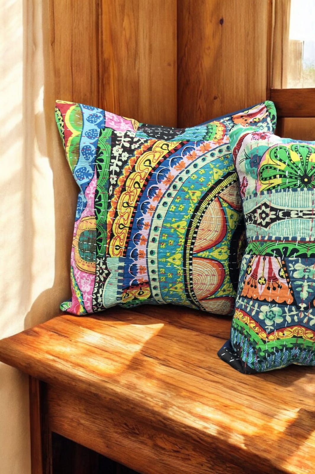 Elevate your home decor with our GREEN BASE MULTICOLOURED KANTHA CUSHION COVER. The vibrant and intricate kantha stitching adds an artistic touch to any room. Made from high-quality materials, this cover is both stylish and durable. Bring a burst of color and texture to your living space with this unique cushion cover.