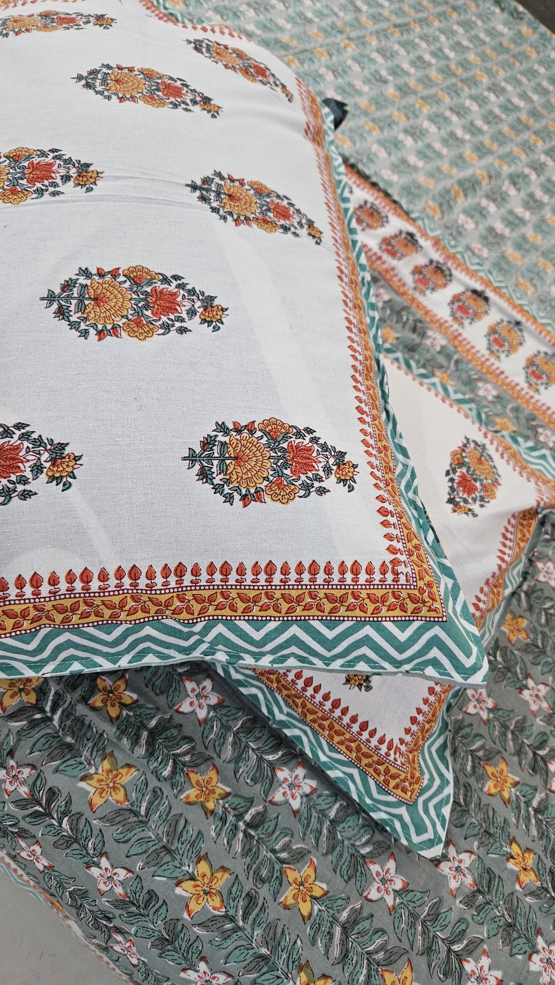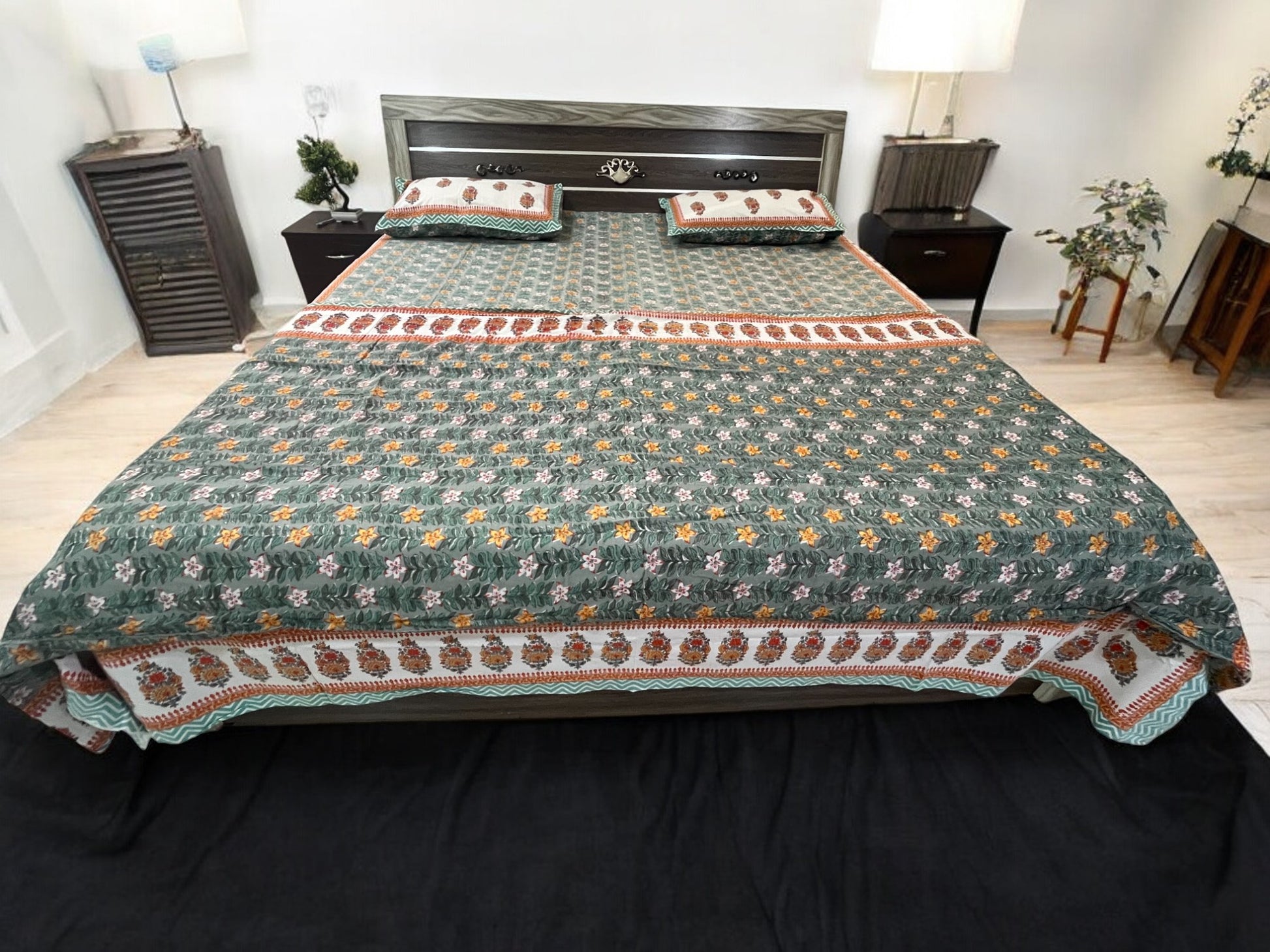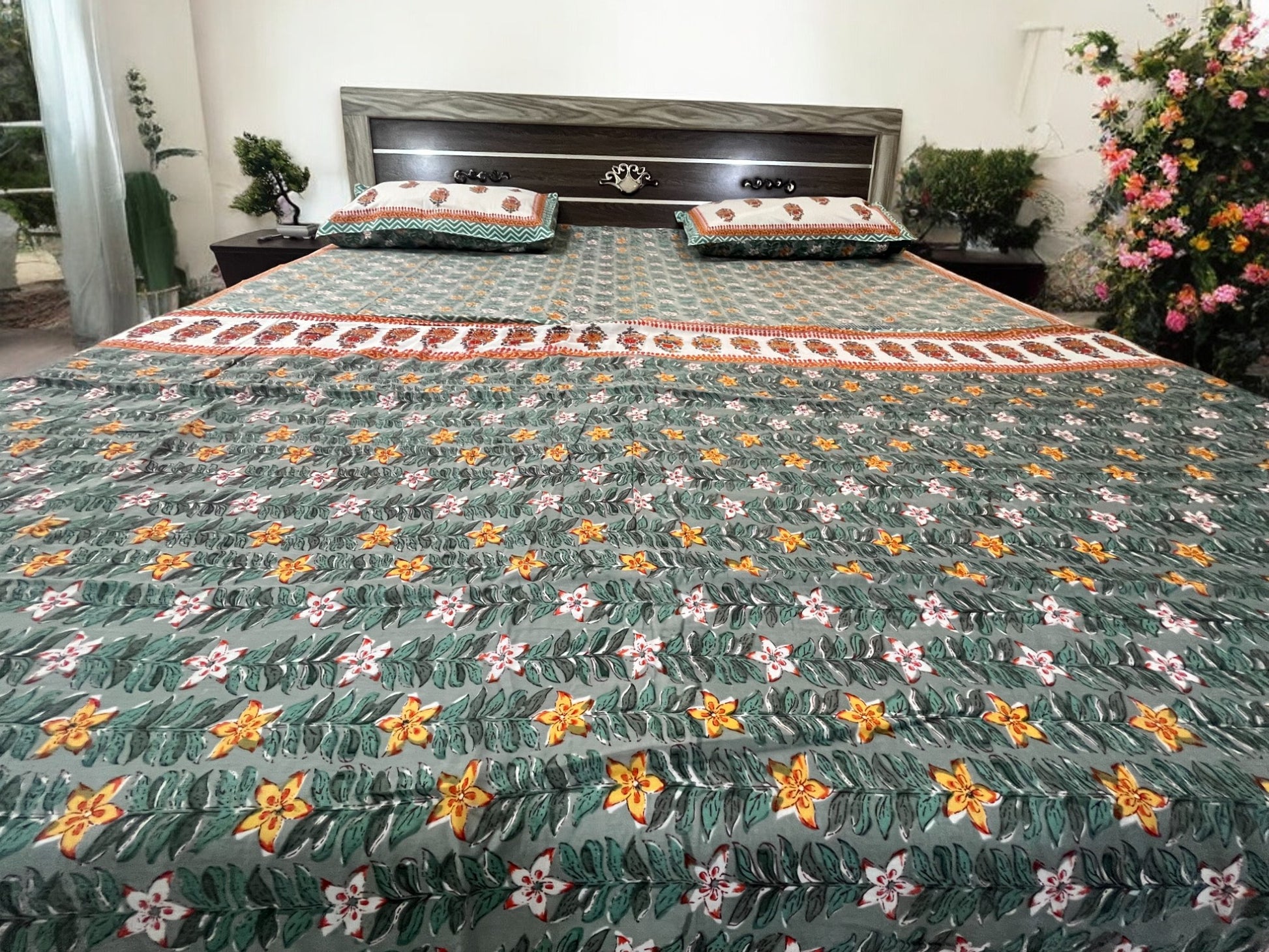 Crafted from 100% soft cotton, this premium Green Floral Printed Double dohar brings a vibrant, fresh feel to your bedroom décor. Featuring a beautiful floral design in rich green tones, this set includes a double bedsheet and two double bed dohars, offering comfort, warmth, and style. Perfect for everyday use or special occasions, this set will add a soothing and lively atmosphere to your room.