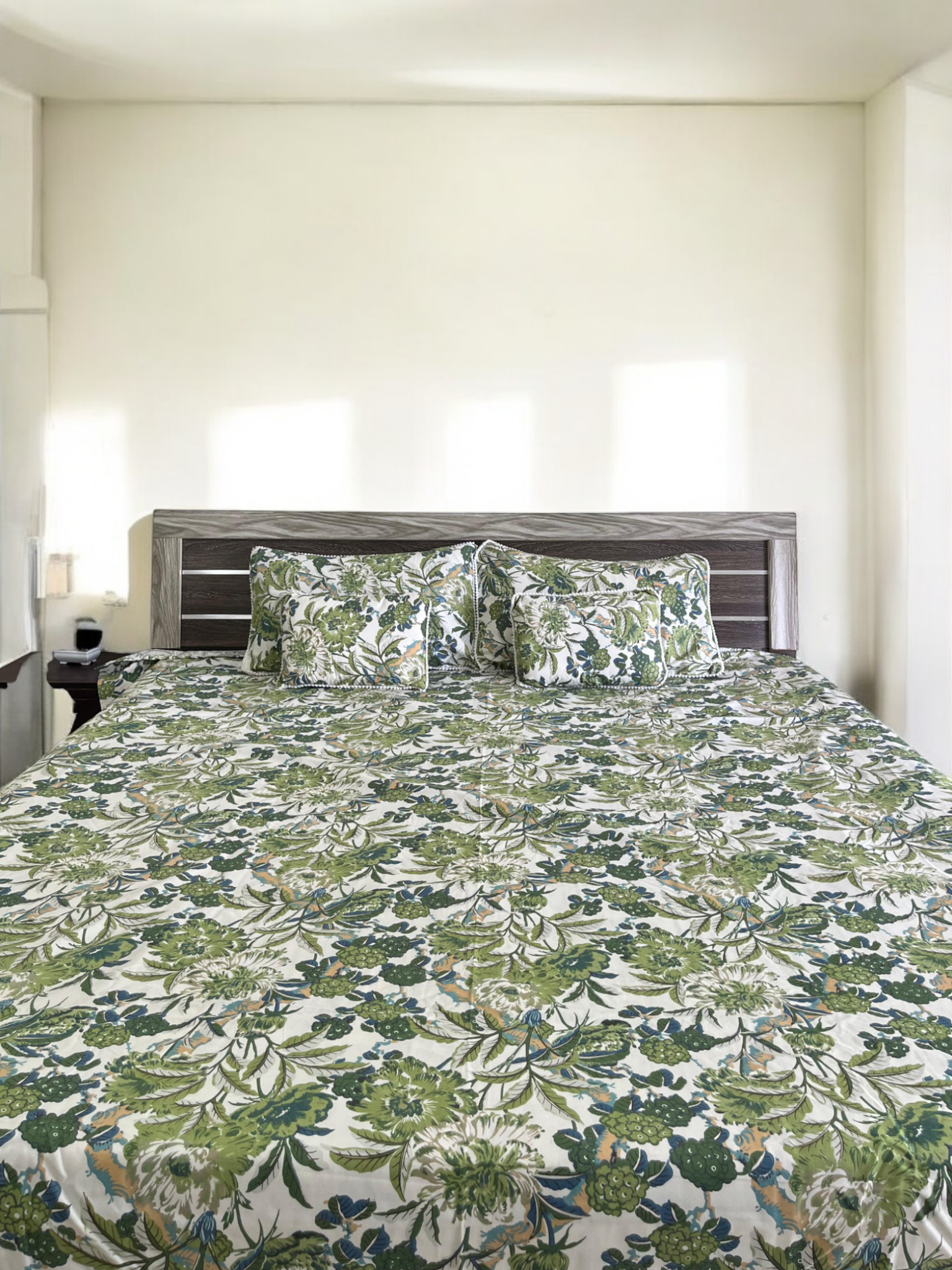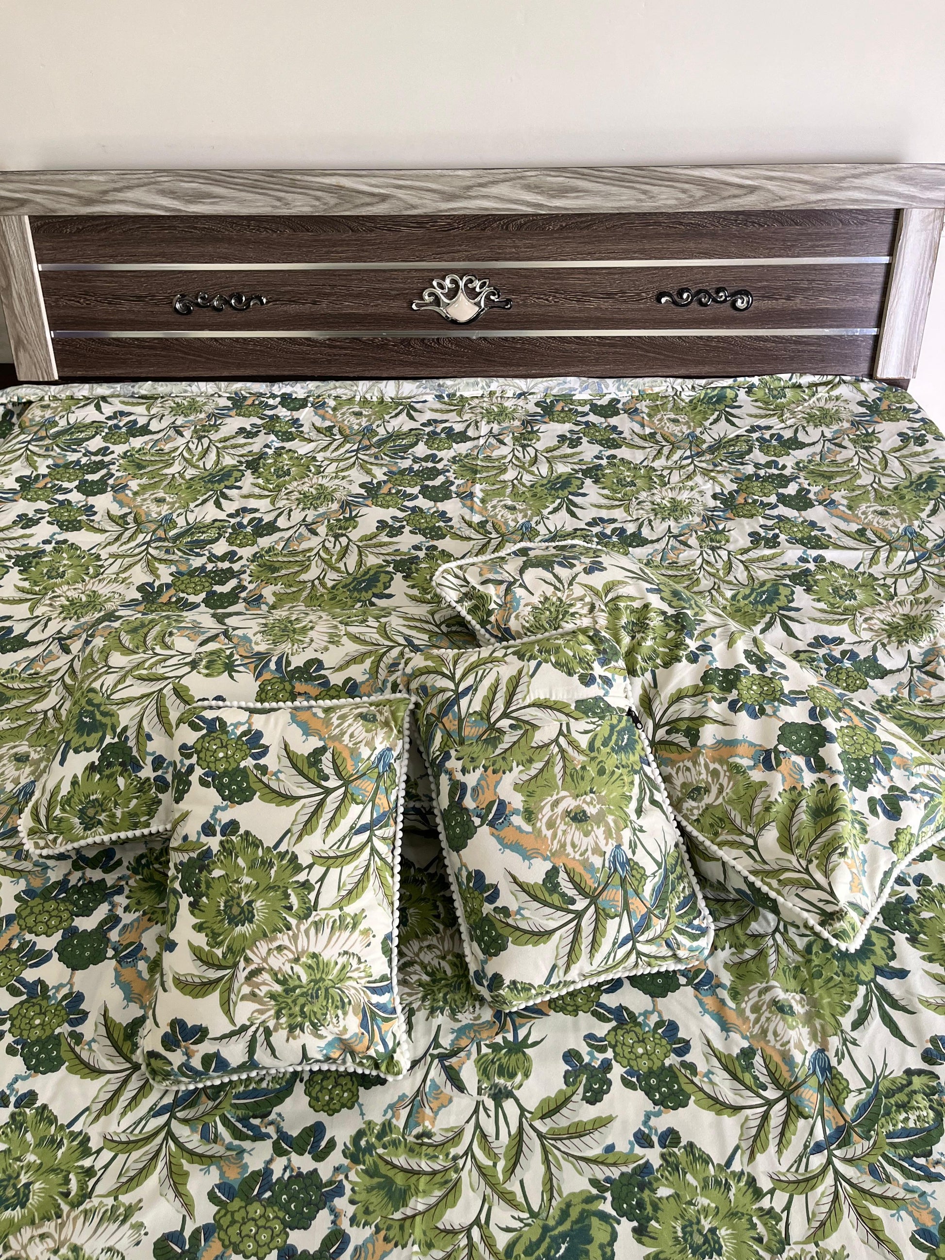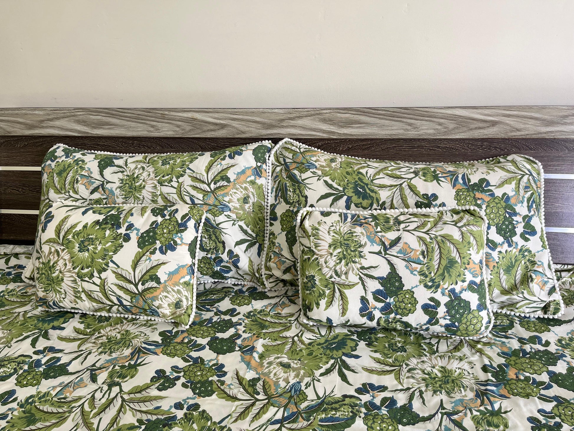 Green Garden Double Bedsheet with 2 Frill Pillows and 2 Cushion Covers
