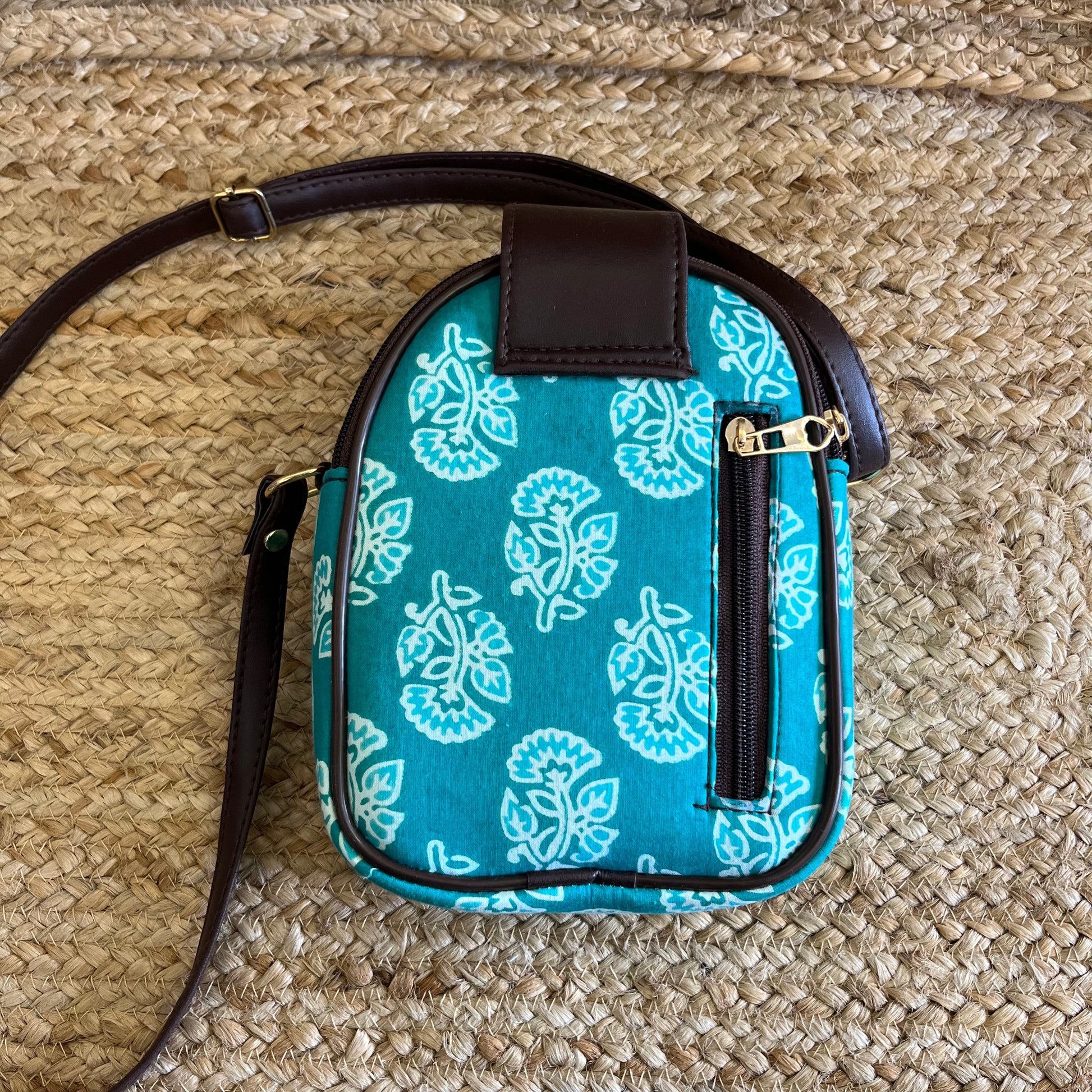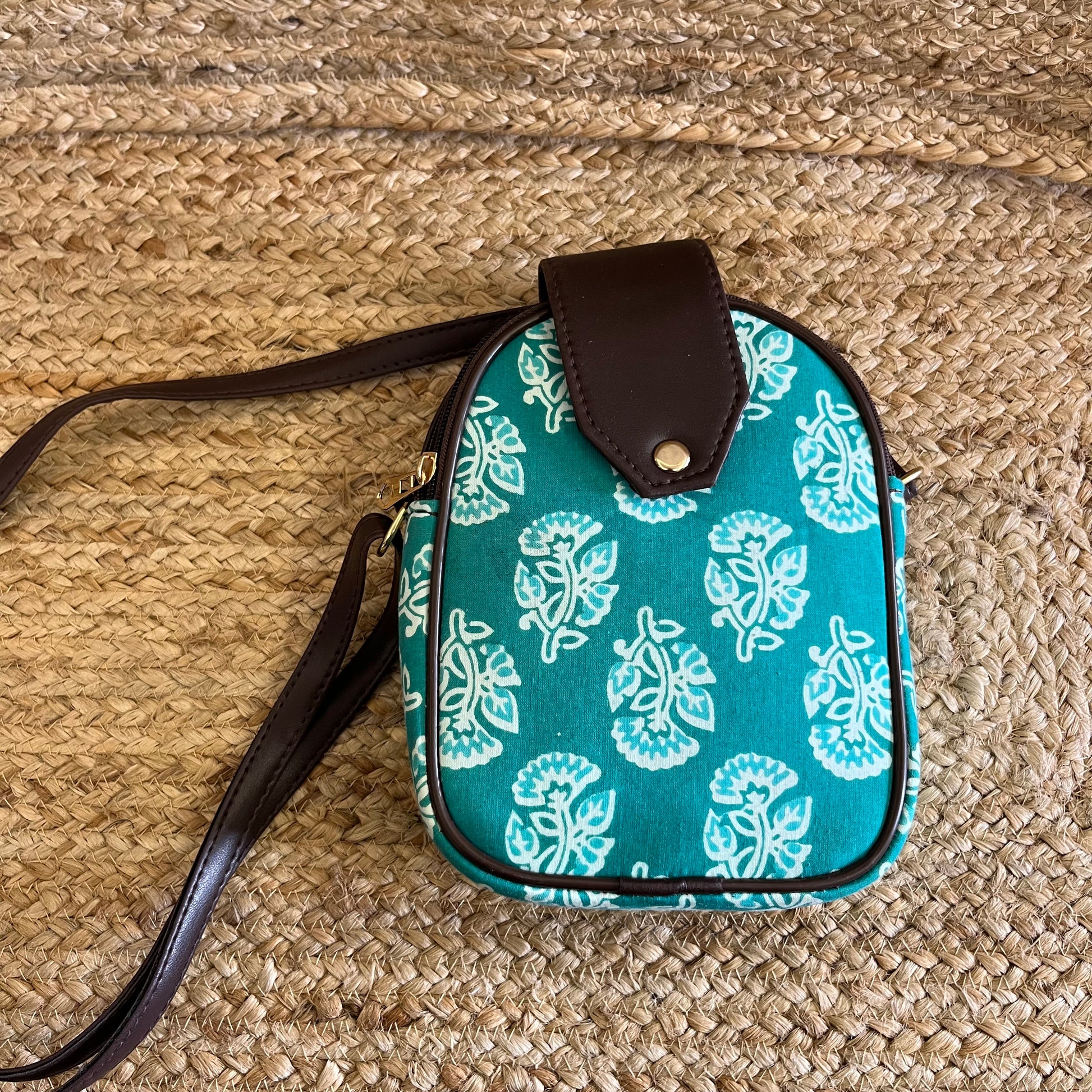 Green Handblock Printed Mobile Sling Bag