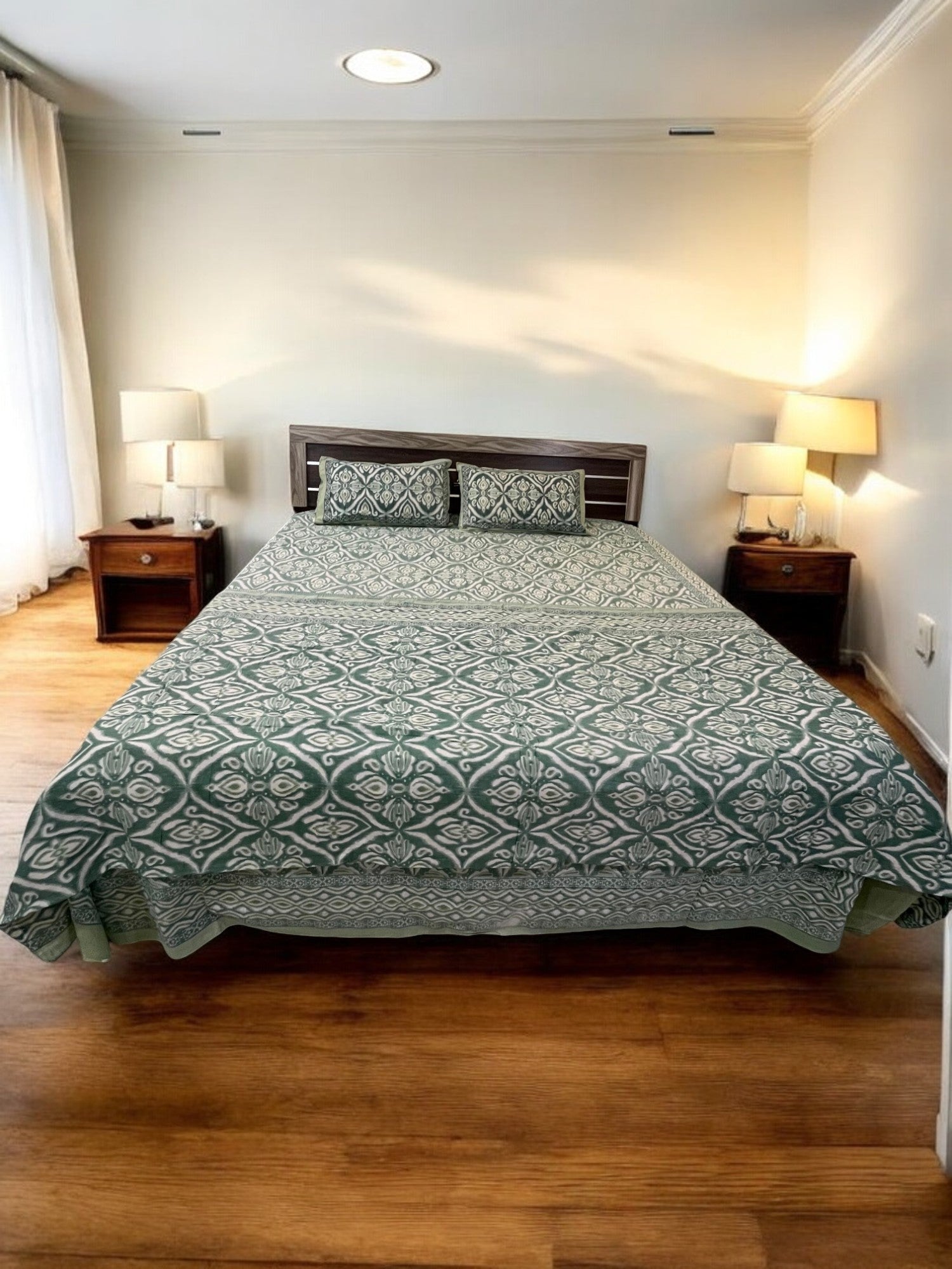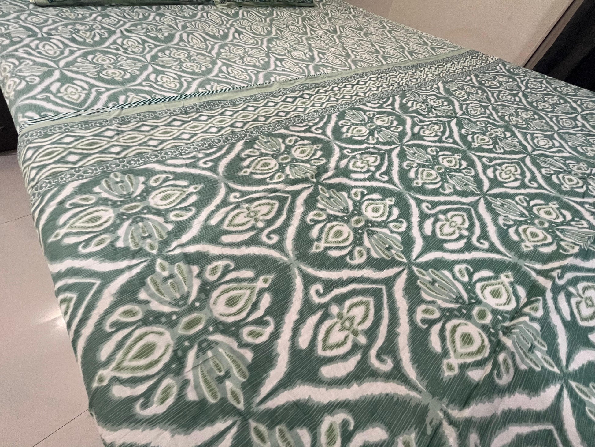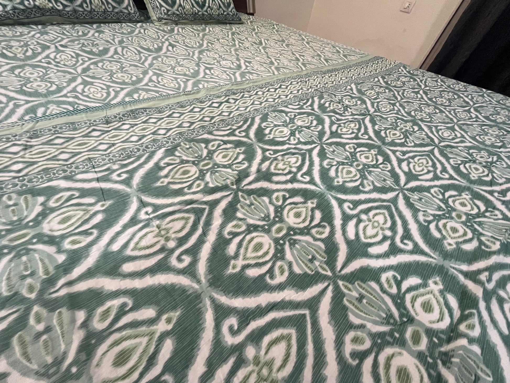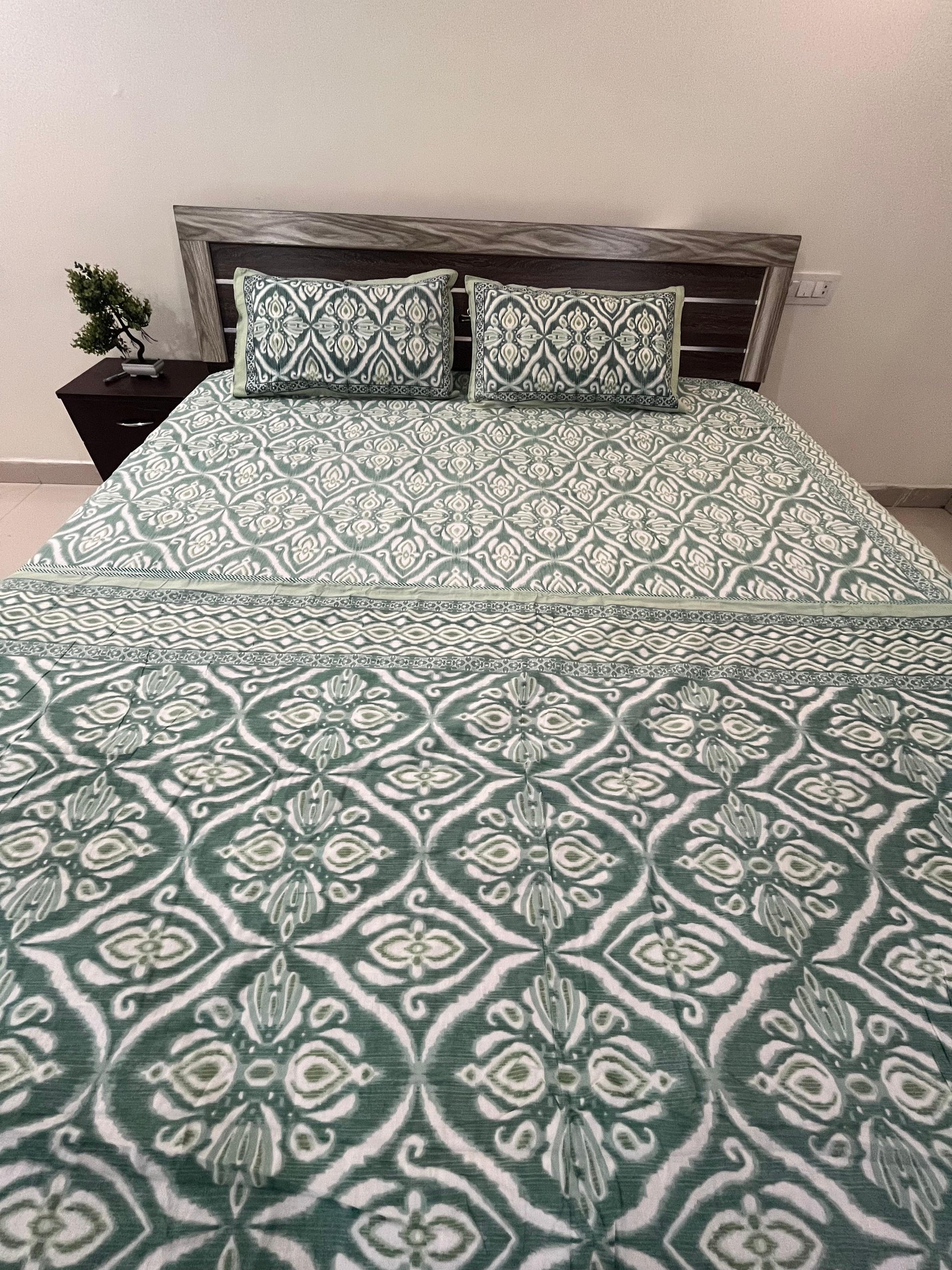 Crafted from 100% soft cotton, this premium Green Ikat Style Double dohar set adds a bold, traditional touch to your bedroom décor. Featuring a unique Ikat pattern, this set includes a double bedsheet, matching dohar, and two pillow covers—everything you need to create a stylish and cozy environment. Perfectly tailored for double beds, this set combines comfort, durability, and artistry, making it ideal for everyday use or special occasions.