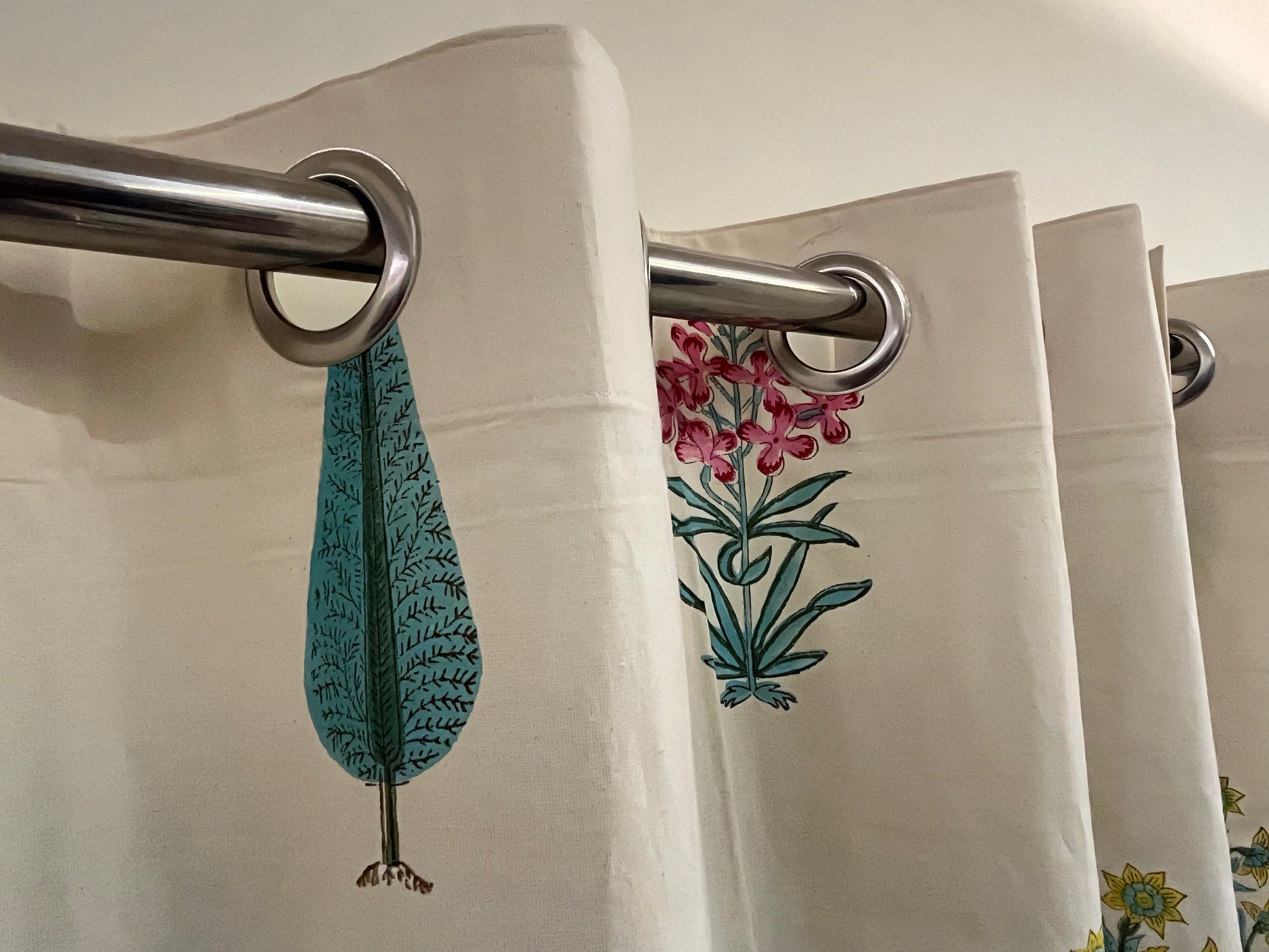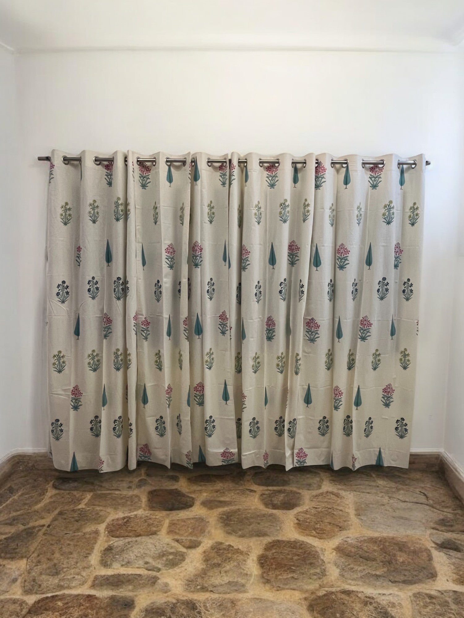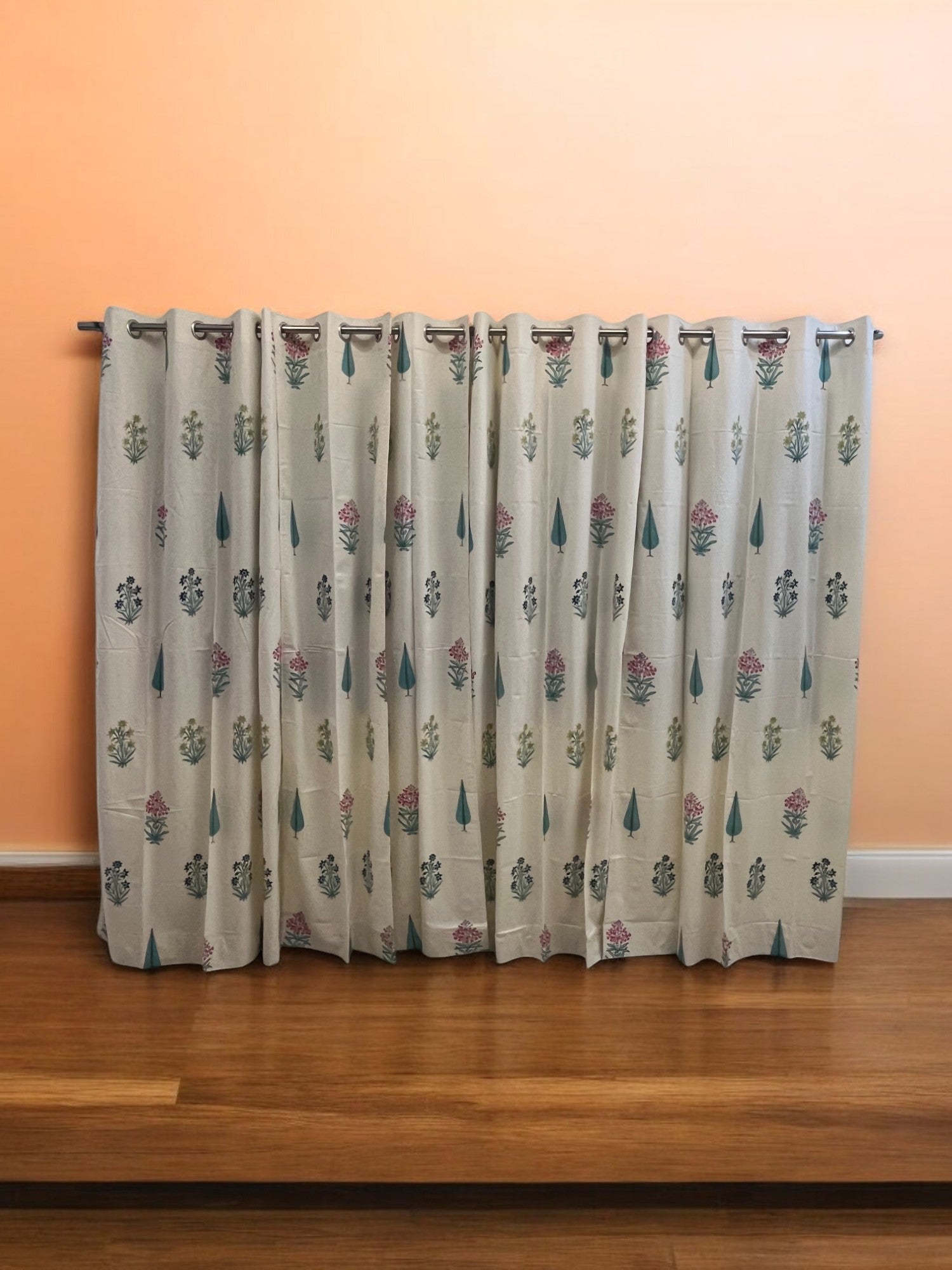 GREEN LEAF FLORAL WHITE HAND BLOCK CURTAIN SET OF 2