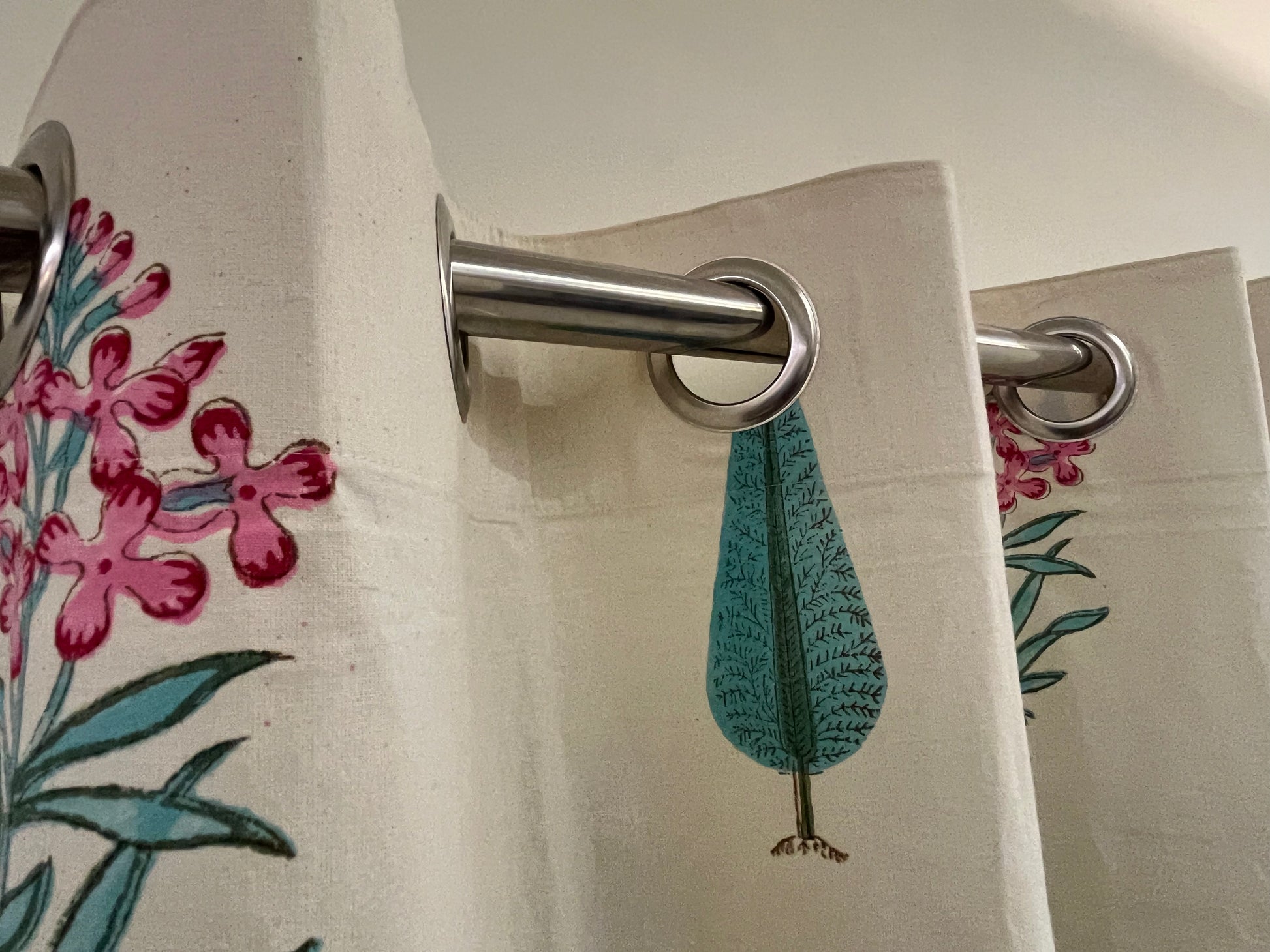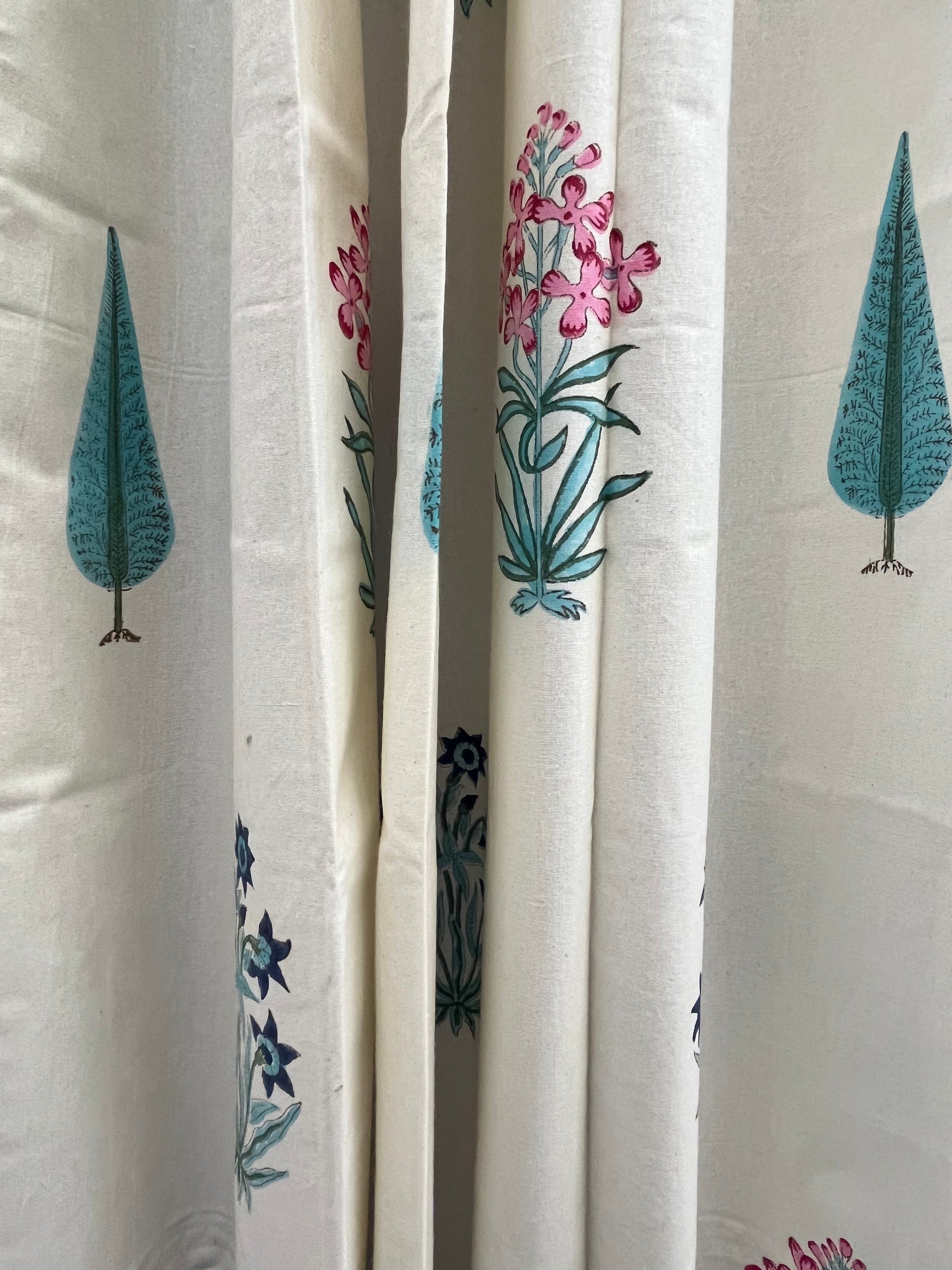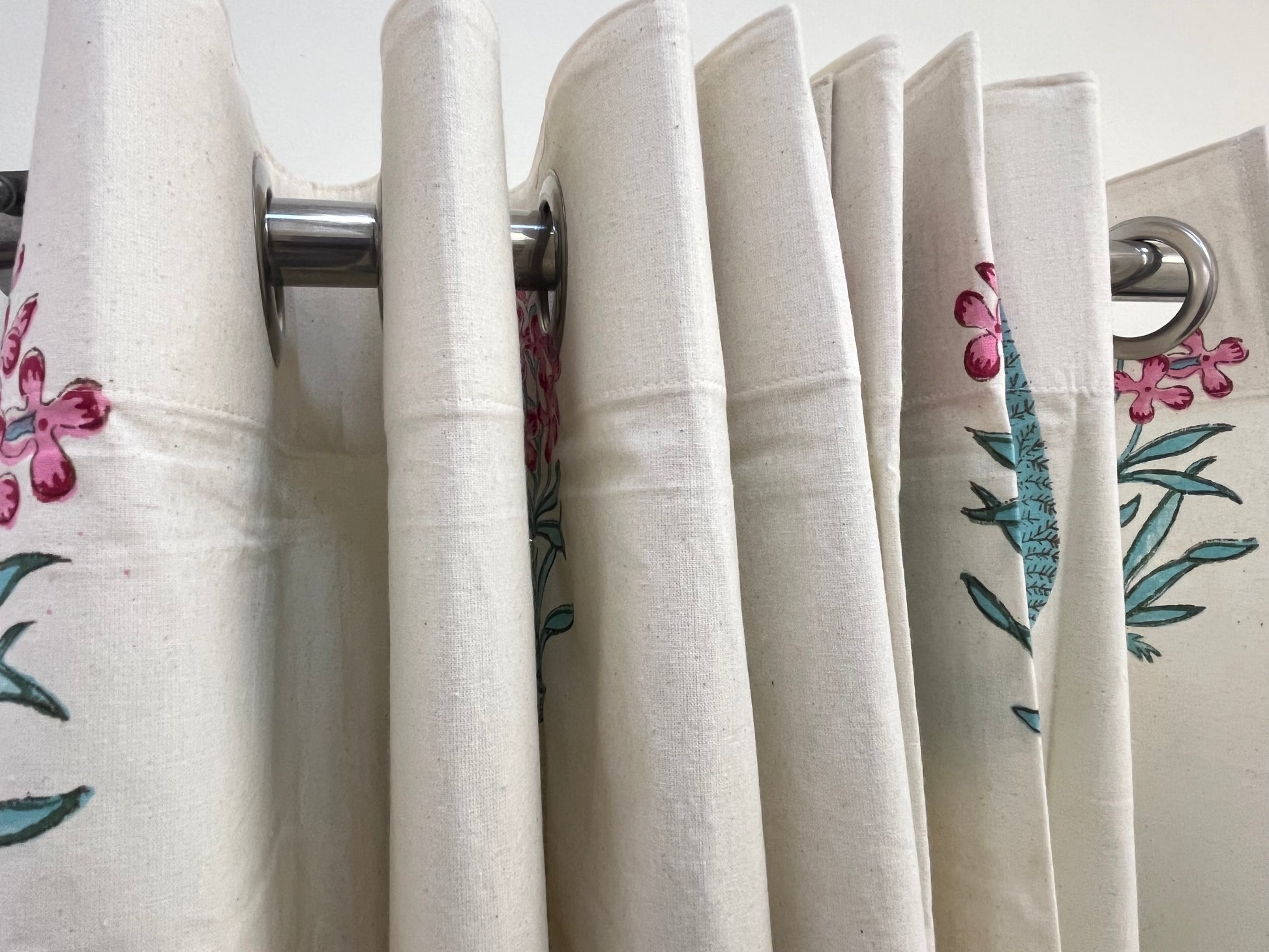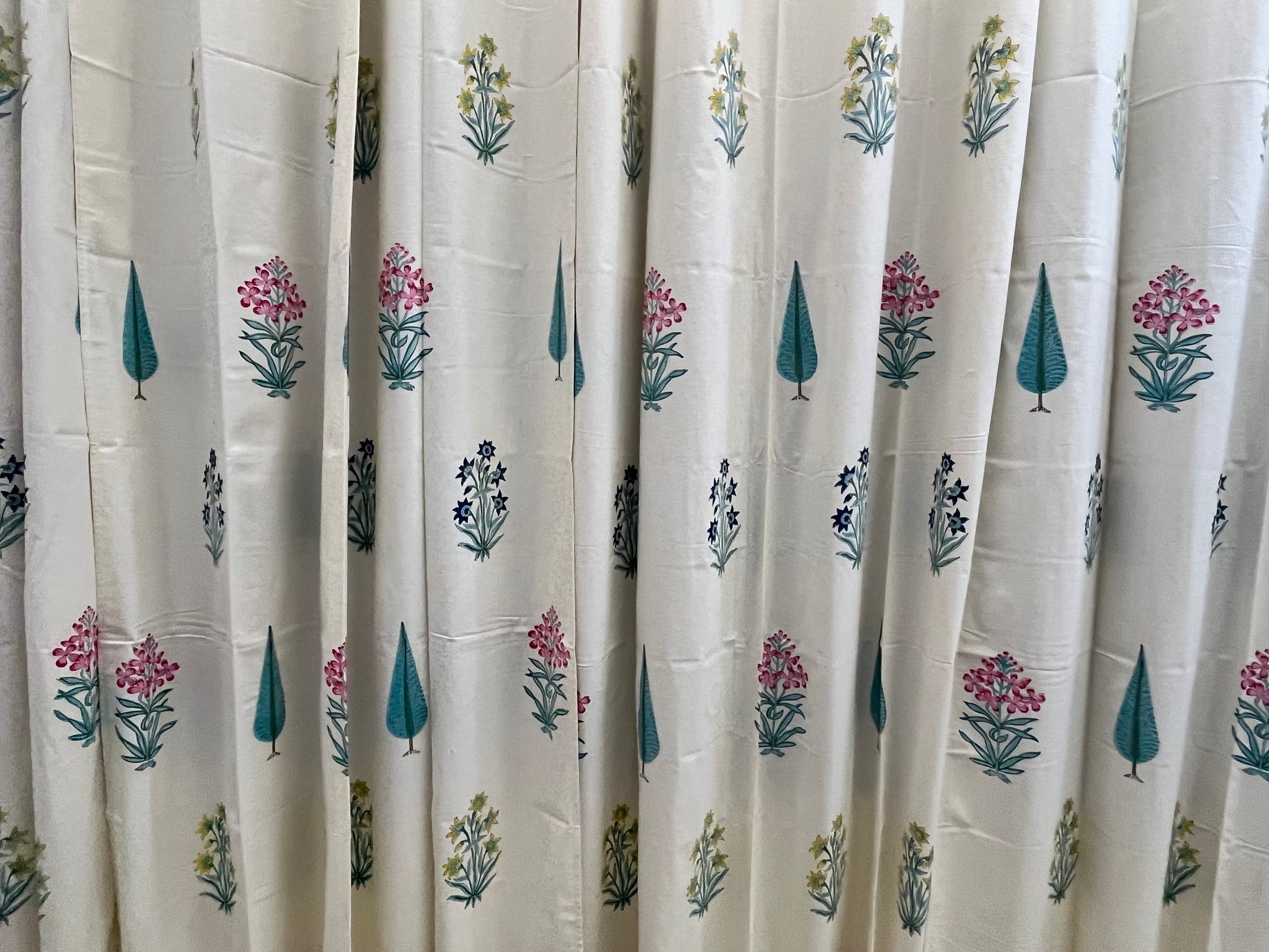 GREEN LEAF FLORAL WHITE HAND BLOCK CURTAIN SET OF 2