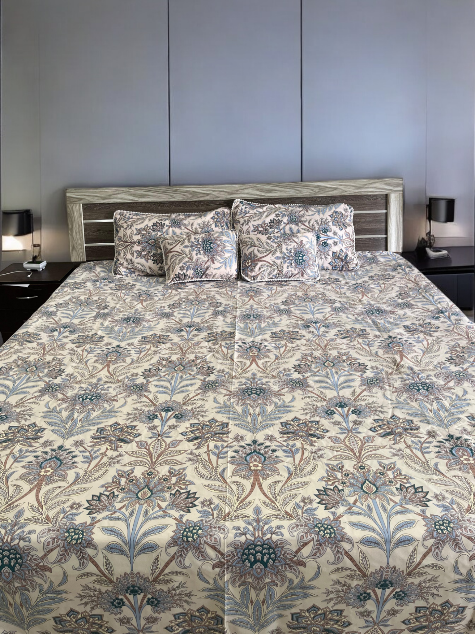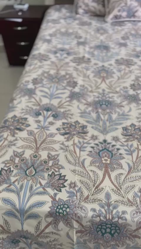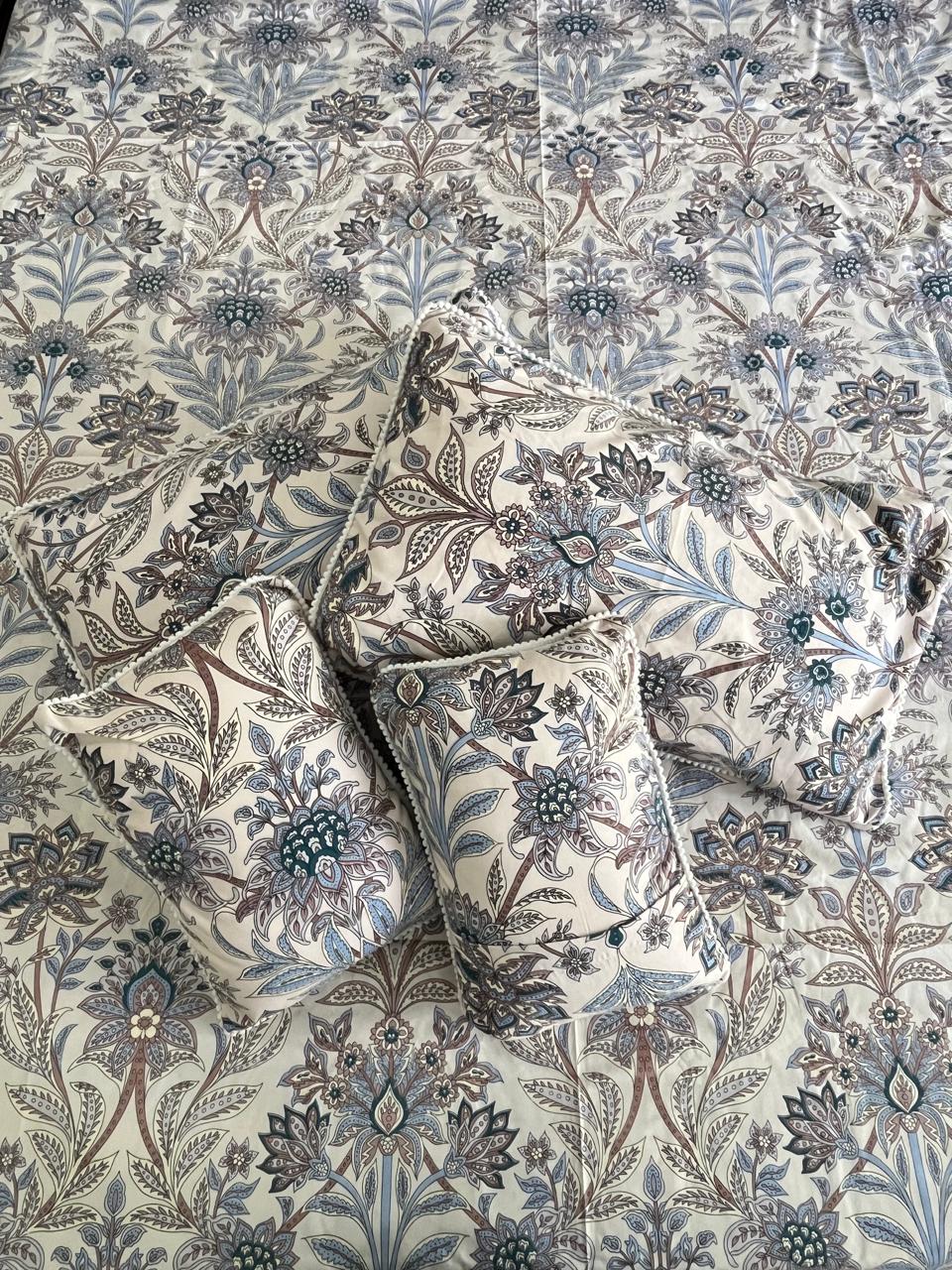 Blue Floral Print Double Bedsheet with 2 Frill Pillows and 2 Cushions