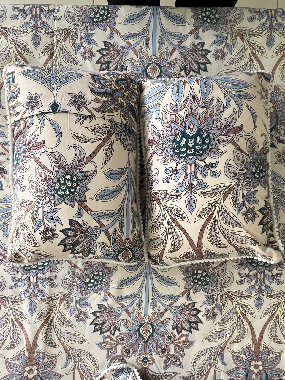 - Design: Blue Floral Print with Frill Pillows and Cushion Covers