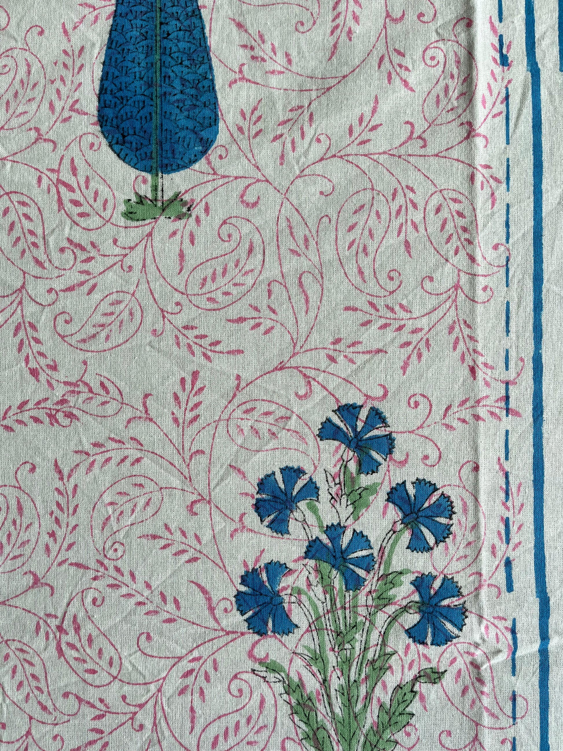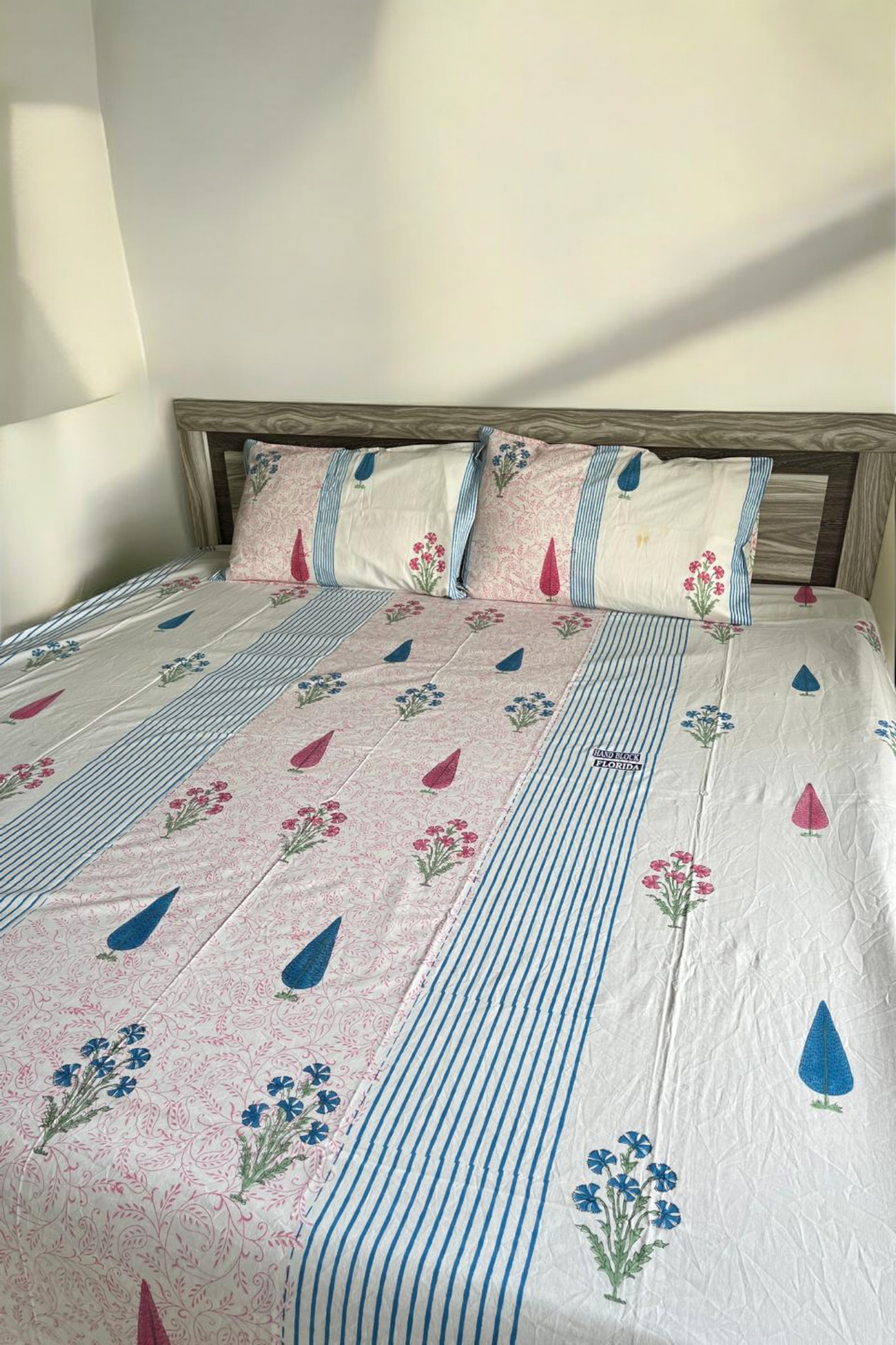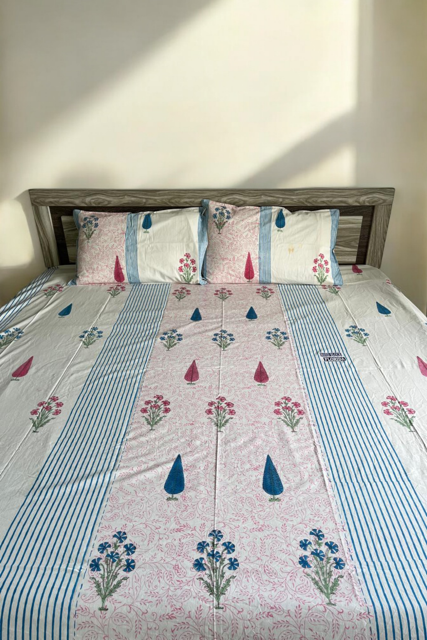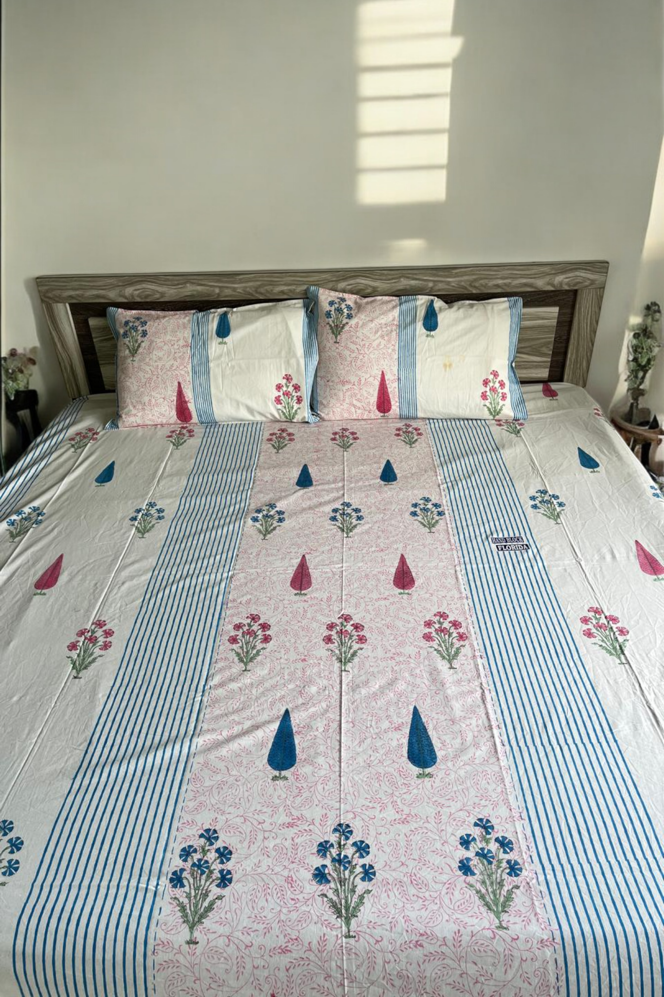 Add a vibrant touch to your bedroom with the Handblock Blue and Pink Stripes Bedsheet. Crafted from premium cotton, this eco-friendly bedsheet features a stunning blend of blue and pink stripes created with traditional Indian Handblock printing techniques. Perfect for double beds, it combines modern style, comfort, and durability. Ideal for everyday use or special occasions, this Handblock bedsheet is a must-have for your home decor. Shop now and transform your space with timeless elegance!