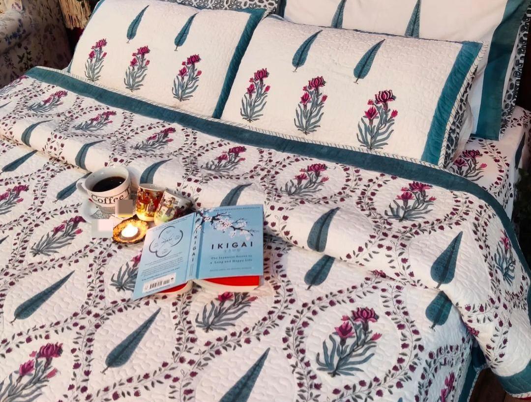 - Design: Handblock Quilted Reversible Bedcover with 2 Pillow Covers