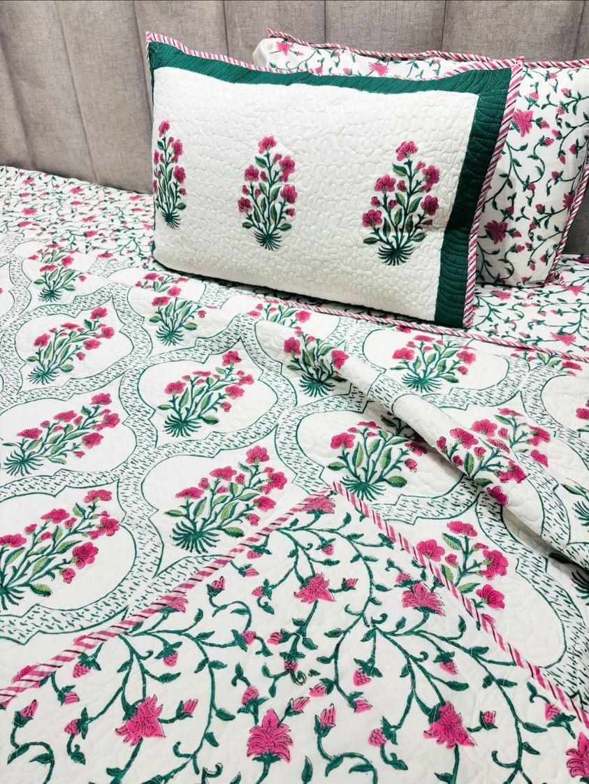 Handblock Quilted Reversible Floral Bedcover with 2 Pillow Covers