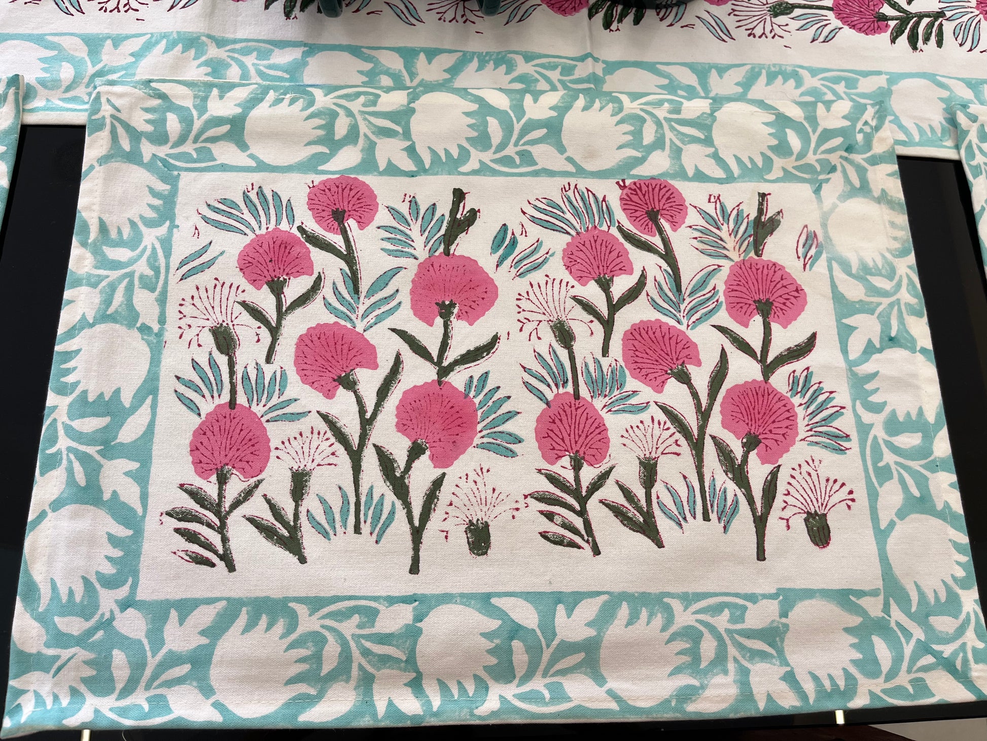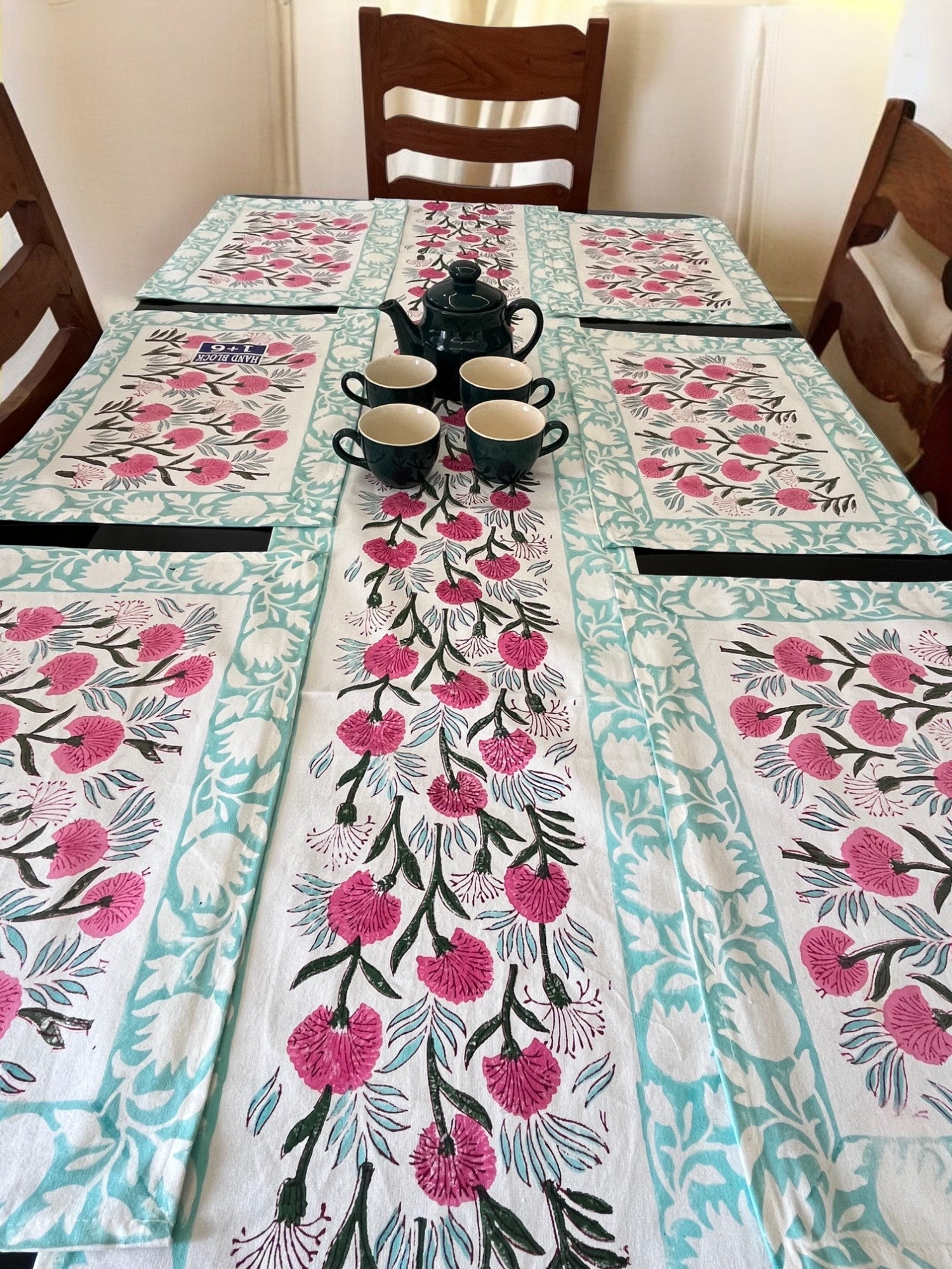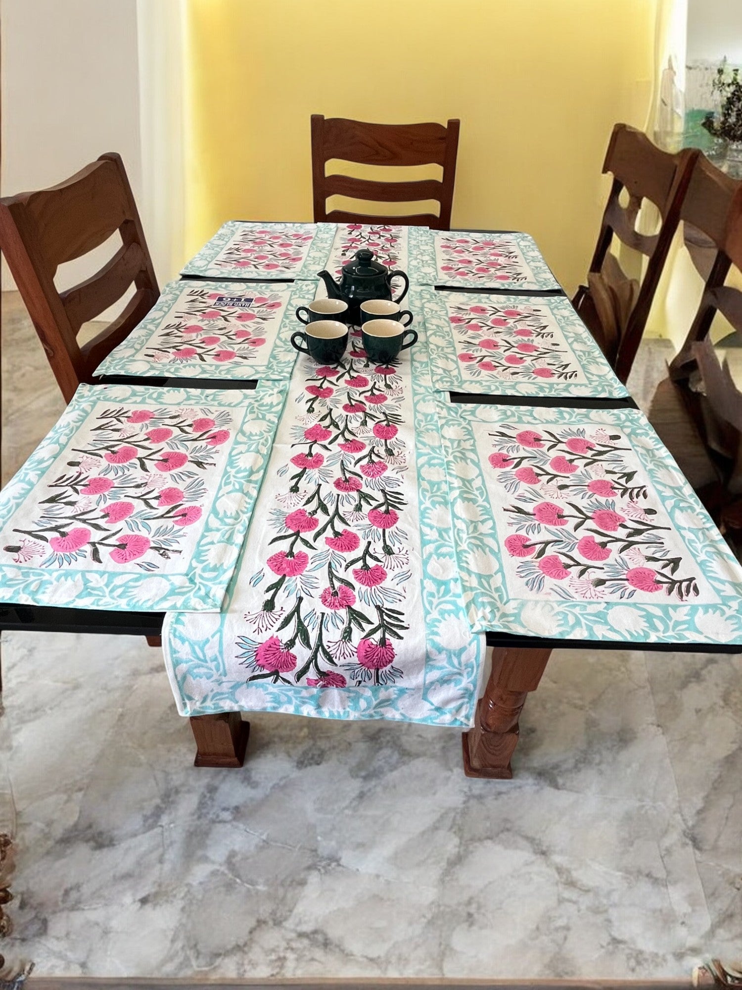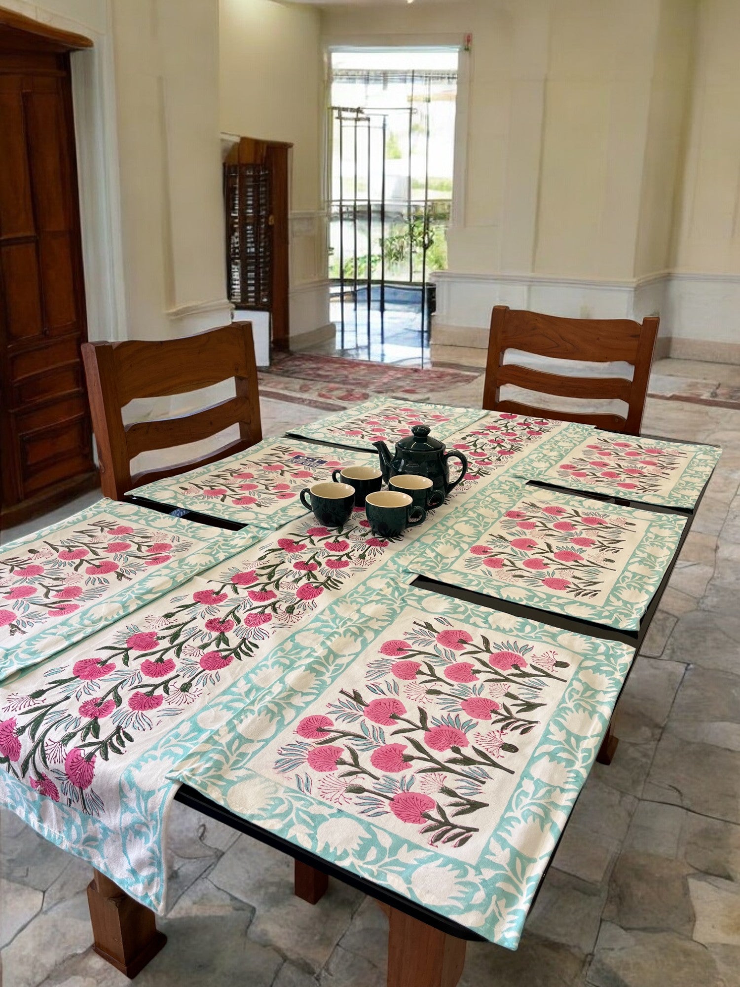 Sea Green Pink Floral Pure Cotton Rajasthani Handblock Printed Table Runner and Placemats Set of 6