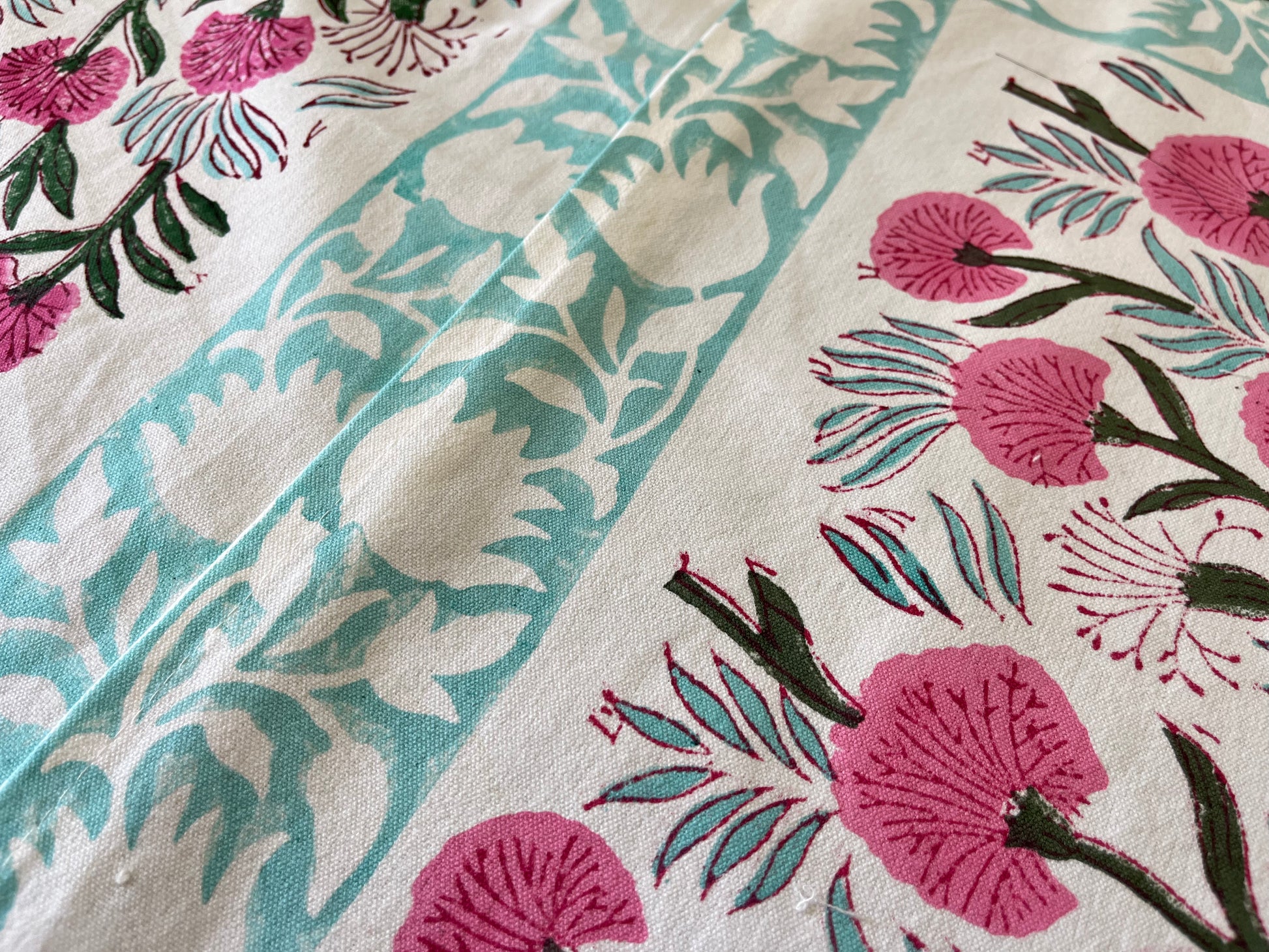 Sea Green Pink Floral Pure Cotton Rajasthani Handblock Table Runner and Mats Set of 6