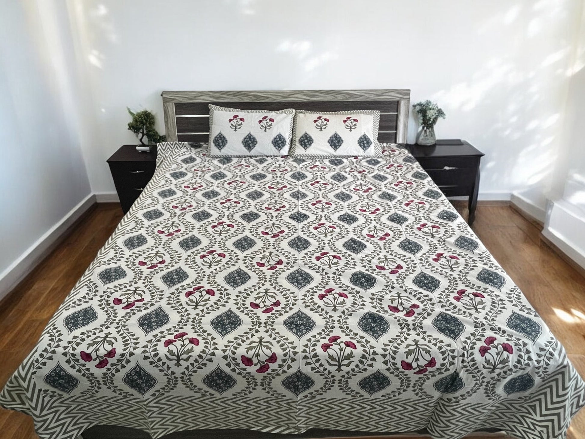 Bring vibrant elegance to your bedroom with the Handblock Red and Green Floral Bedsheet. Handcrafted from 100% premium cotton, this eco-friendly bedsheet features a stunning red and green floral design, created using traditional Indian Handblock printing techniques. Designed to fit double beds perfectly, it offers unmatched comfort, durability, and artisanal charm. Ideal for everyday use or special occasions, this Handblock-printed floral bedsheet adds a refreshing and timeless touch to your home decor. Shop now to experience craftsmanship at its finest