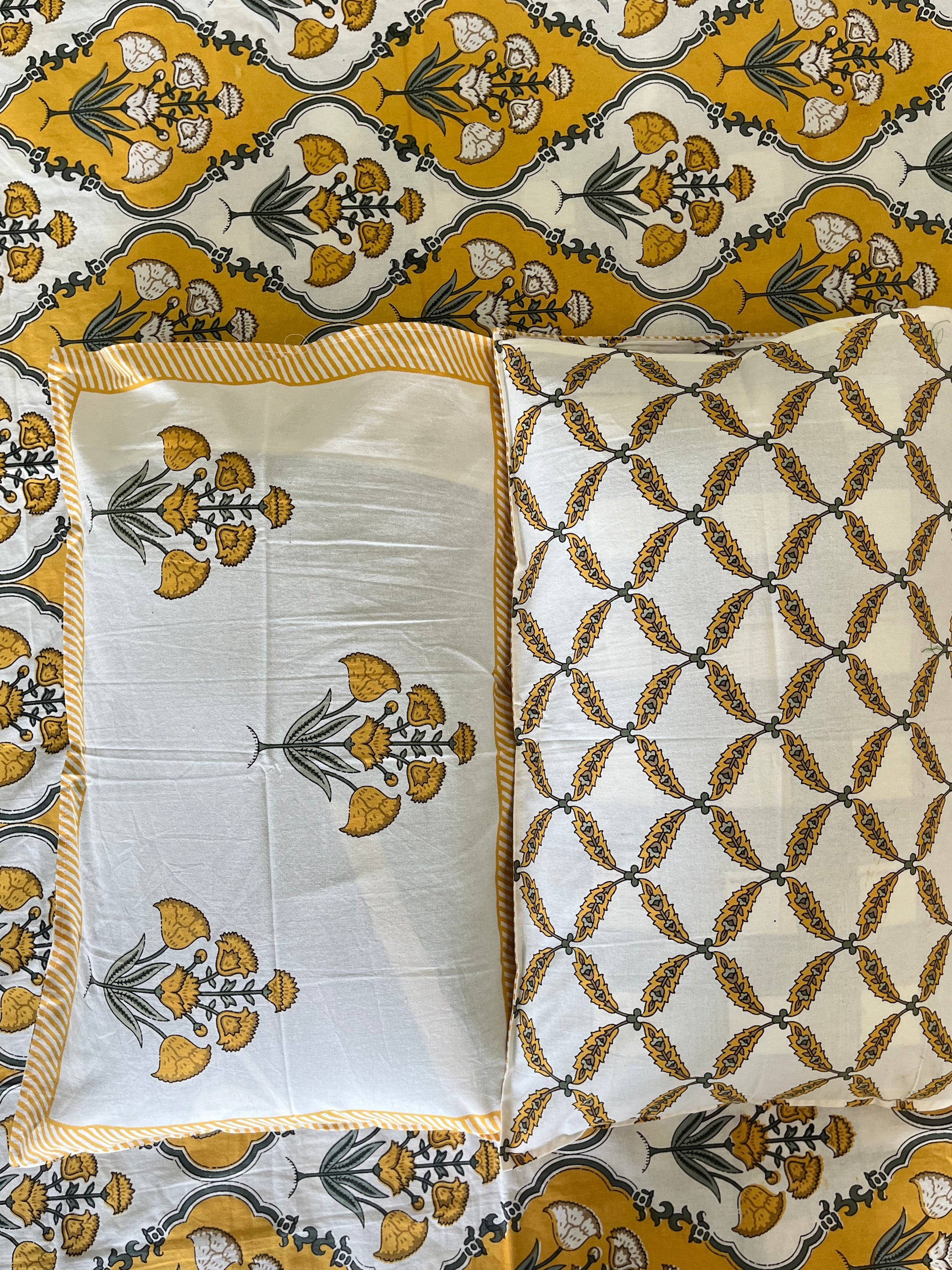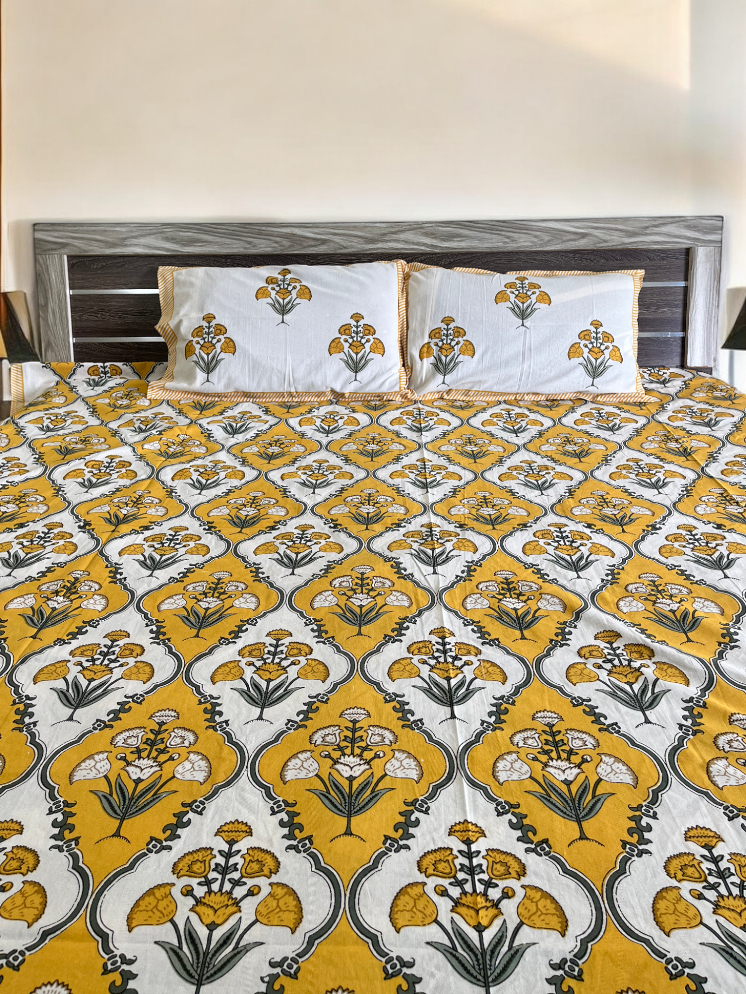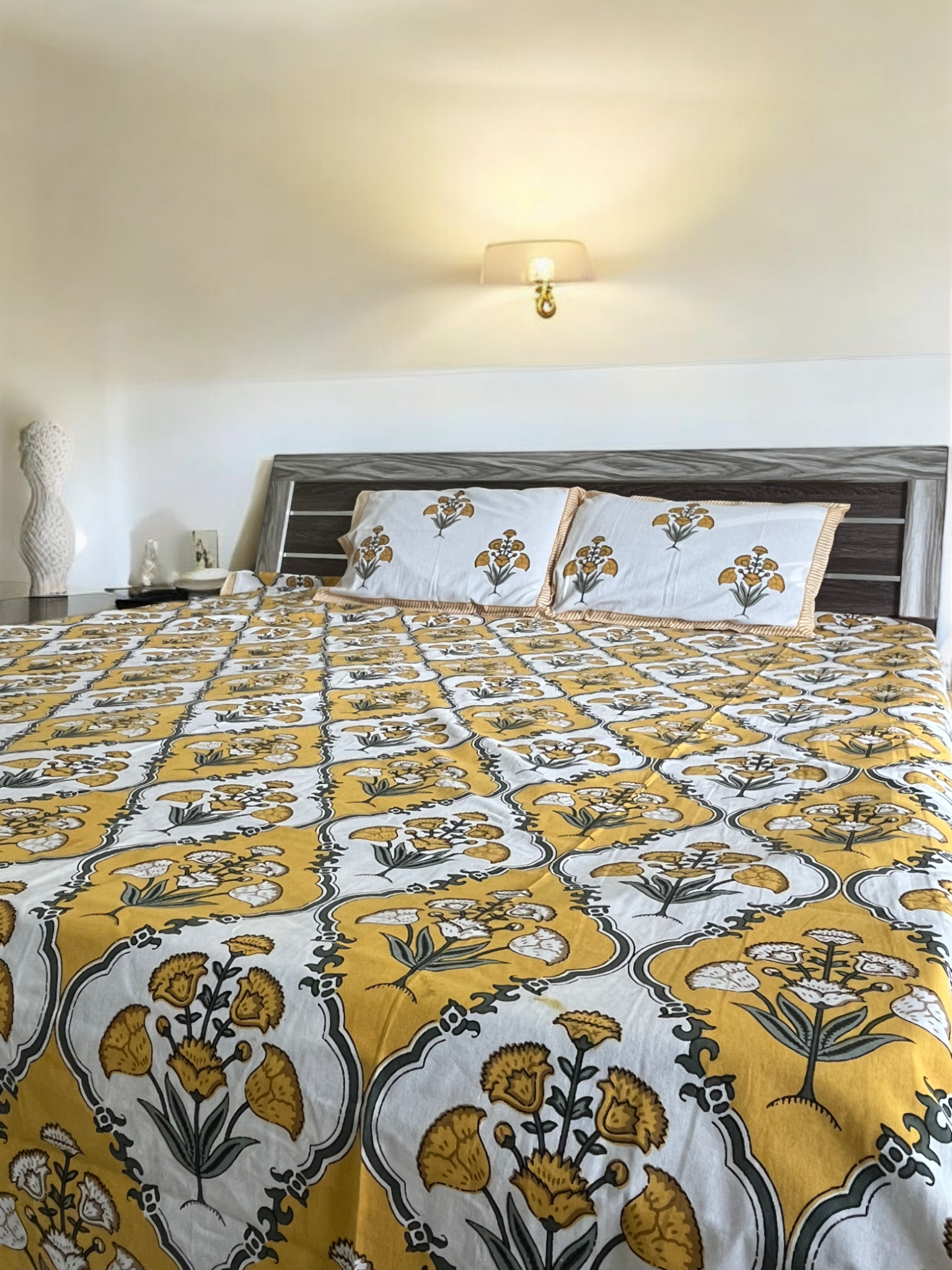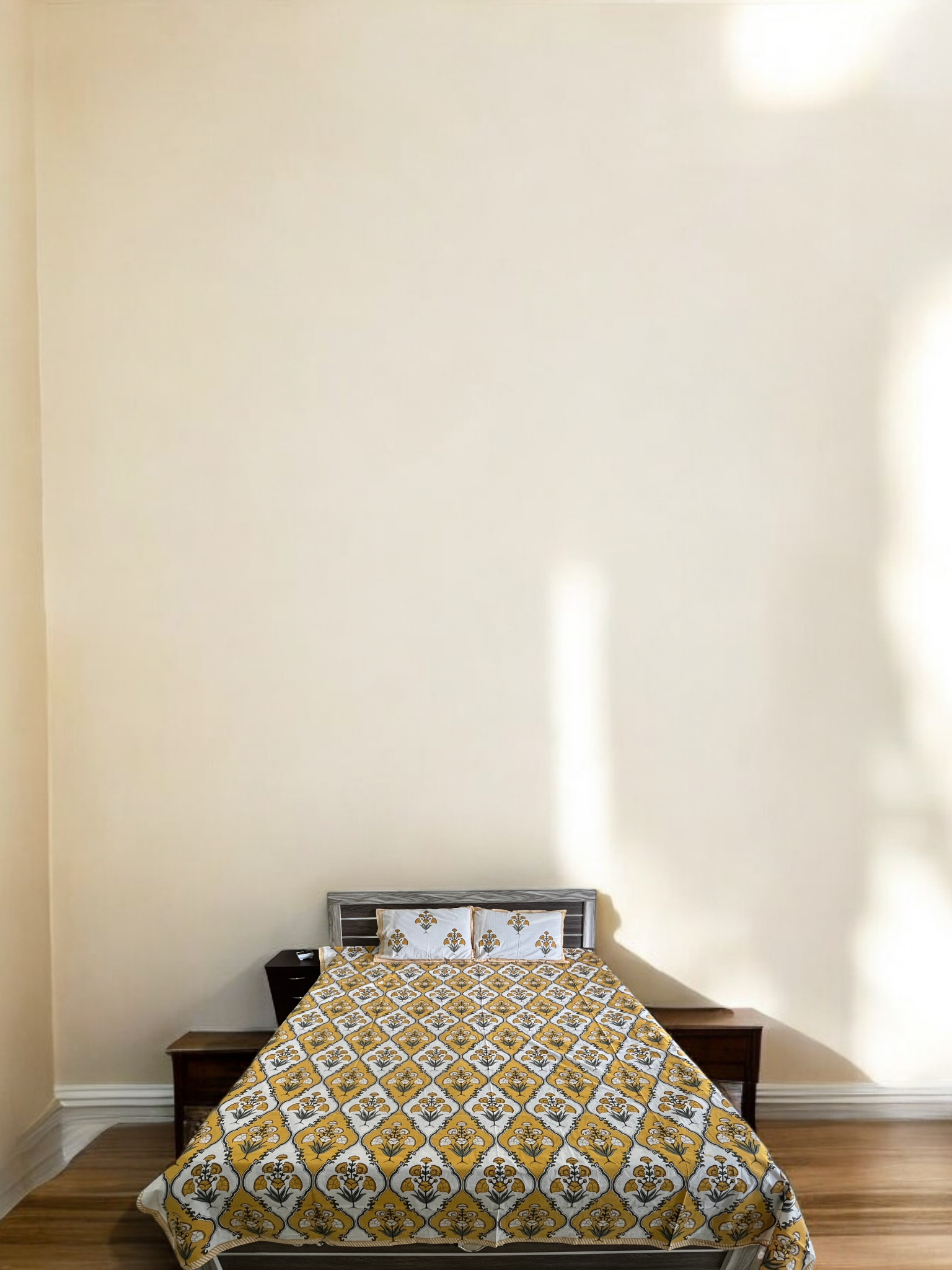 Brighten up your bedroom with the Yellow and White Patchwork Handblock Cotton Double Bedsheet. Made from 100% premium cotton, this bedsheet features an elegant patchwork design in soothing yellow and white tones, crafted using traditional Indian handblock printing techniques. Soft, breathable, and durable, it fits perfectly on double beds, offering ultimate comfort and timeless charm. Whether for everyday use or special occasions, this handcrafted bedsheet adds warmth and artistic beauty to your home decor.