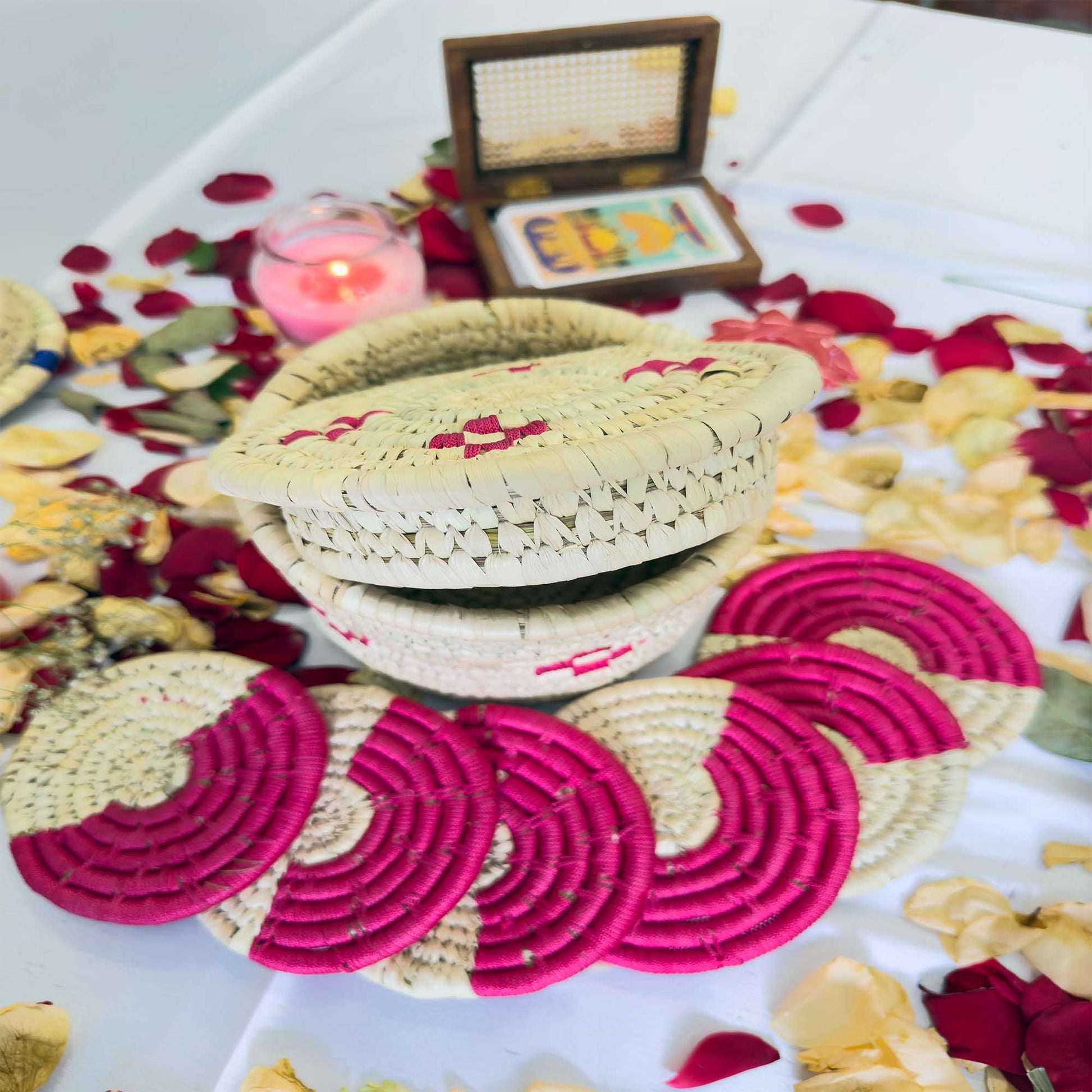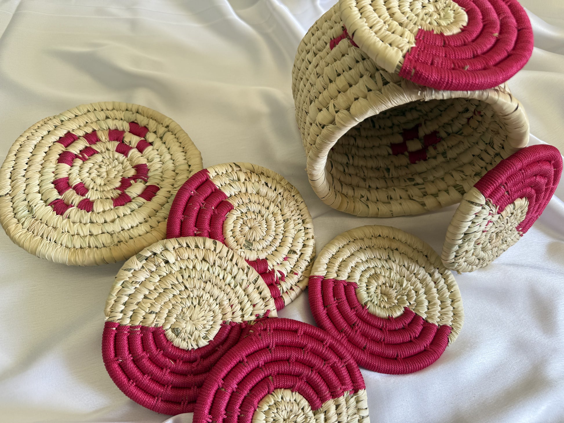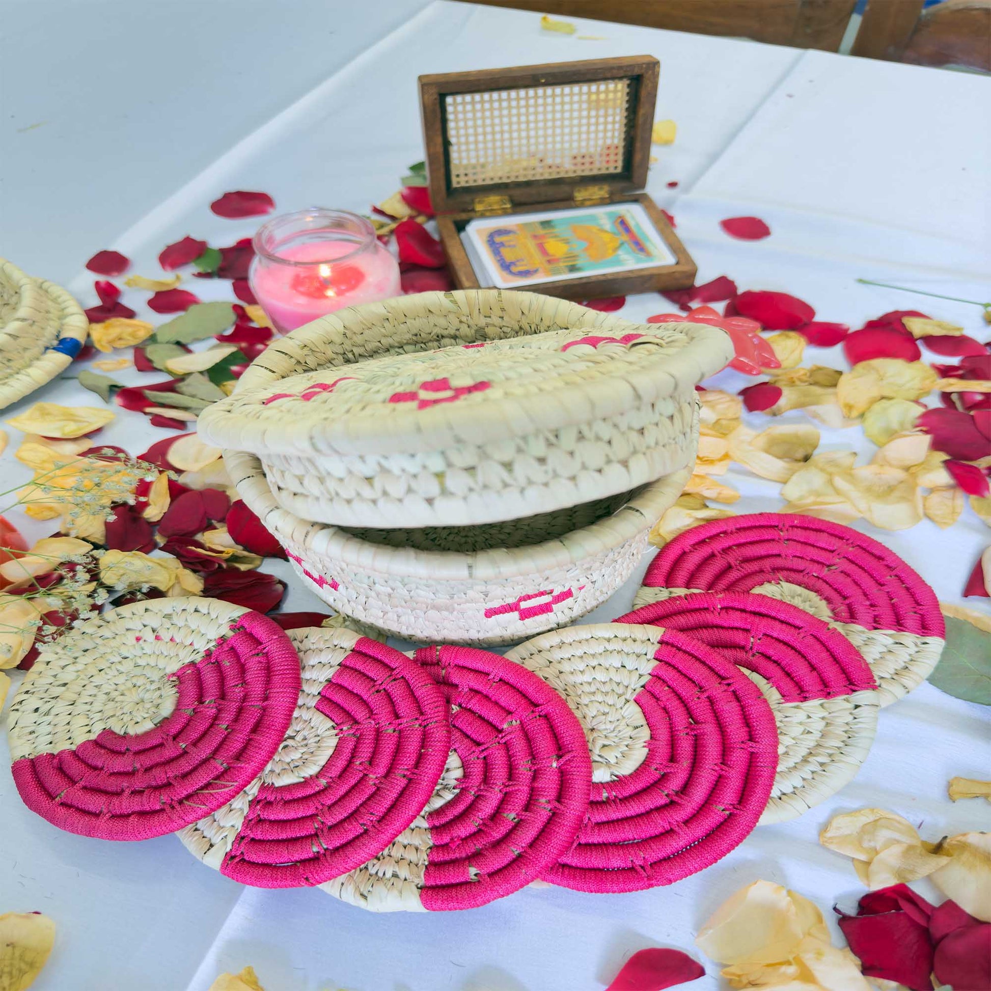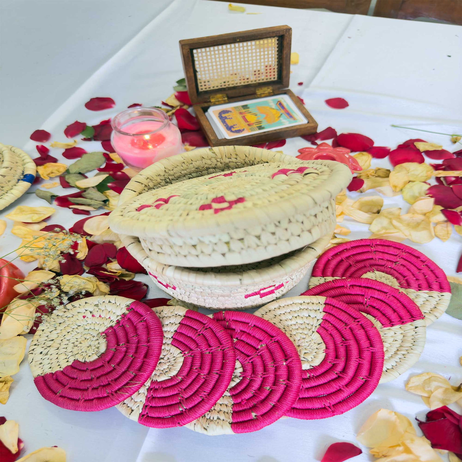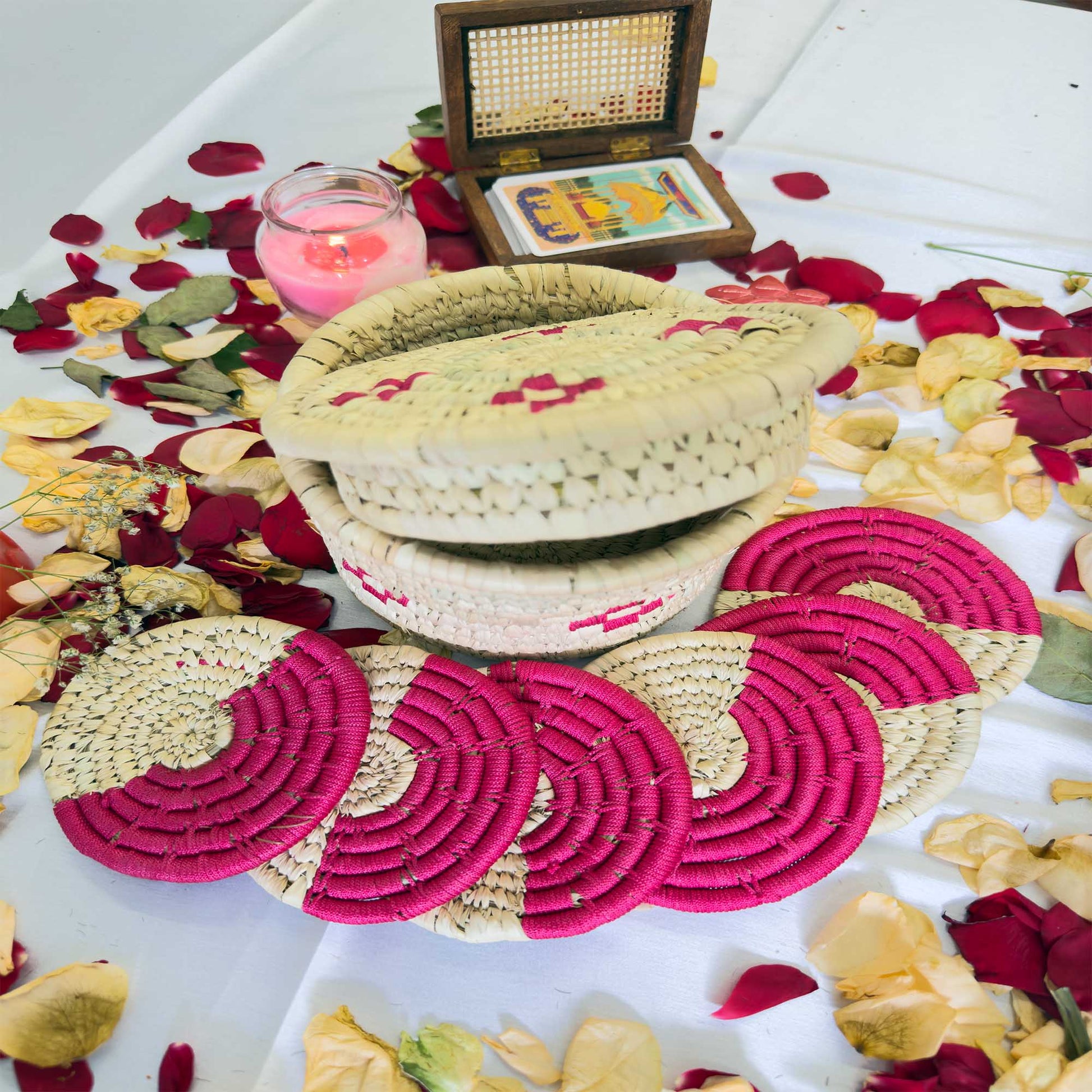 Handcrafted Pink Jute Coasters With Sabai Grass Basket (SET OF 6 COASTERS + 1 BASKET)