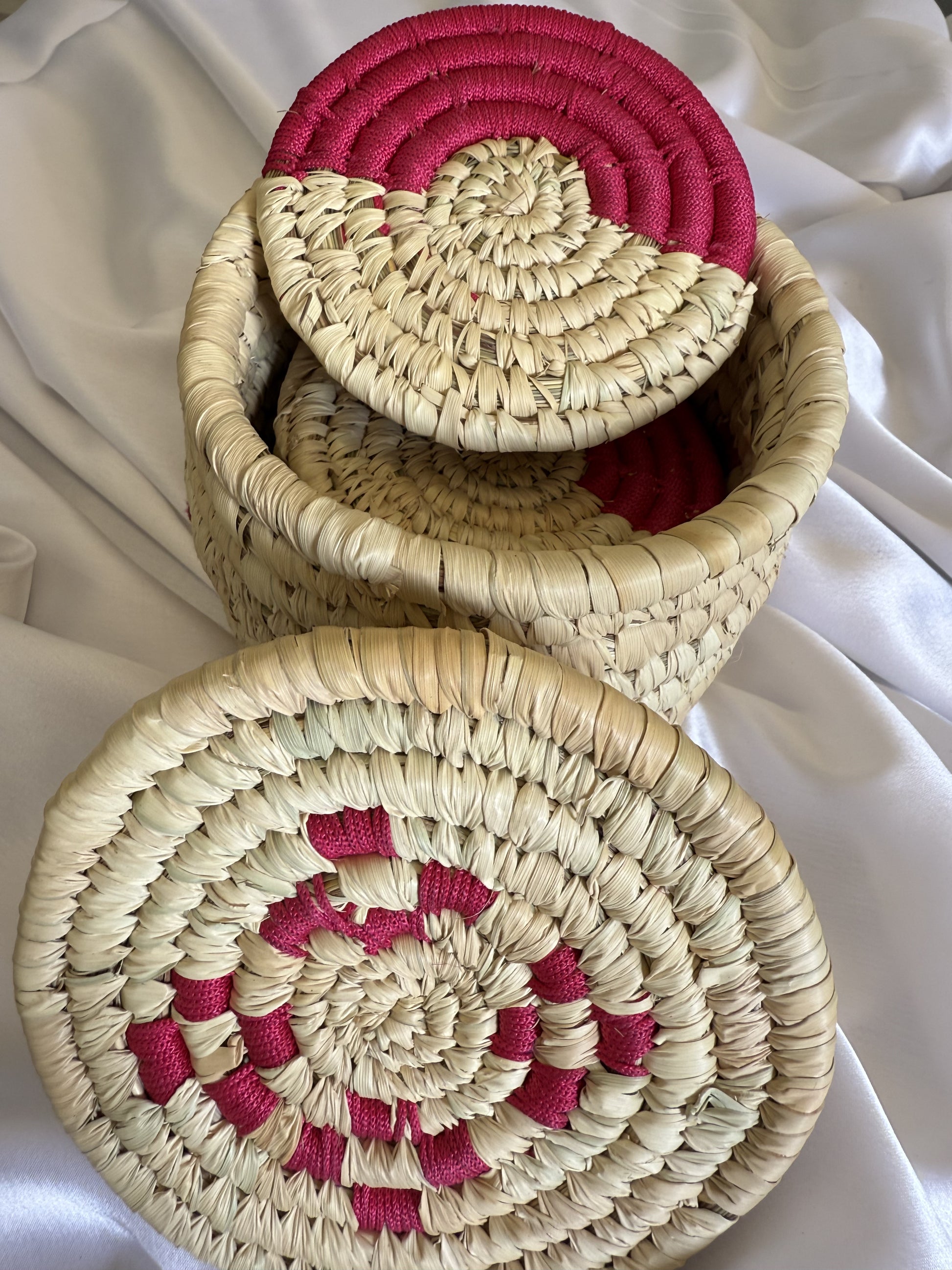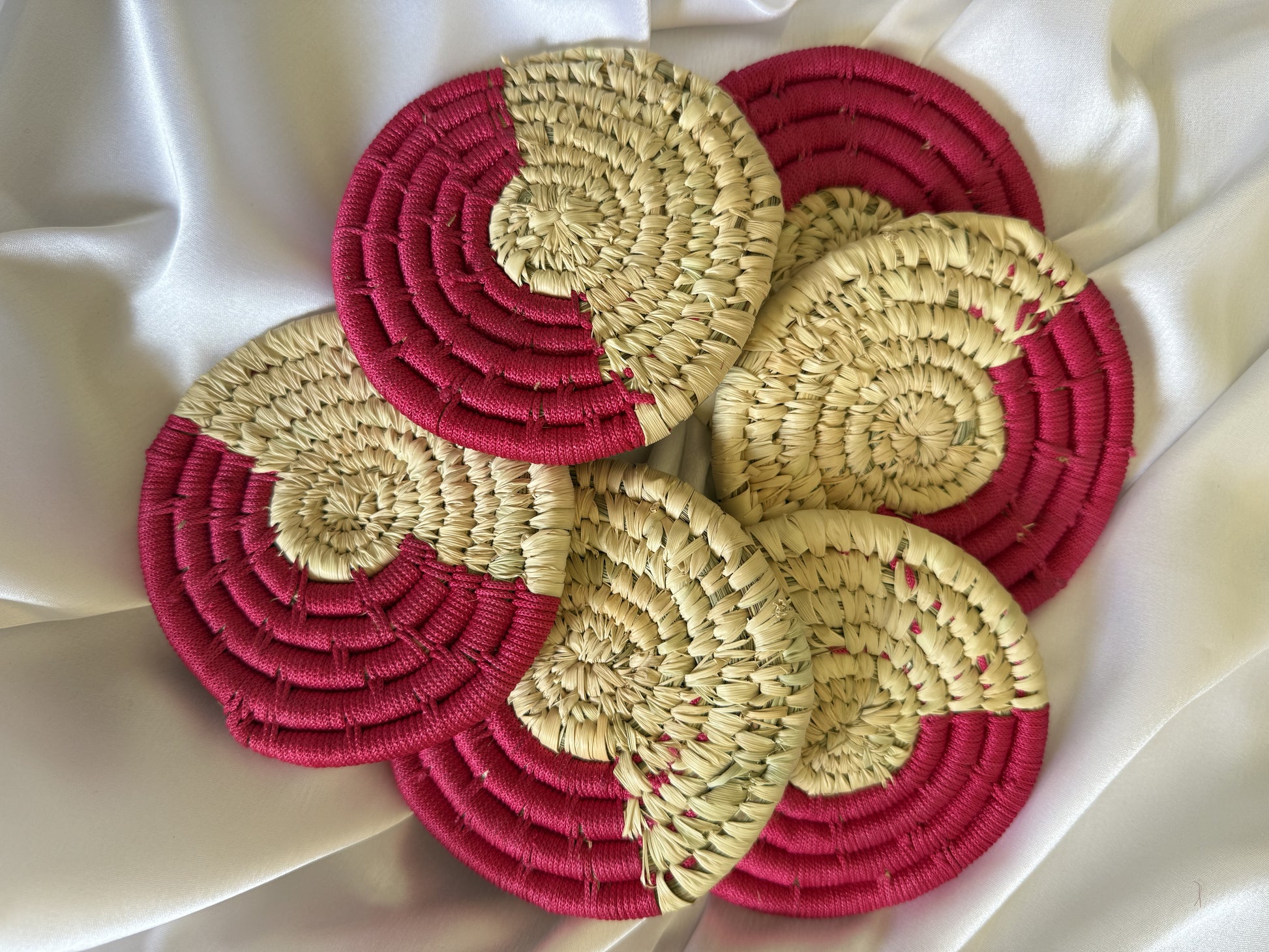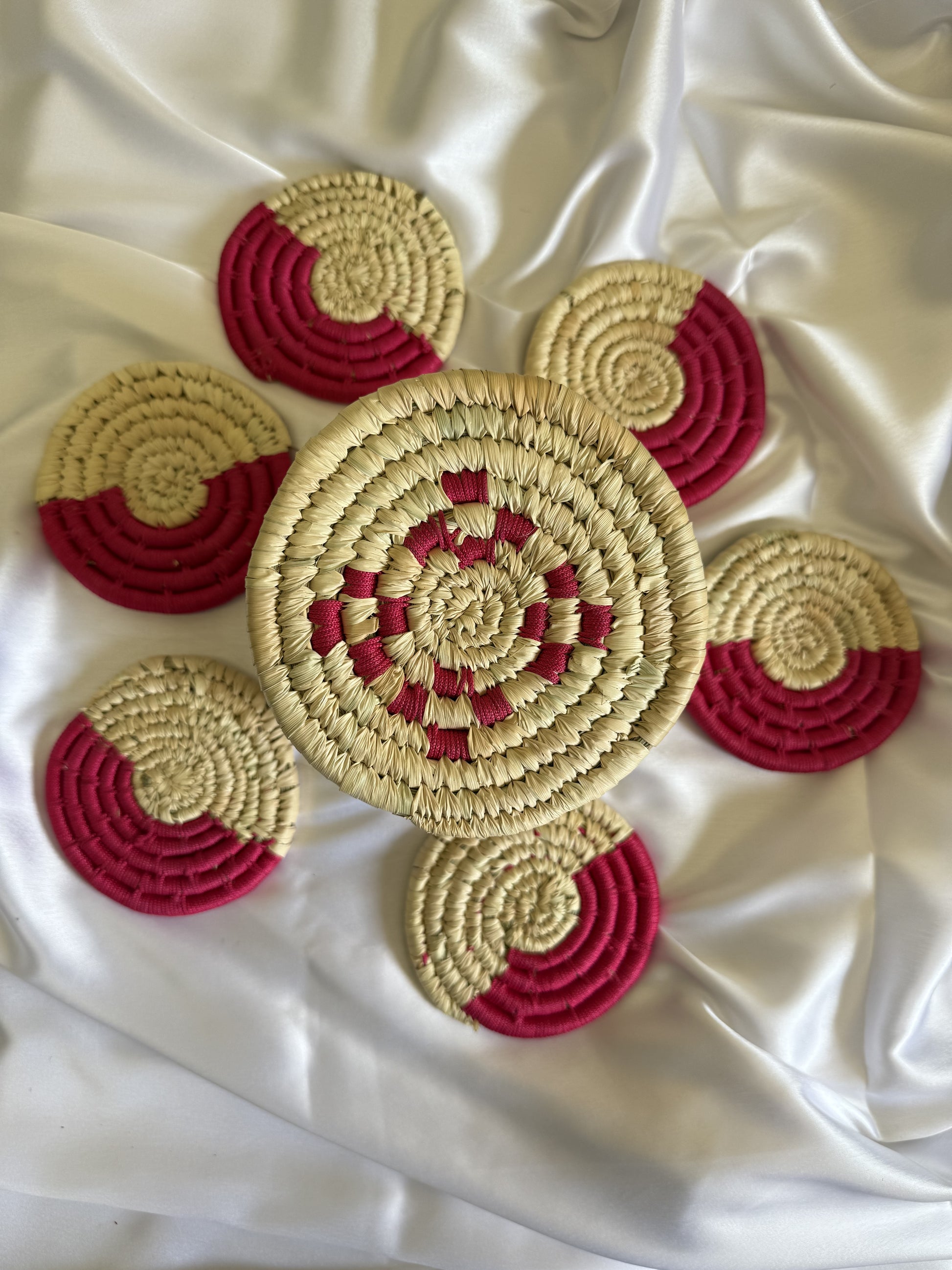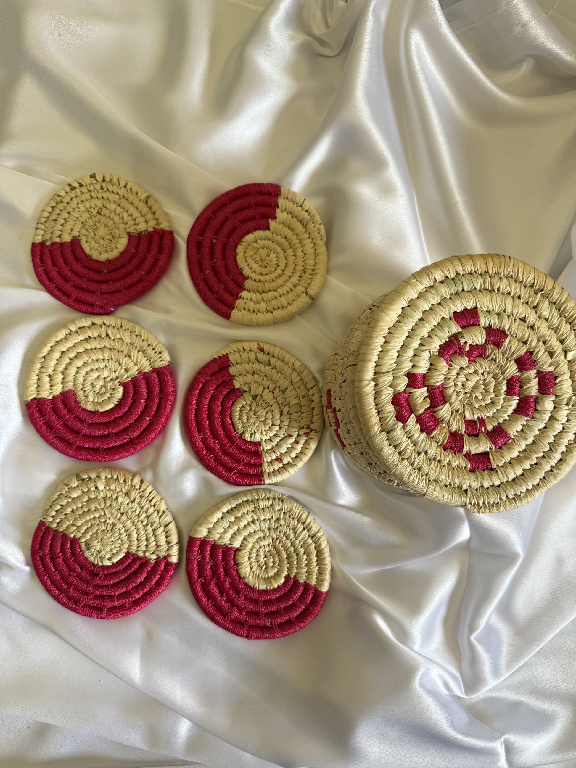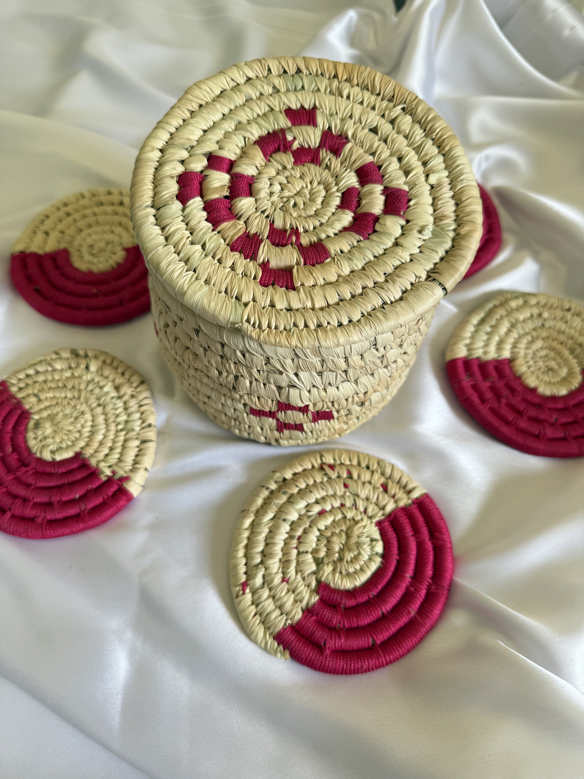 Handcrafted Pink Jute Coasters With Sabai Grass Basket (SET OF 6 COASTERS + 1 BASKET)