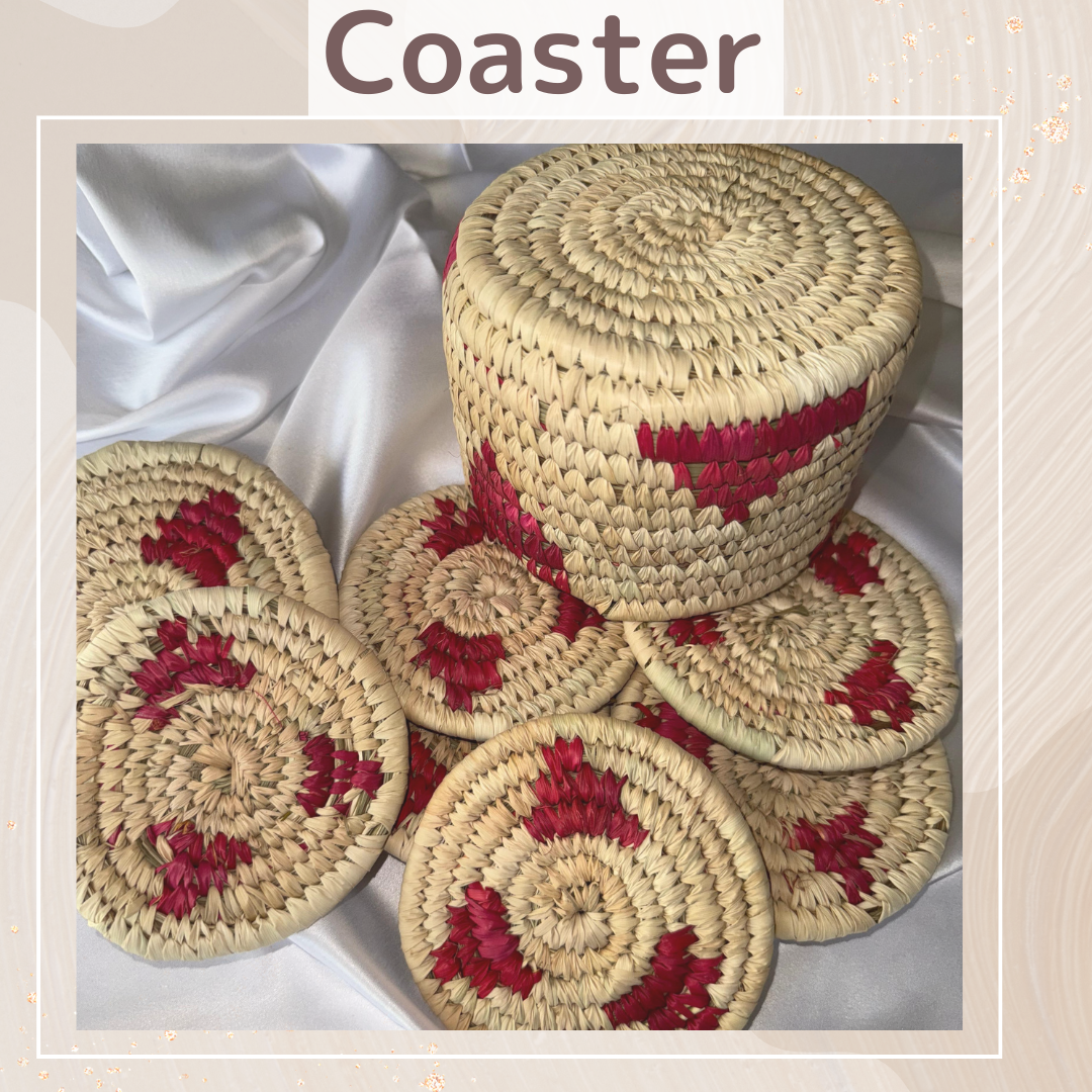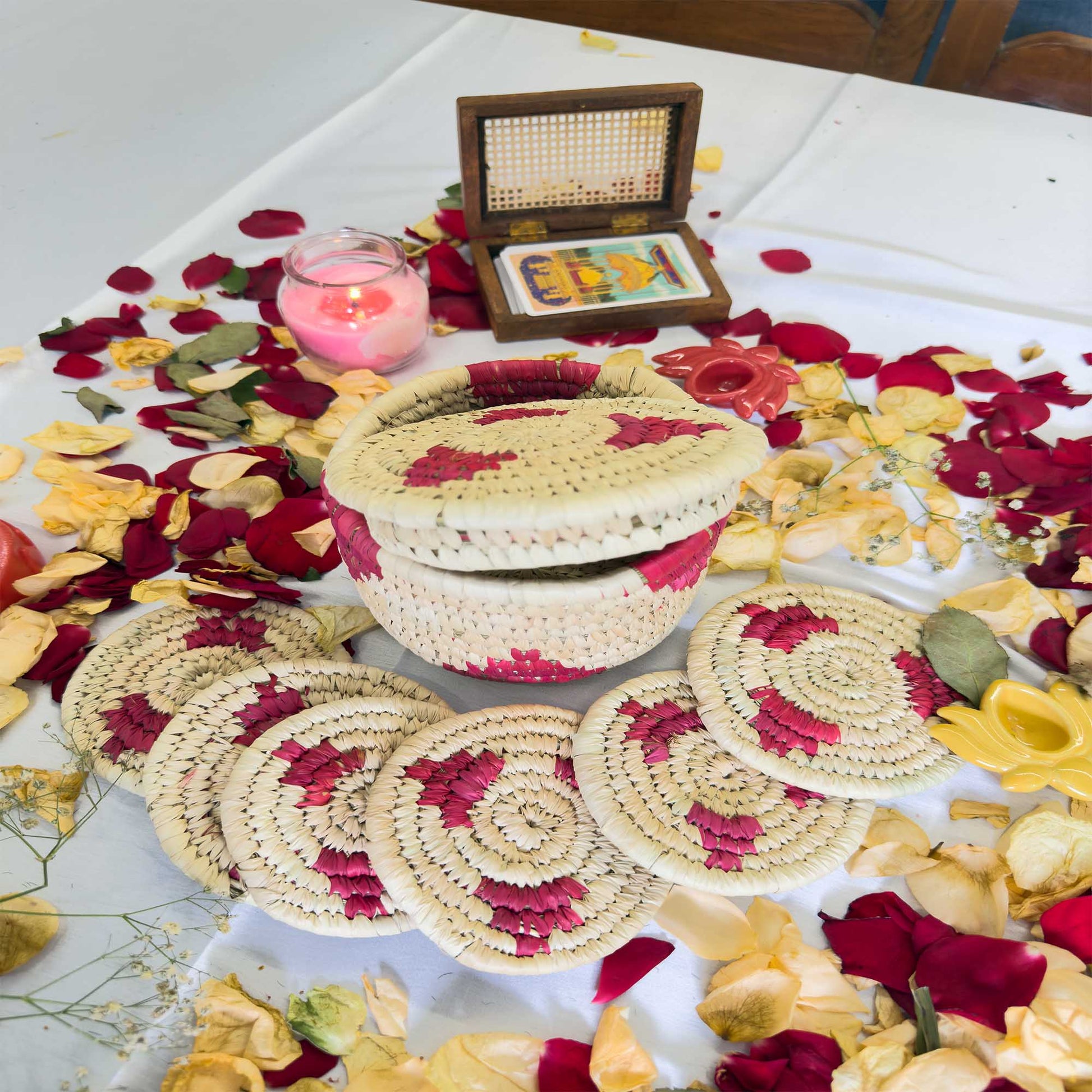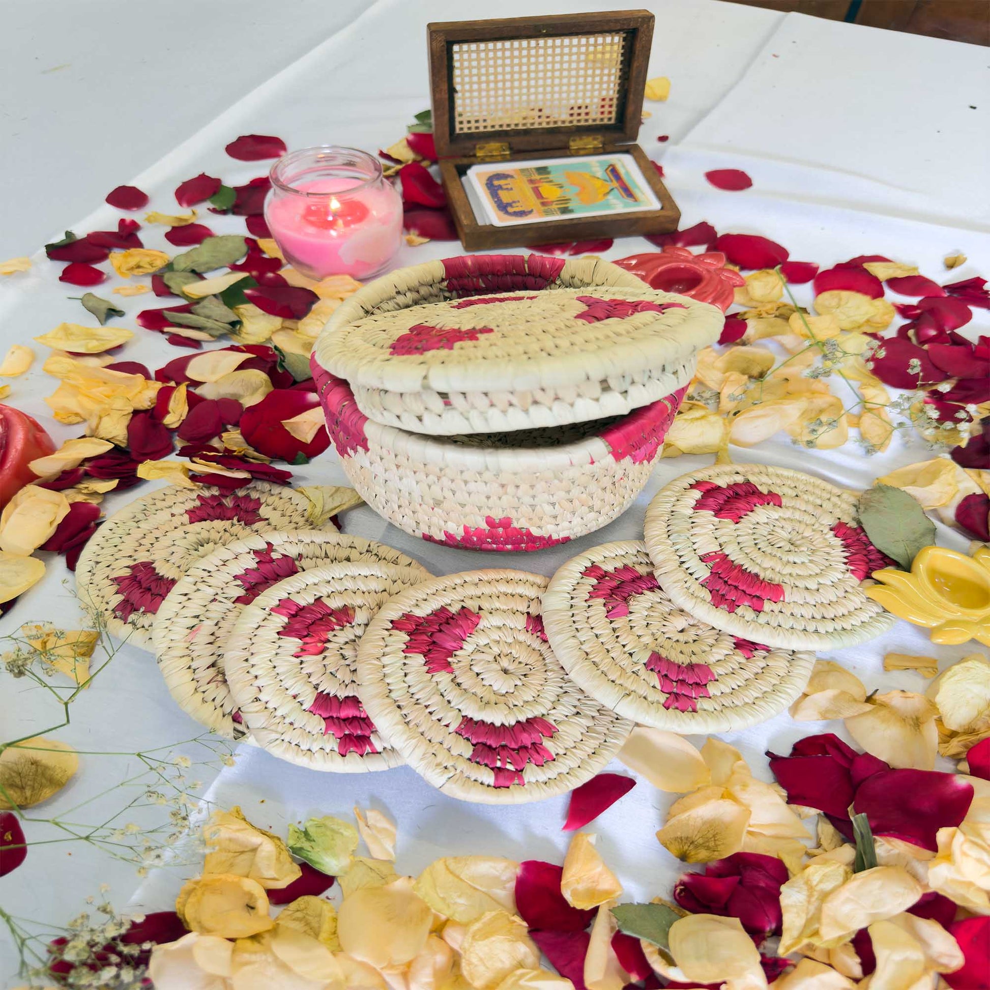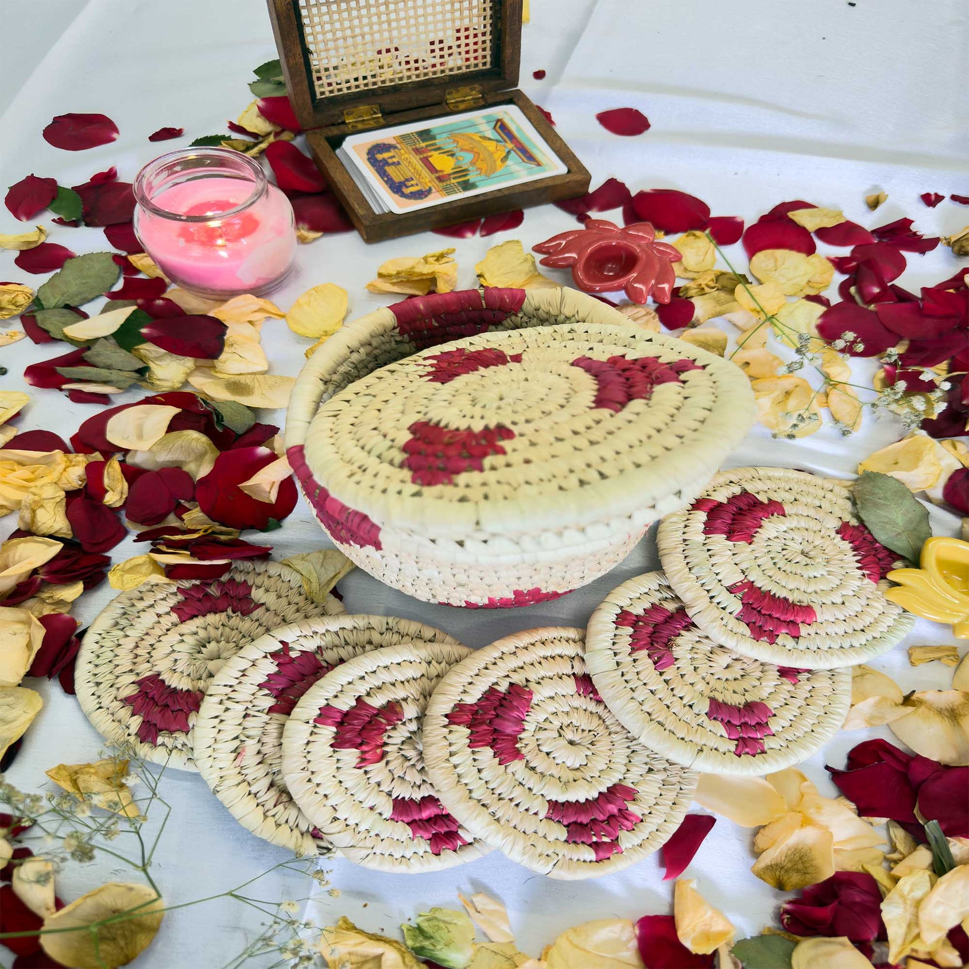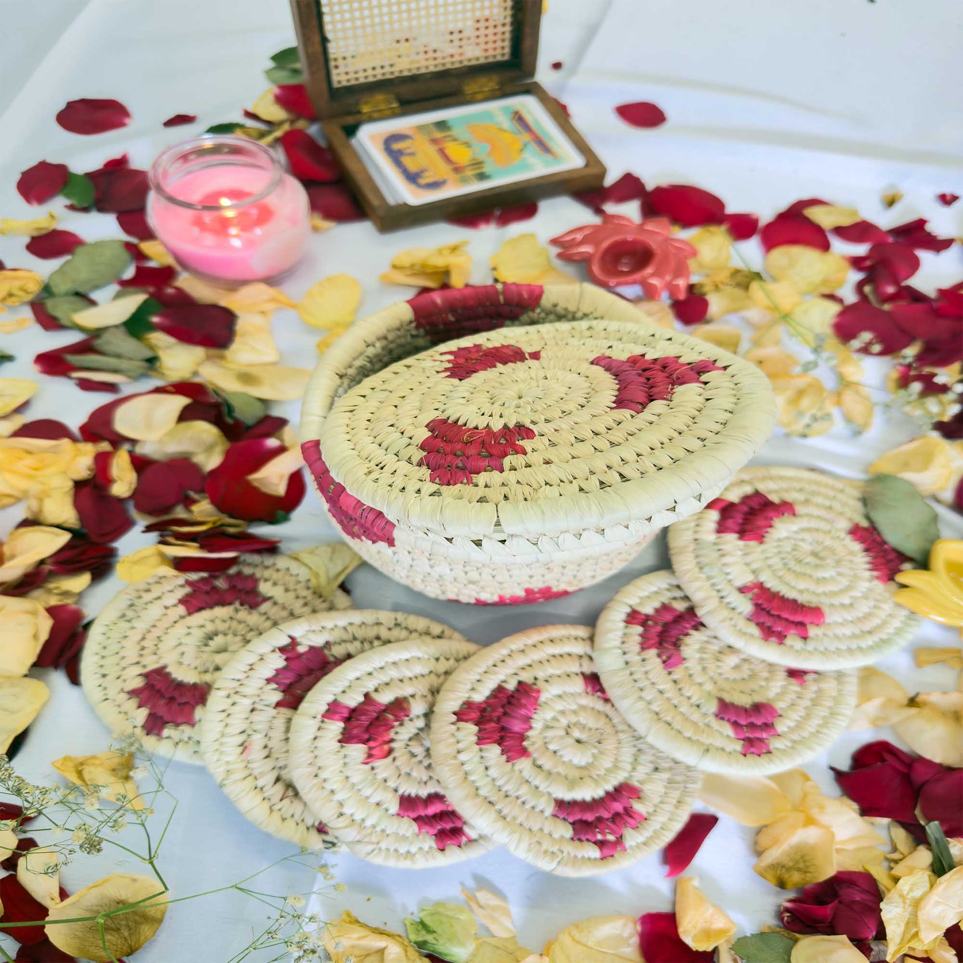 Magenta Handcrafted Jute Coasters With Sabai Grass Basket (SET OF 6 COASTERS + 1 BASKET)