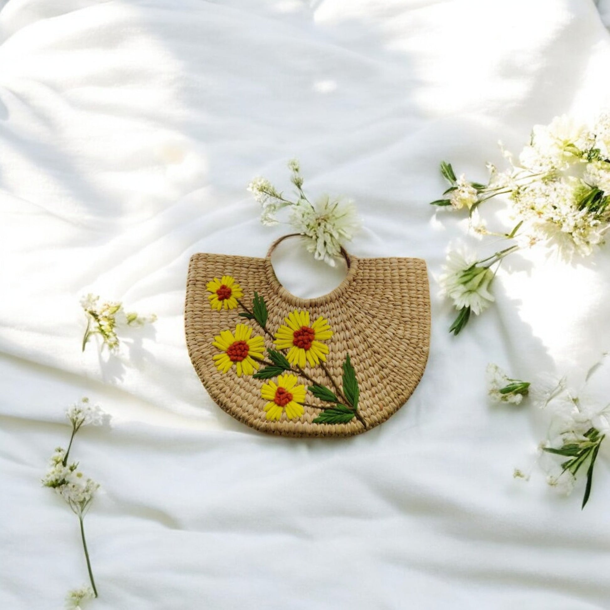 Step up your style with the Kauna Embroidery Handbag, featuring a vibrant yellow sunflower design woven into durable kauna fibers. This handcrafted tote bag combines nature’s beauty with modern craftsmanship, showcasing an intricate mesh that envelops the bag’s body. Perfect for carrying your essentials while making a bold statement, this stylish bag is ideal for both casual outings and special occasions. The combination of durable kauna fibers and the stunning sunflower design makes it a unique accessory that reflects elegance, eco-friendliness, and craftsmanship.
