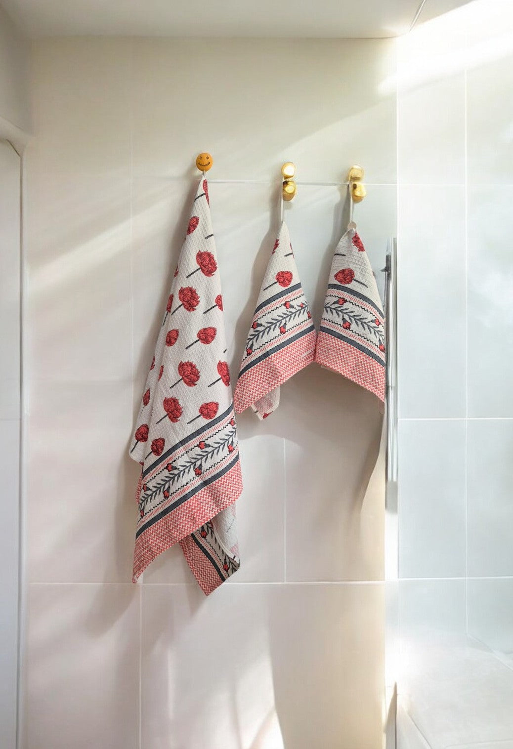 Light Pink Floral White Handblock Towels Set of 3 ( 1 Bath Towel, 2 Hand Towels)