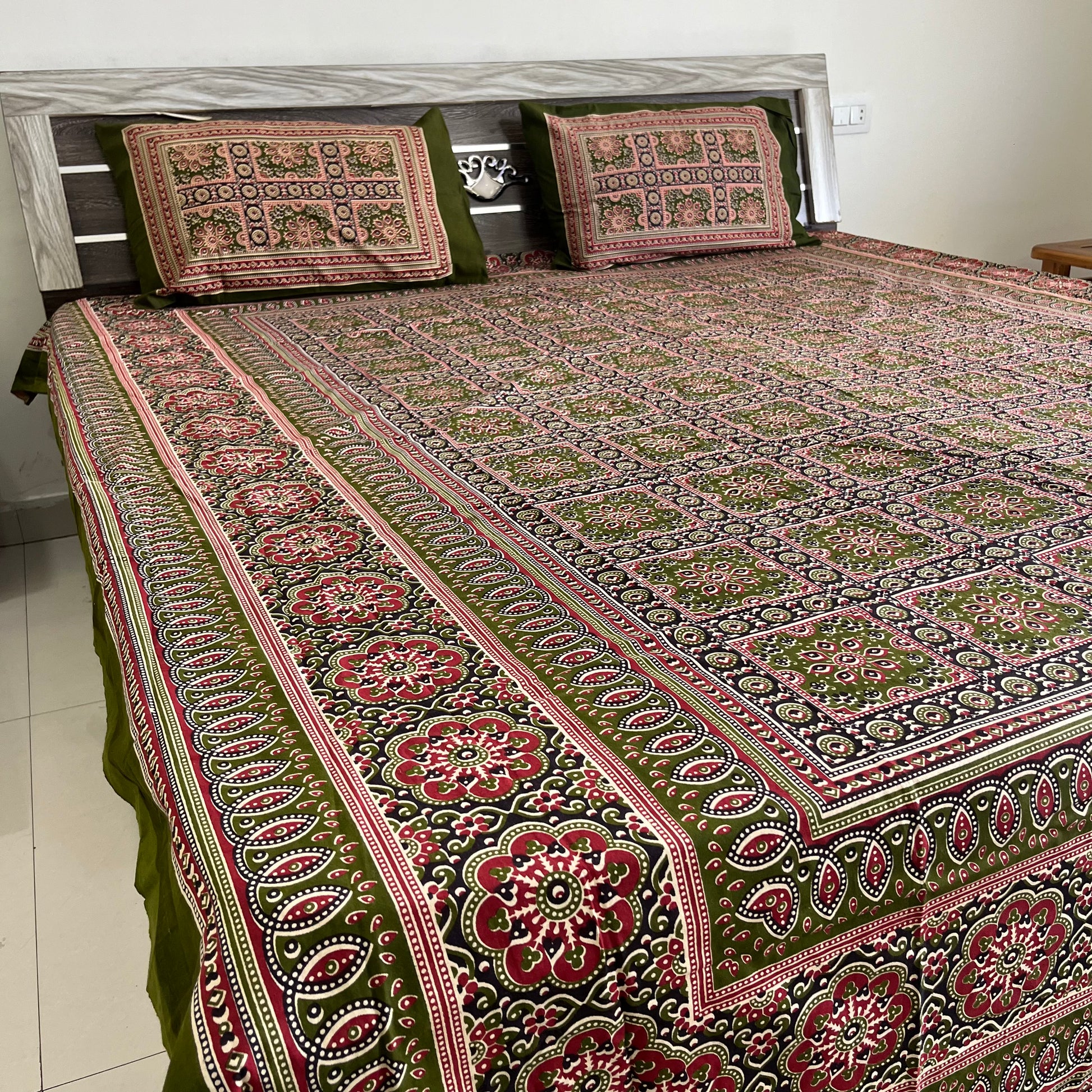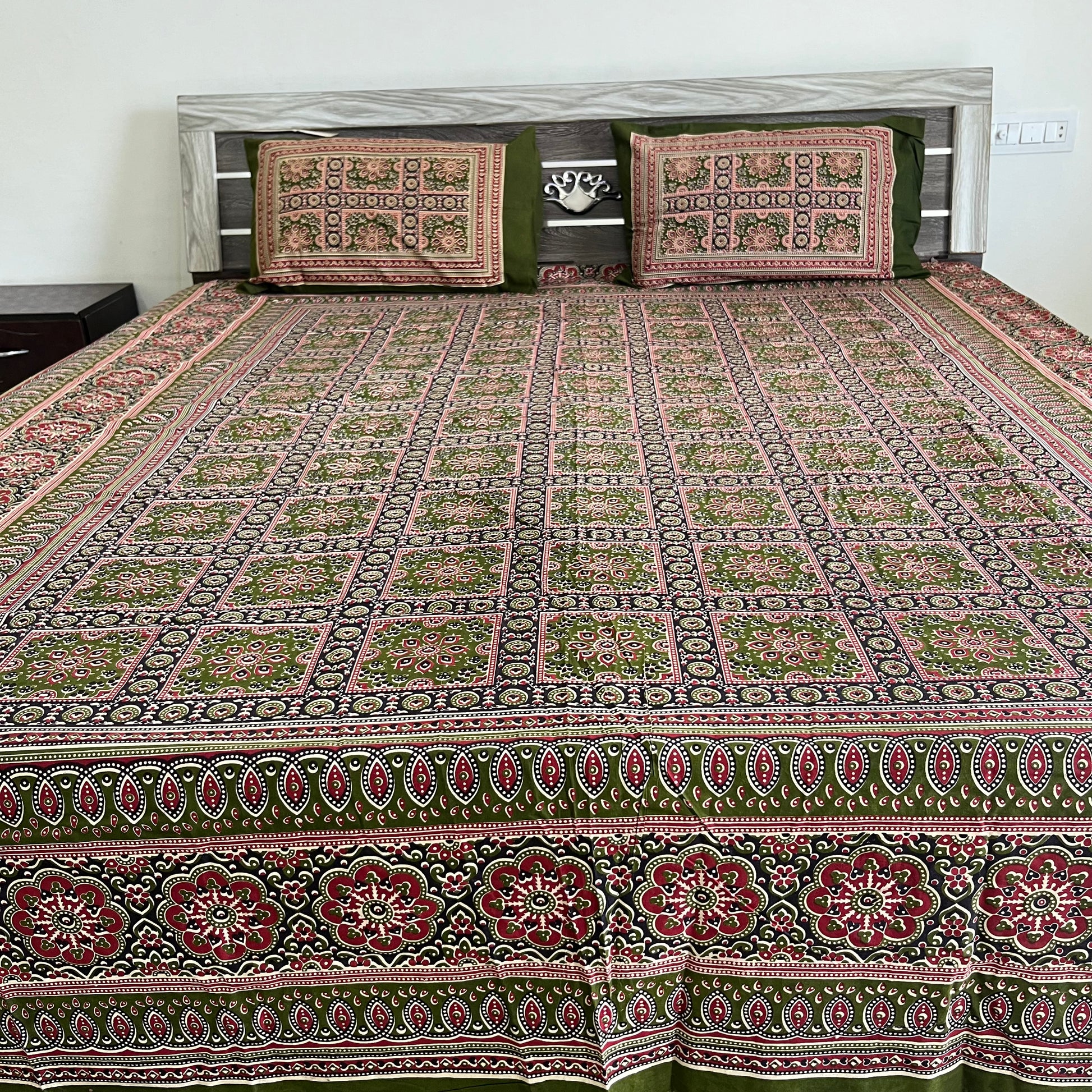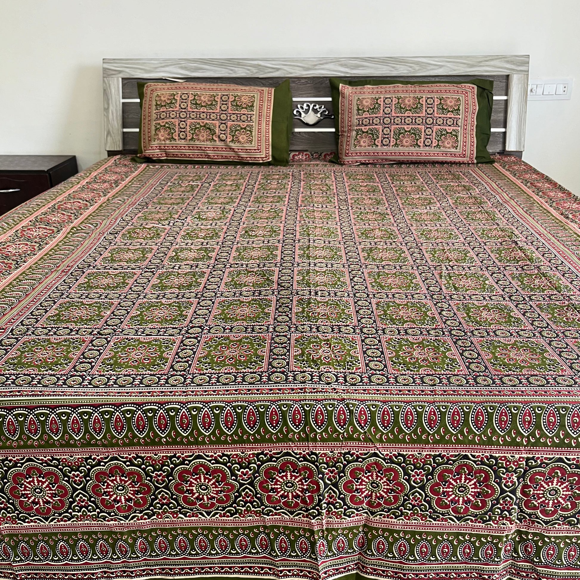 Mehendi Green Kalamkari Bedsheet with 2 Pillow covers