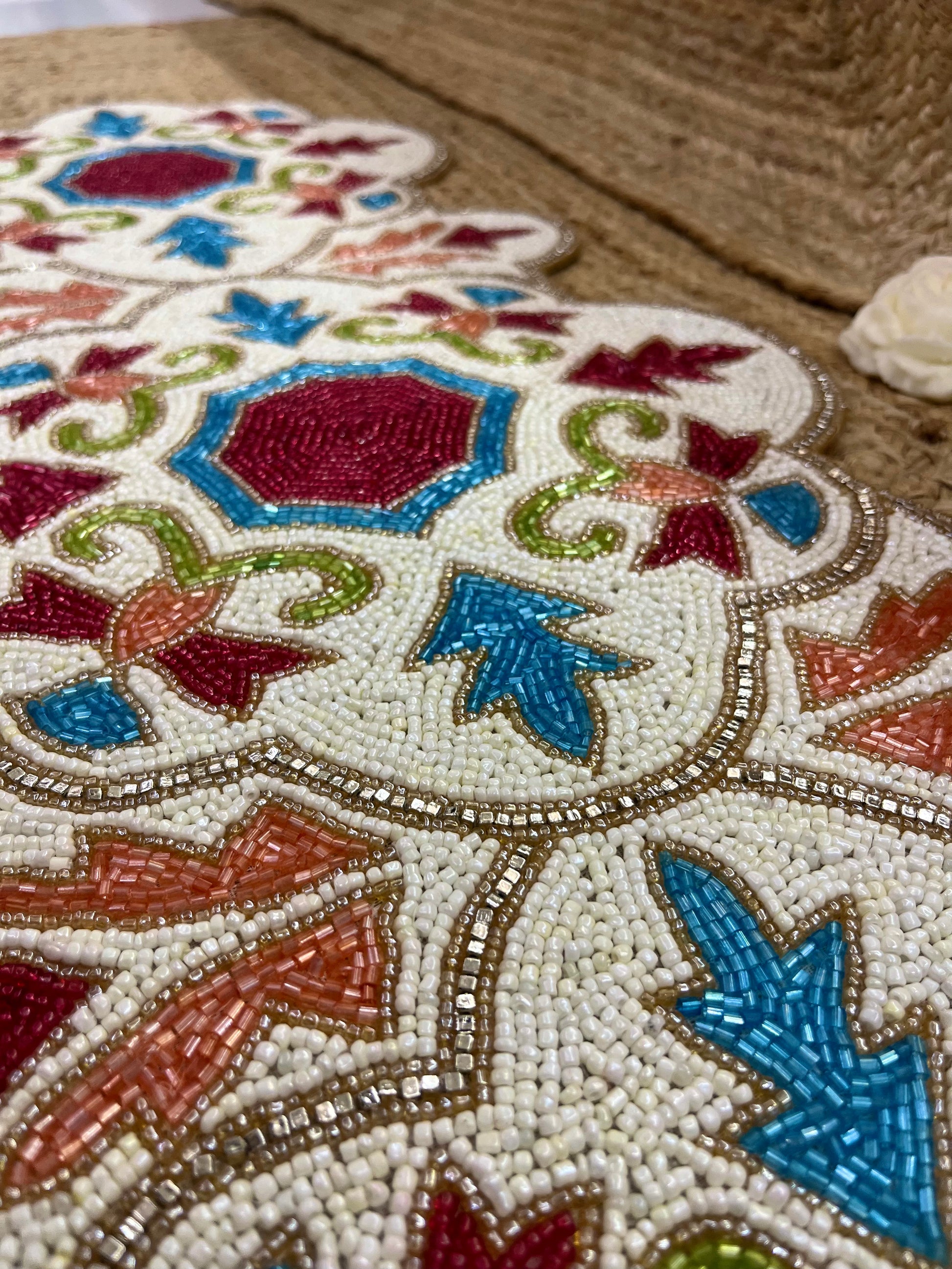 A must-have for those who appreciate artisanal craftsmanship and luxurious décor, this glass beaded placemat is sure to impress your guests.