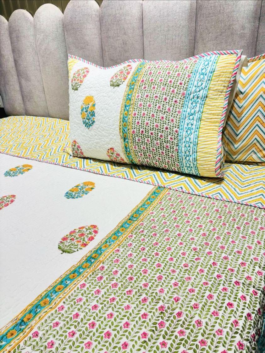 Multi-Colour White Handblock Quilted Reversible Bedcover with 2 Pillow Covers – Premium Cotton, Elegant Home Décor