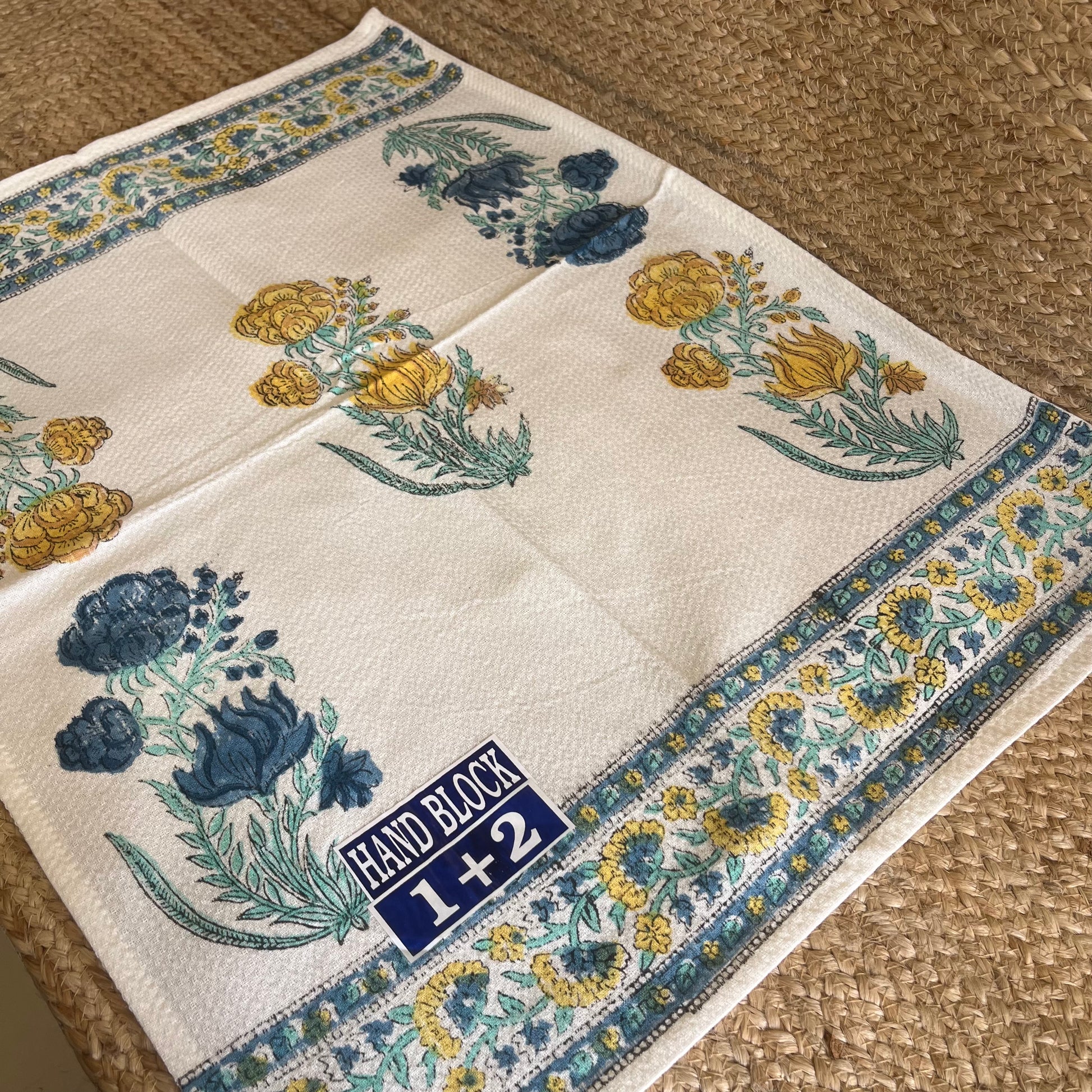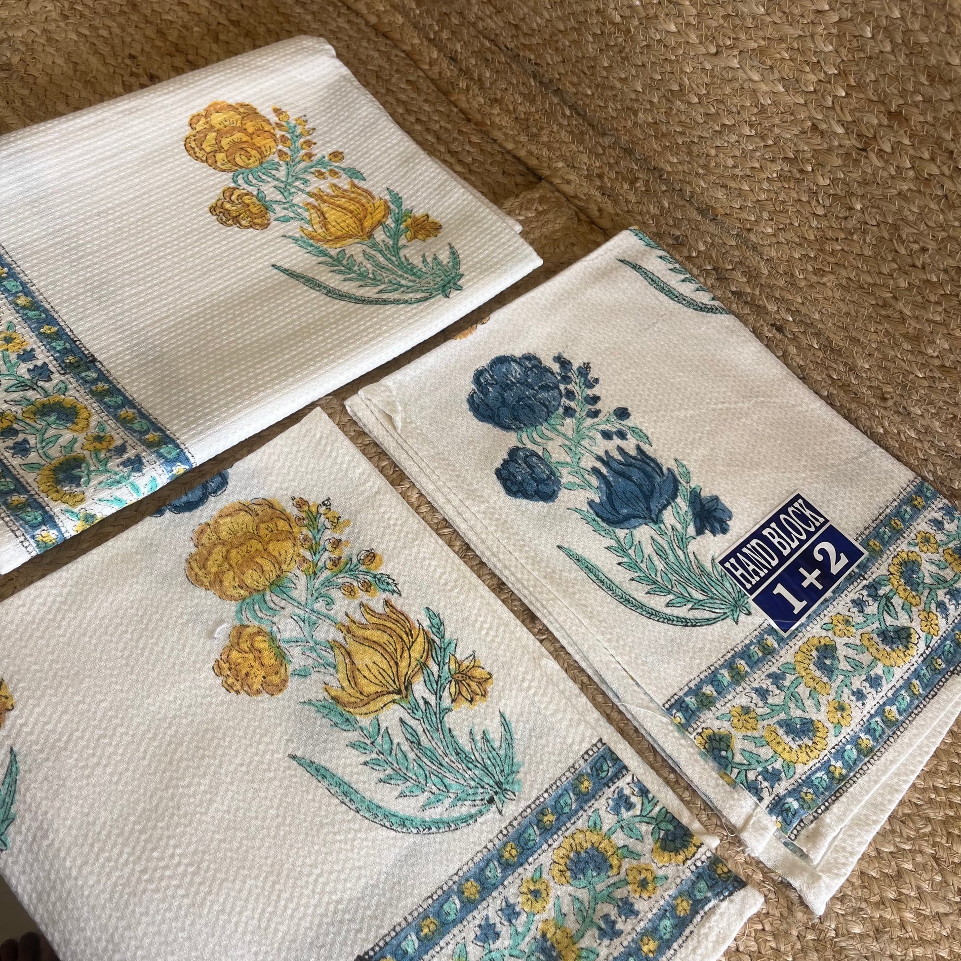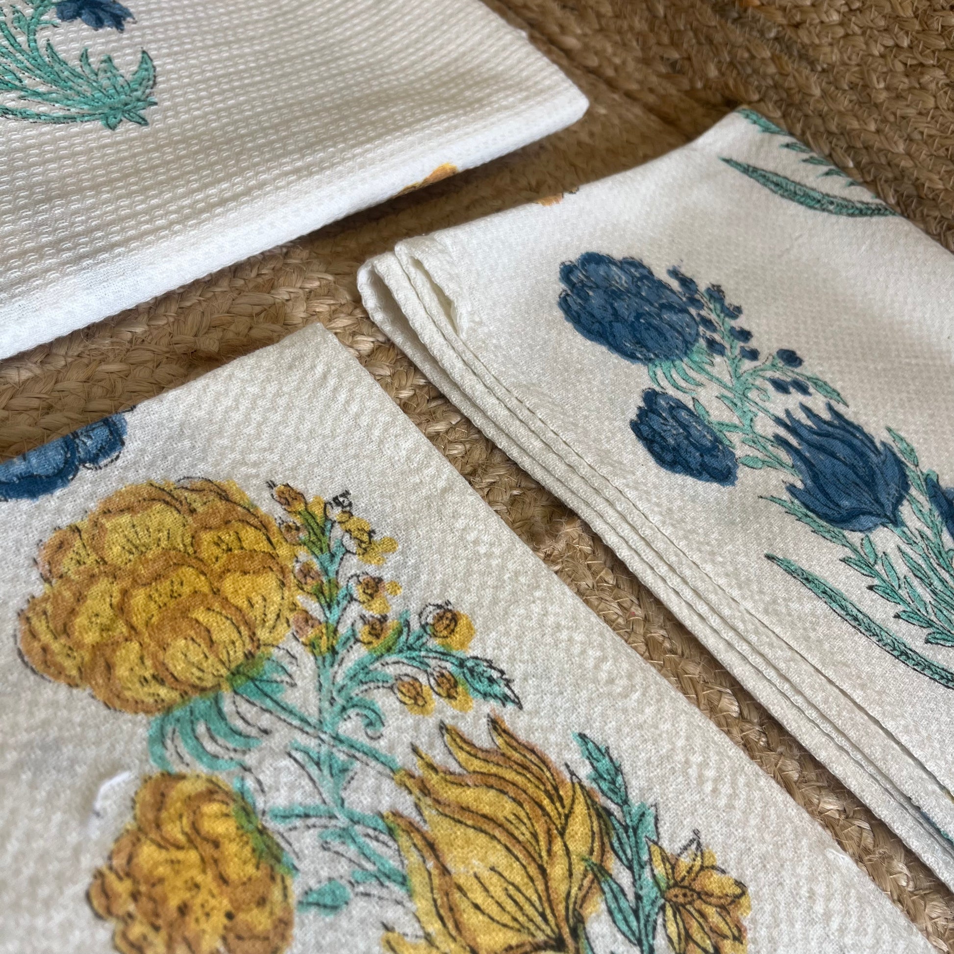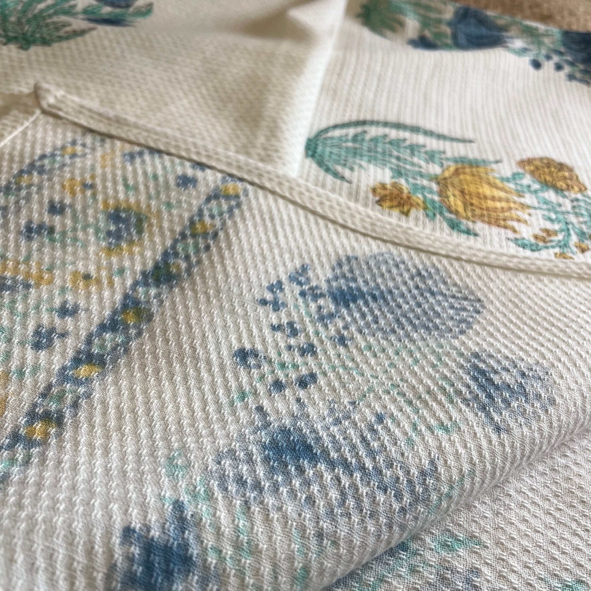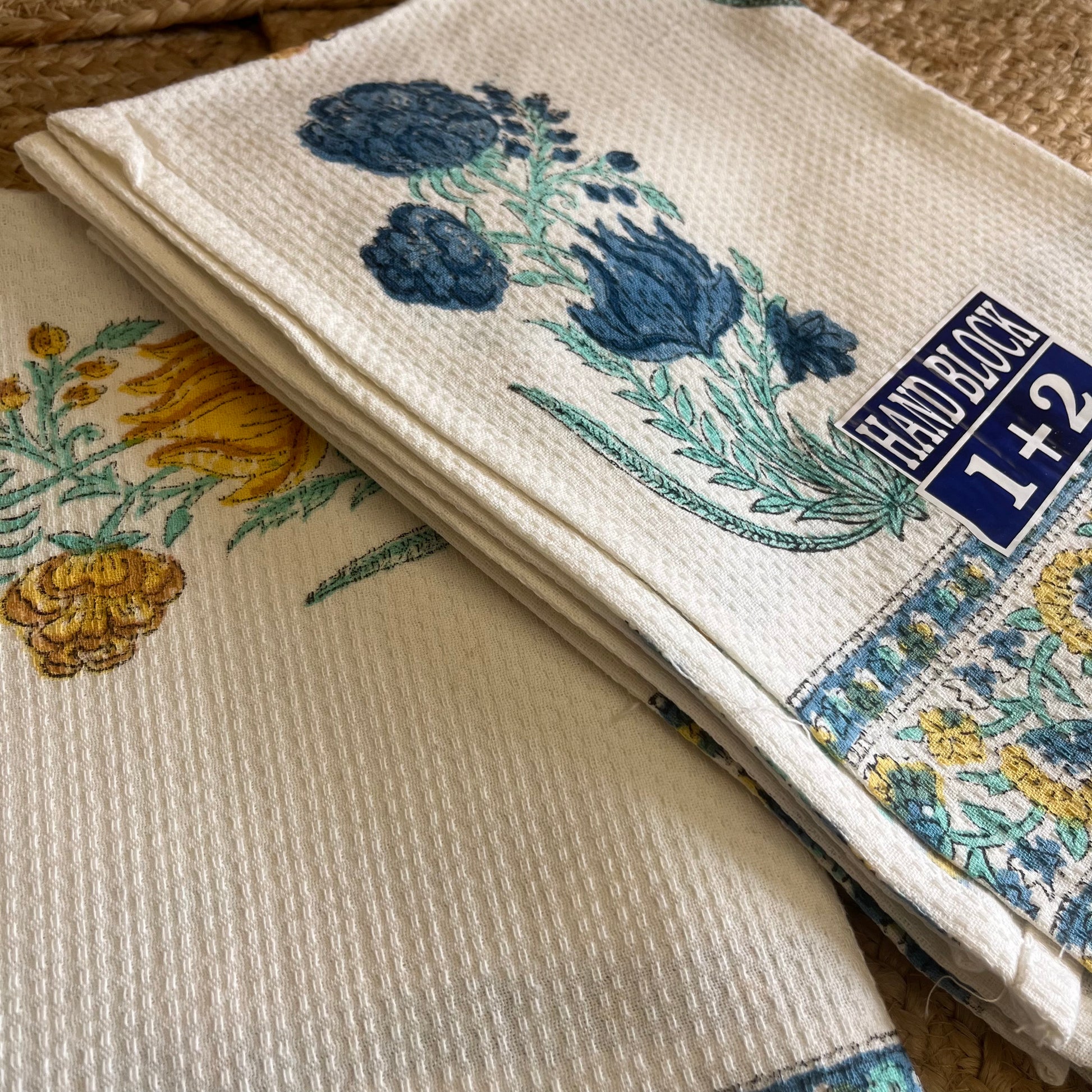 Mustard Yellow and Blue Plant Handblock Waffle Cotton Towel Set