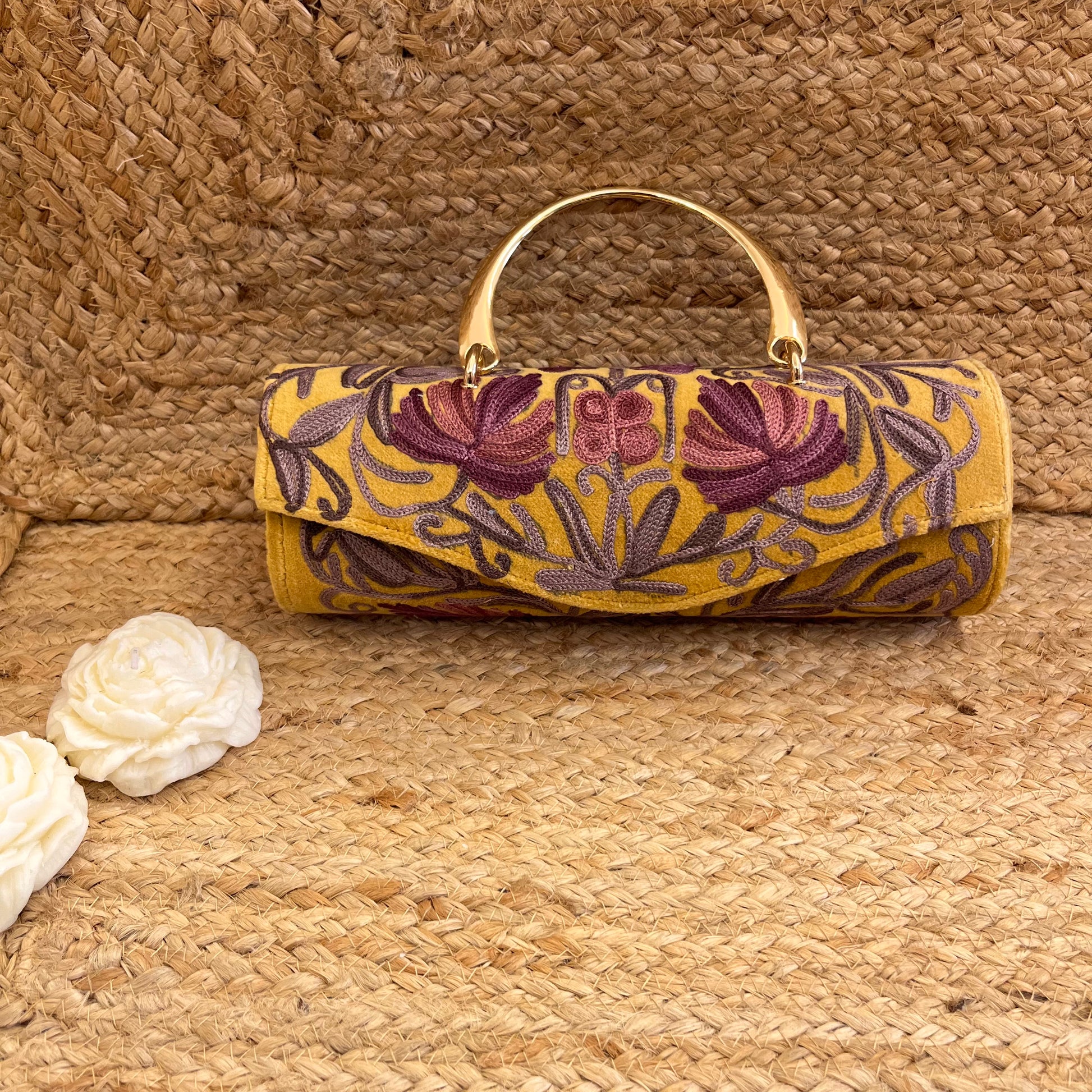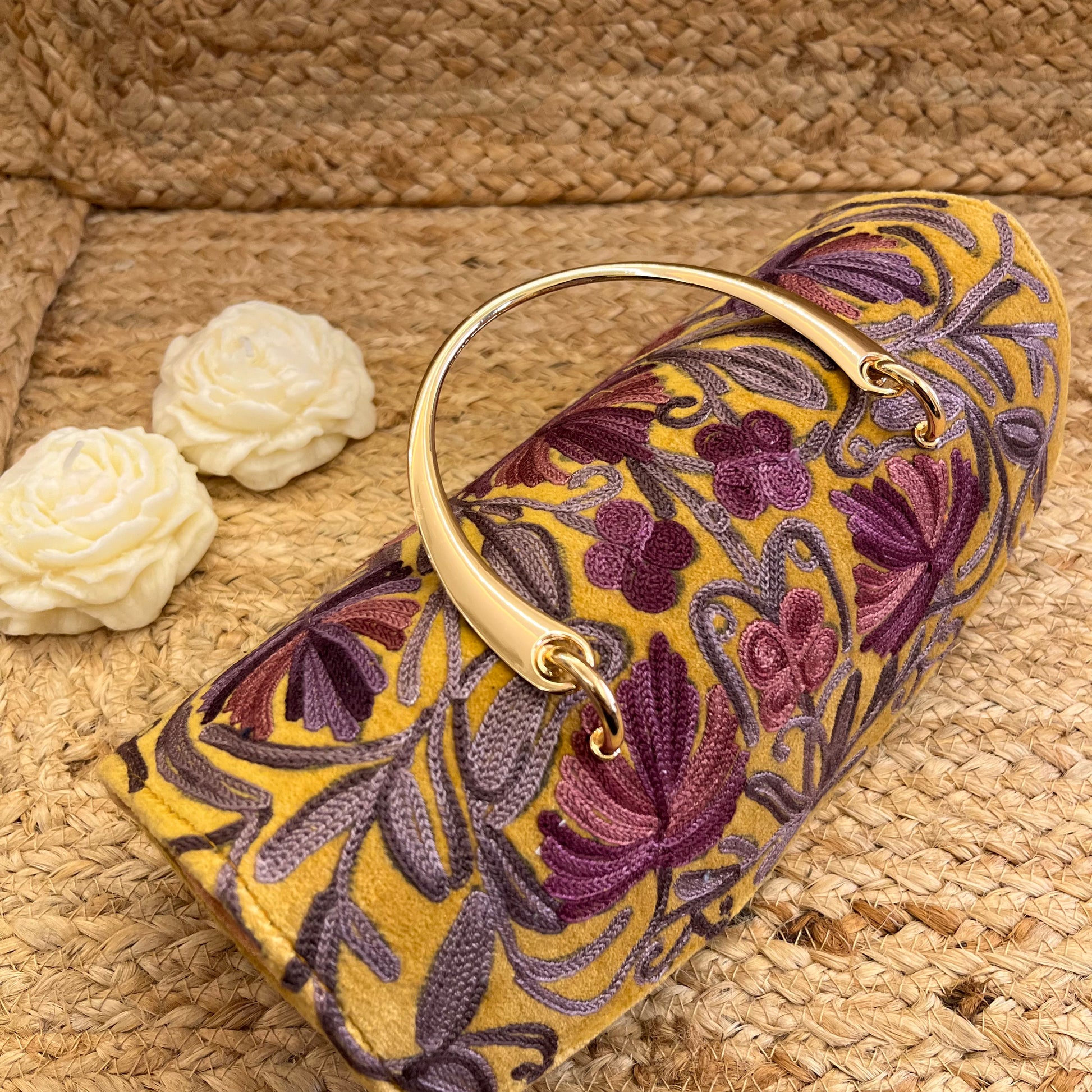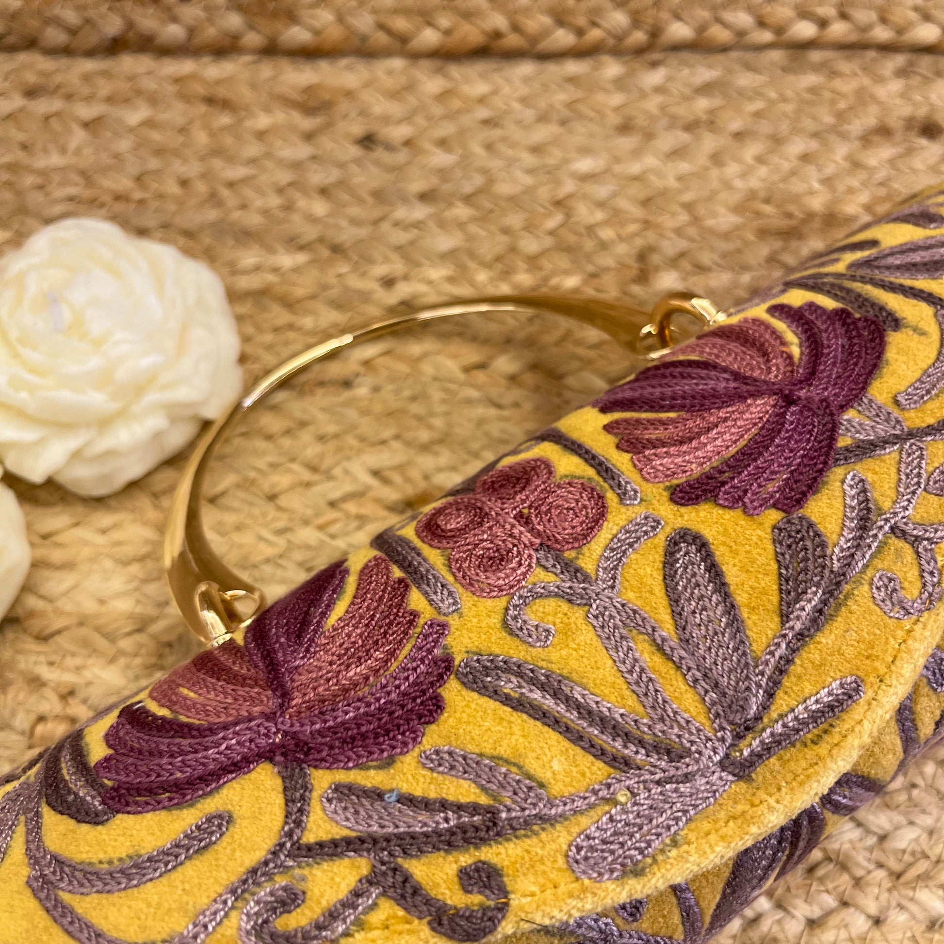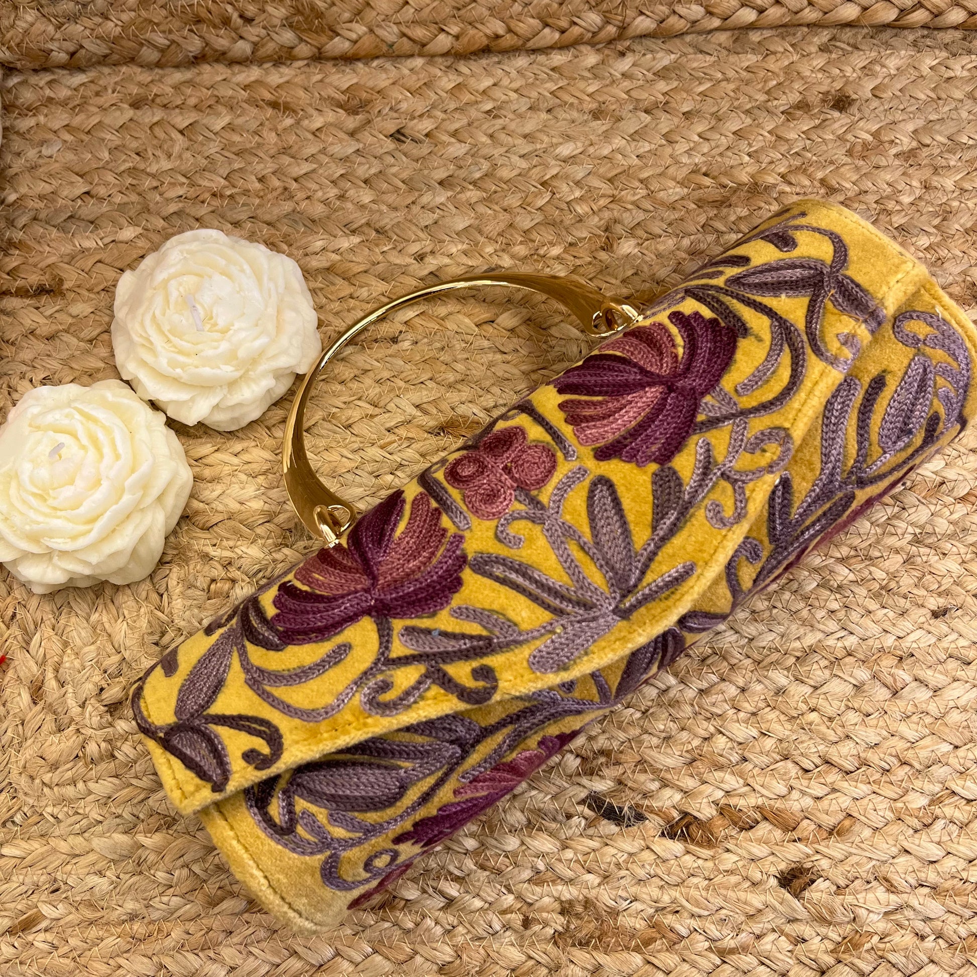 Mustard Yellow Premium Kashmiri Velvet Embroidered Clutch