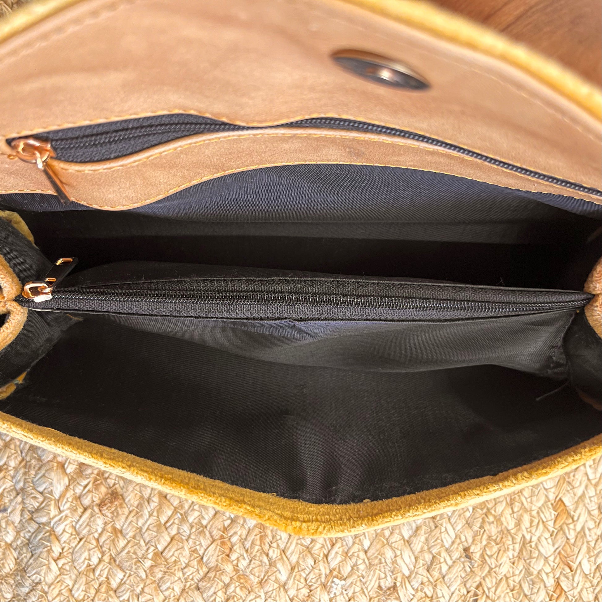 Showcasing intricate hand embroidered designed on velvet fabric with vegan leather interior. This specific design is on Mustard Yellow velvet while the embroidery is of pink, grey and peach thread.